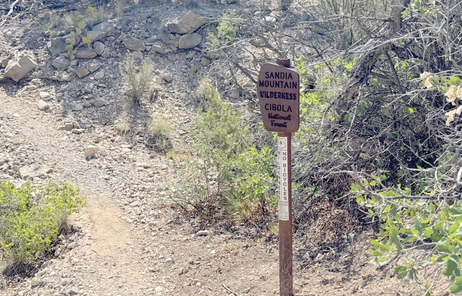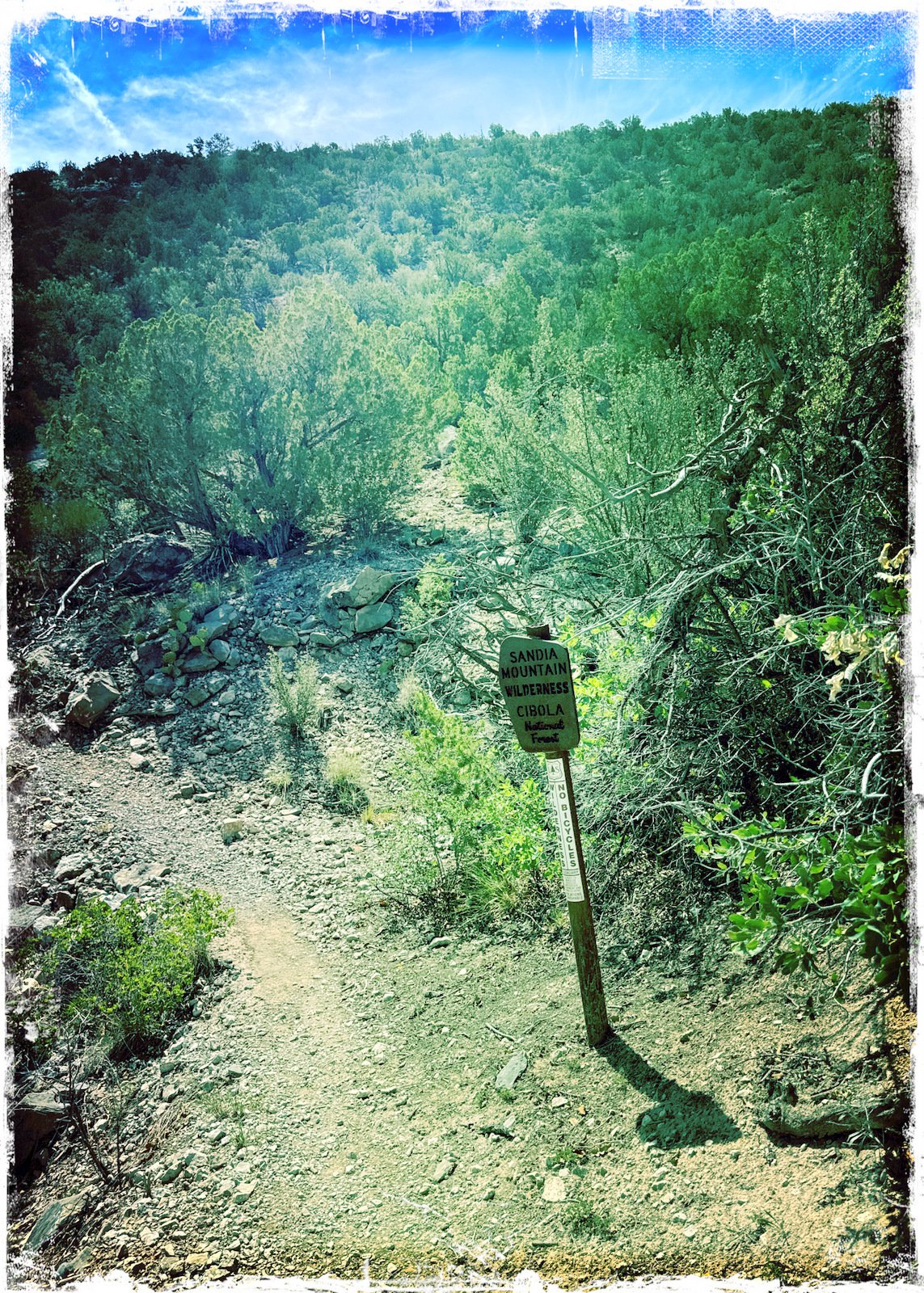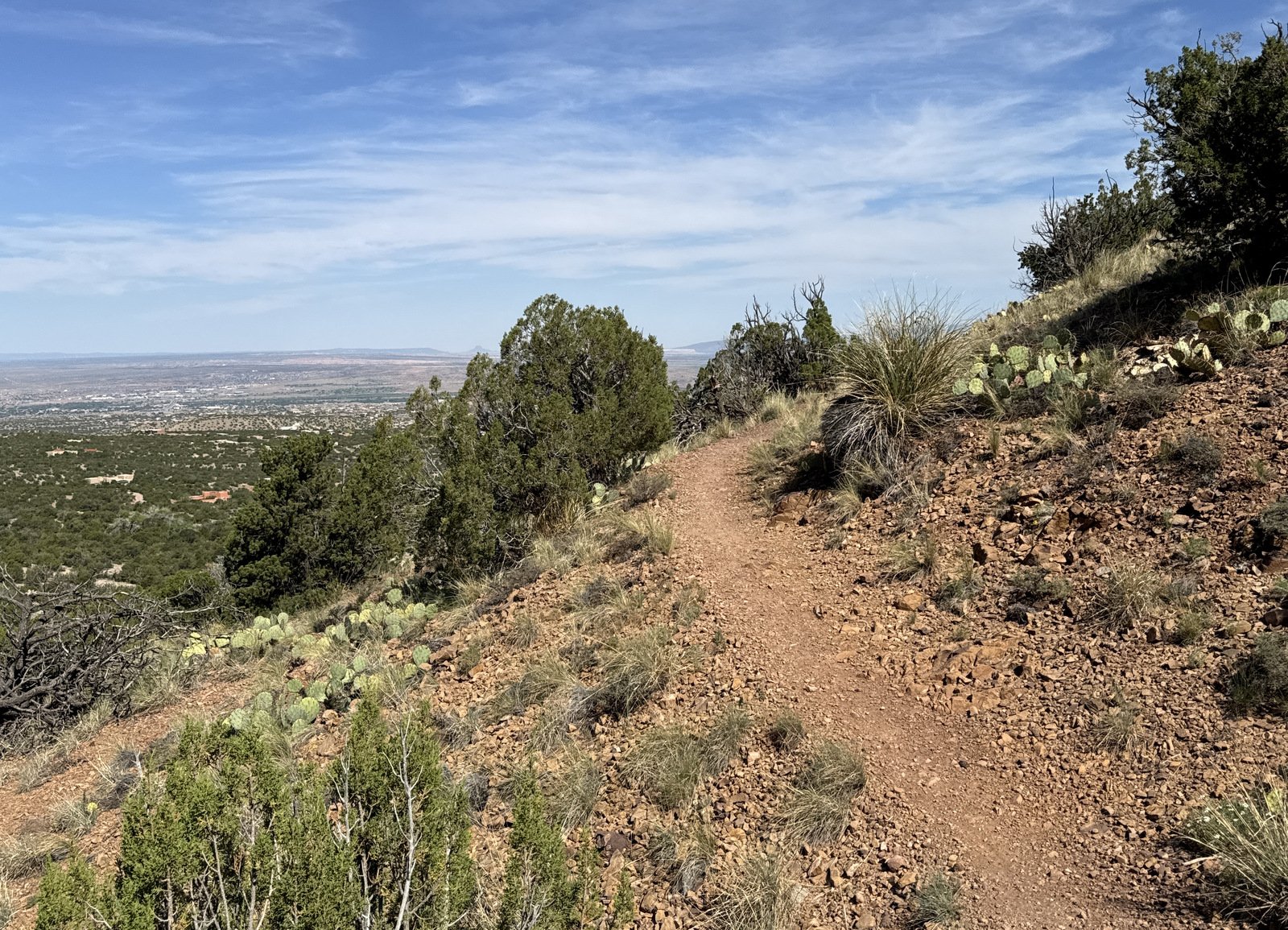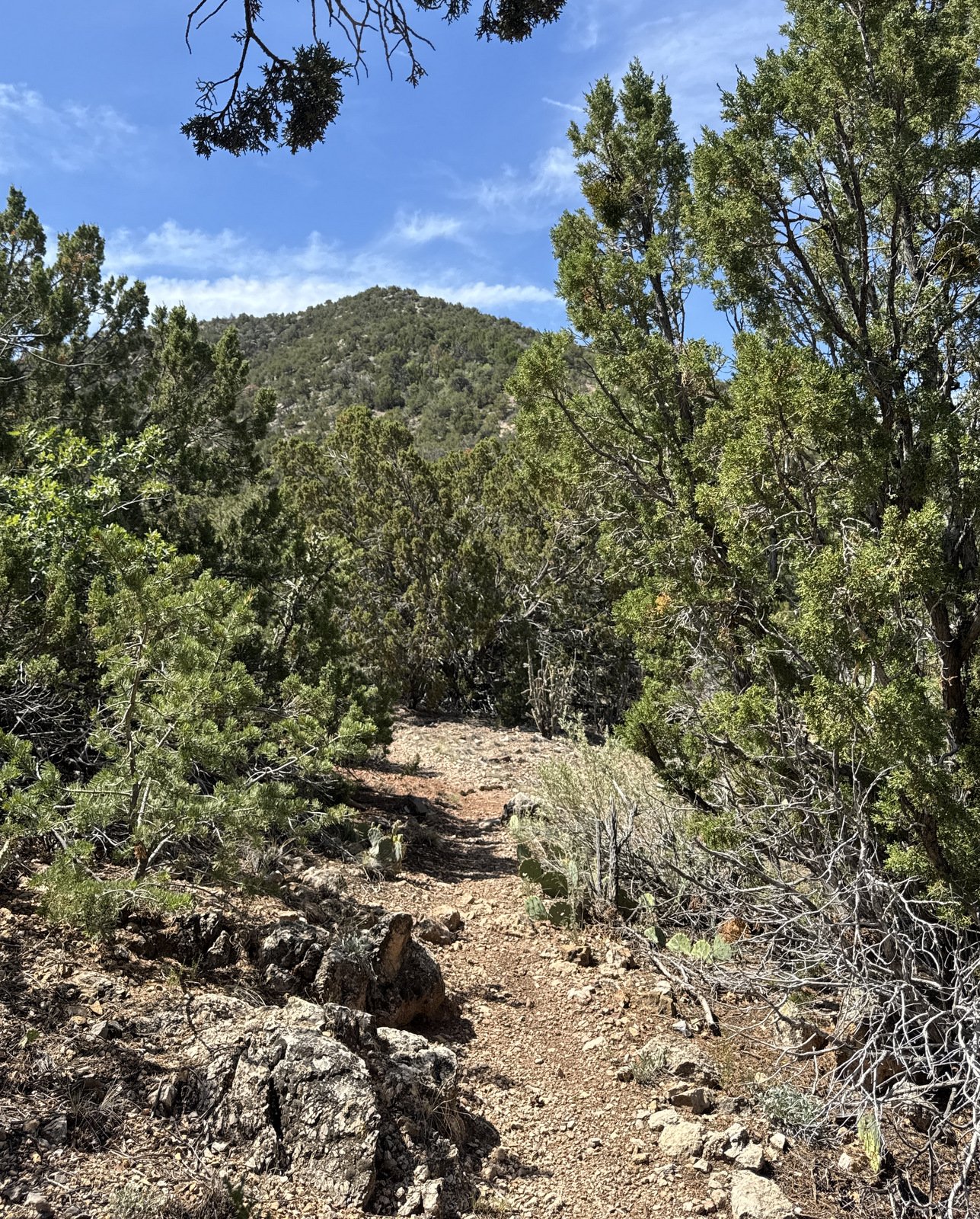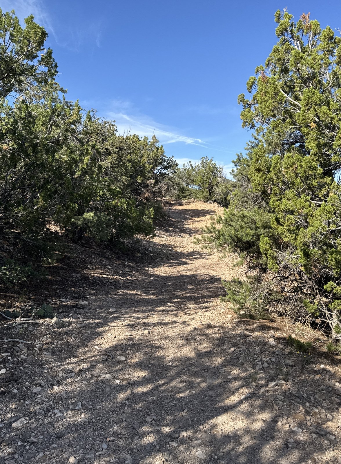 From the parking area, a signboard with a map of trails in the Sandias introduces this trail. Not acquainted with the details, we inadvertently set out on what is the North Crest Trail (a fact that I discovered while writing this BLOG entry).- For the first half mile along this slope of this northeastern corner of the Sandias the trail is quite easy going. Throughout the trail passes through the juniper/piñon “forest” typical at this elevation. Past the half mile point and for the next half mile, the trail makes an easy descent from 6,400 to 6,200 feet, then climbed a bit until we chose to turn back to make our goal of 3 miles total for the day.