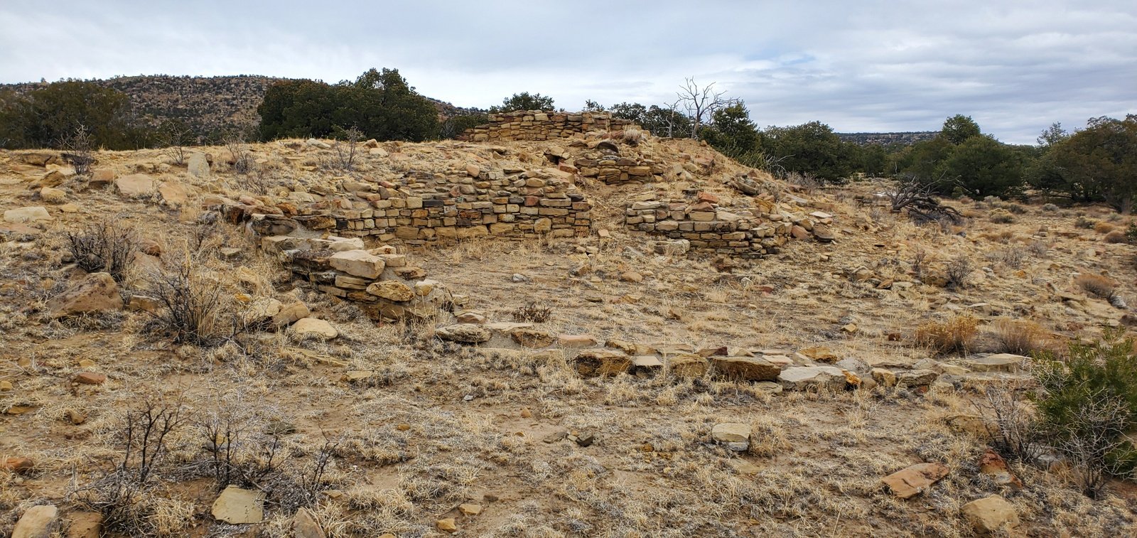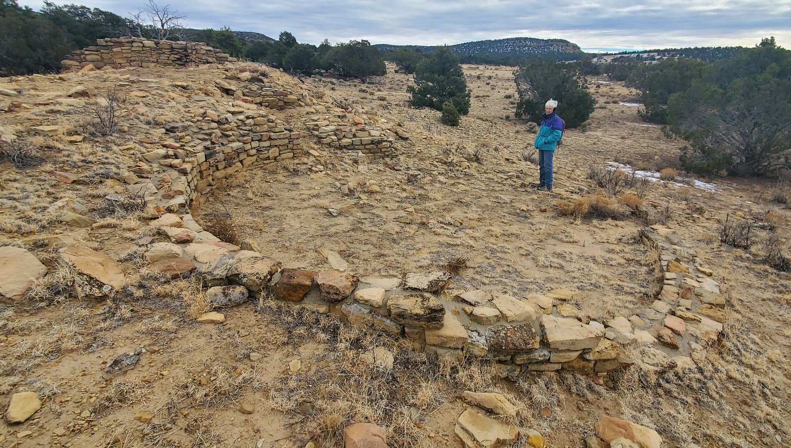 The surface was a bit challenging – tufts/mounds of grass interspersed with soft soil – a trail would be nice to have. Our first point of interest was the Dittert Site, ruins dating from the 1000-1200 era. Situated on a mound, well constructed rock walls have been excavated including a circular enclosure, presumably a kiva.