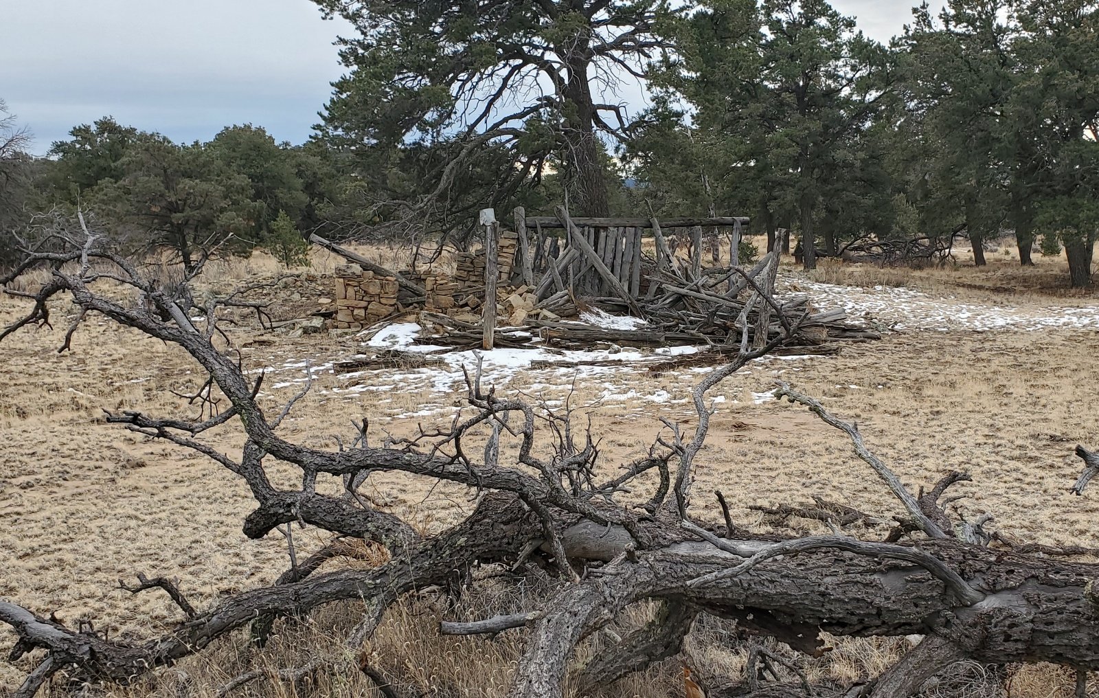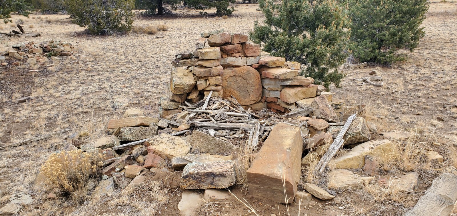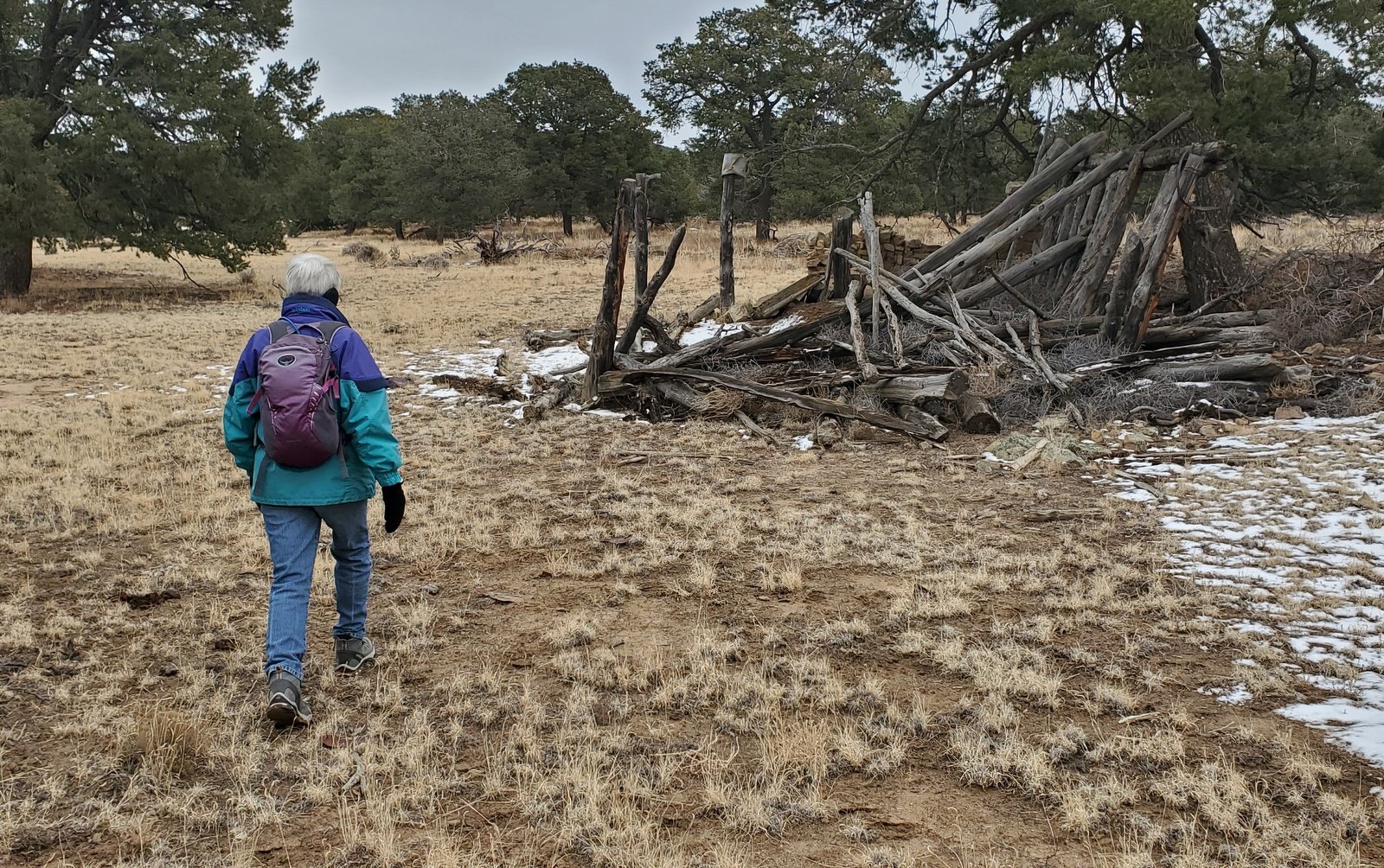 From there we set out on a heading of 95° for the remnants of a ranchstead. About 2/3 of the way there, we encountered another of those deep, steep sided arroyos. In this case, we found a cattle (or game) trail, an easy down and back up onto the other side. Soon we came upon signs of occupancy nearby – pieces of rusted metal, even a tin can. A short distance further along was a collapsed structure of poles (juniper tree trunks) and a rock walled room – it must be a building of the ranchstead along with what appeared to be a fireplace (notice