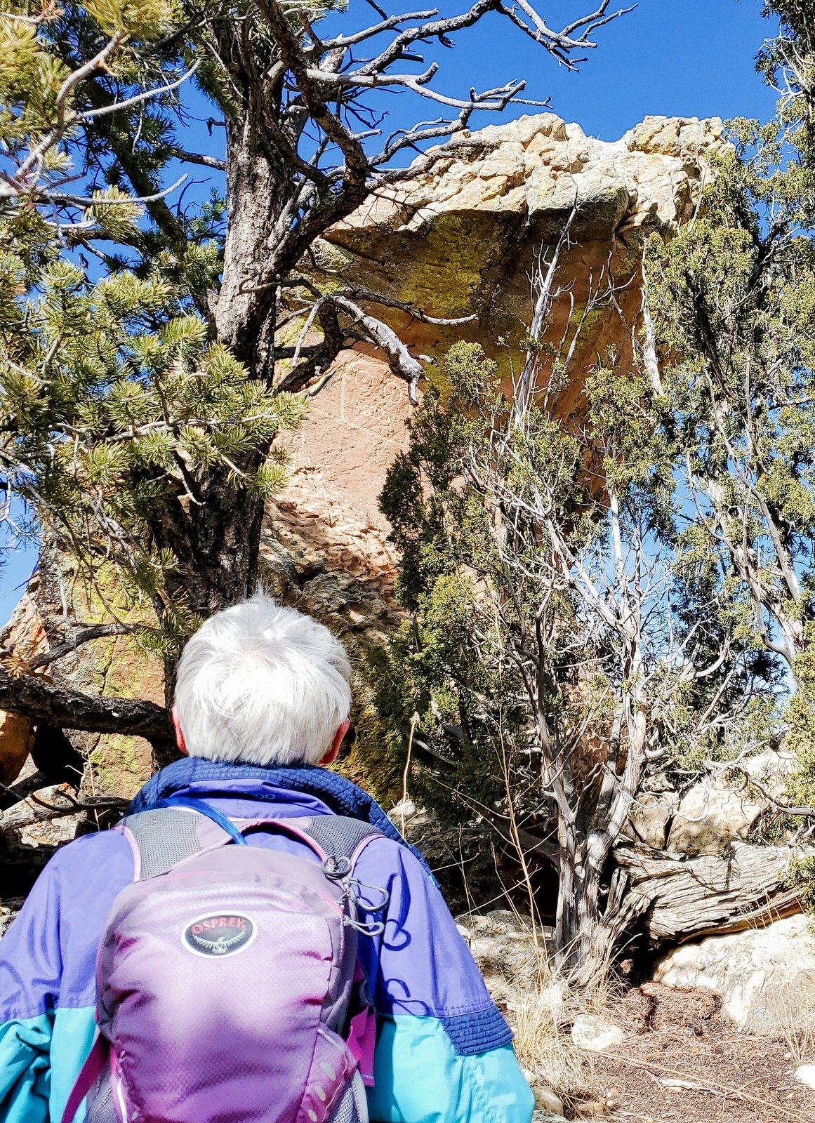 The Armijo Canyon Trail proceeds from the gate up the bottom of Armijo Canyon. We left the gate on a well-used trail, heading northeast on a well used trail; 125 yards on we were faced with a deep arroyo with the typical vertical sides. But from this trail we could enter the arroyo and … climb out the other side. Back on level ground, the trail we anticipated was nowhere to be found. But … I had downloaded the track from ASCHG to USTopo on my phone/GPS, so off we went towards the features of our interest.