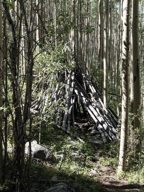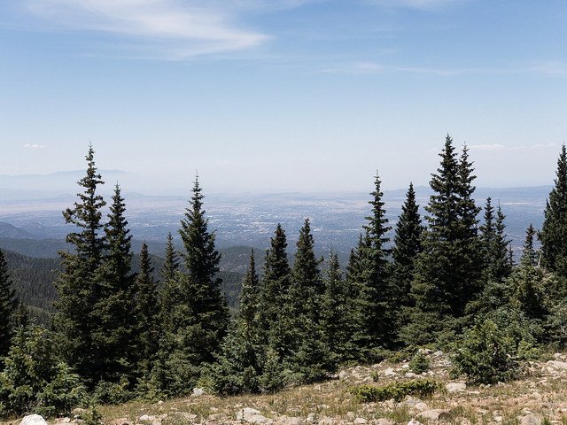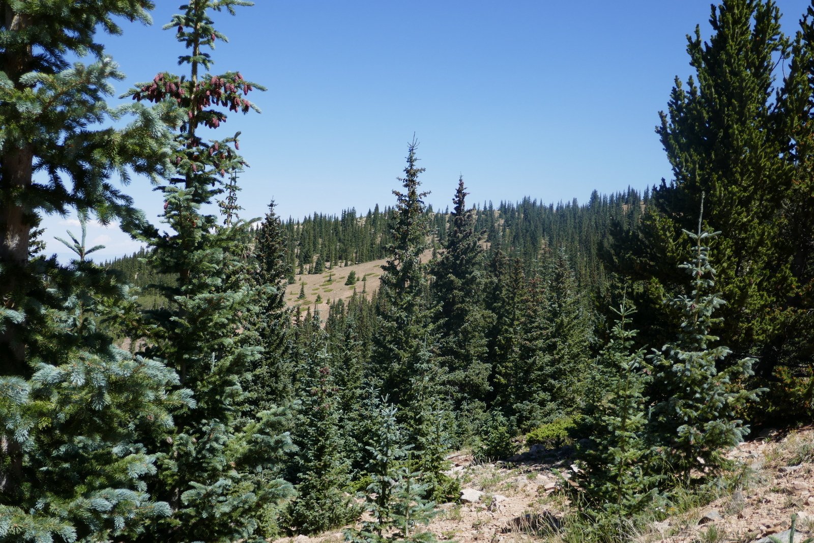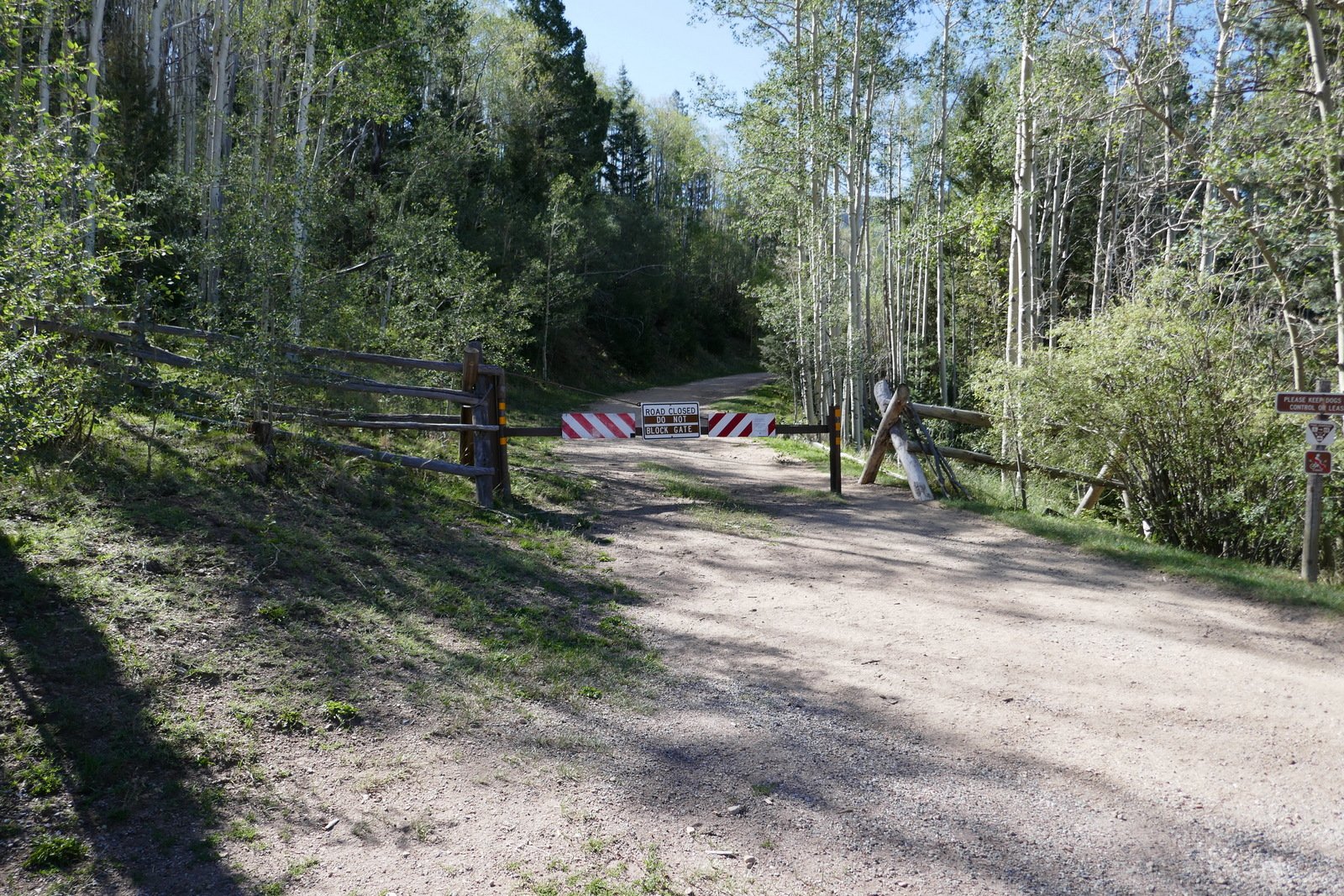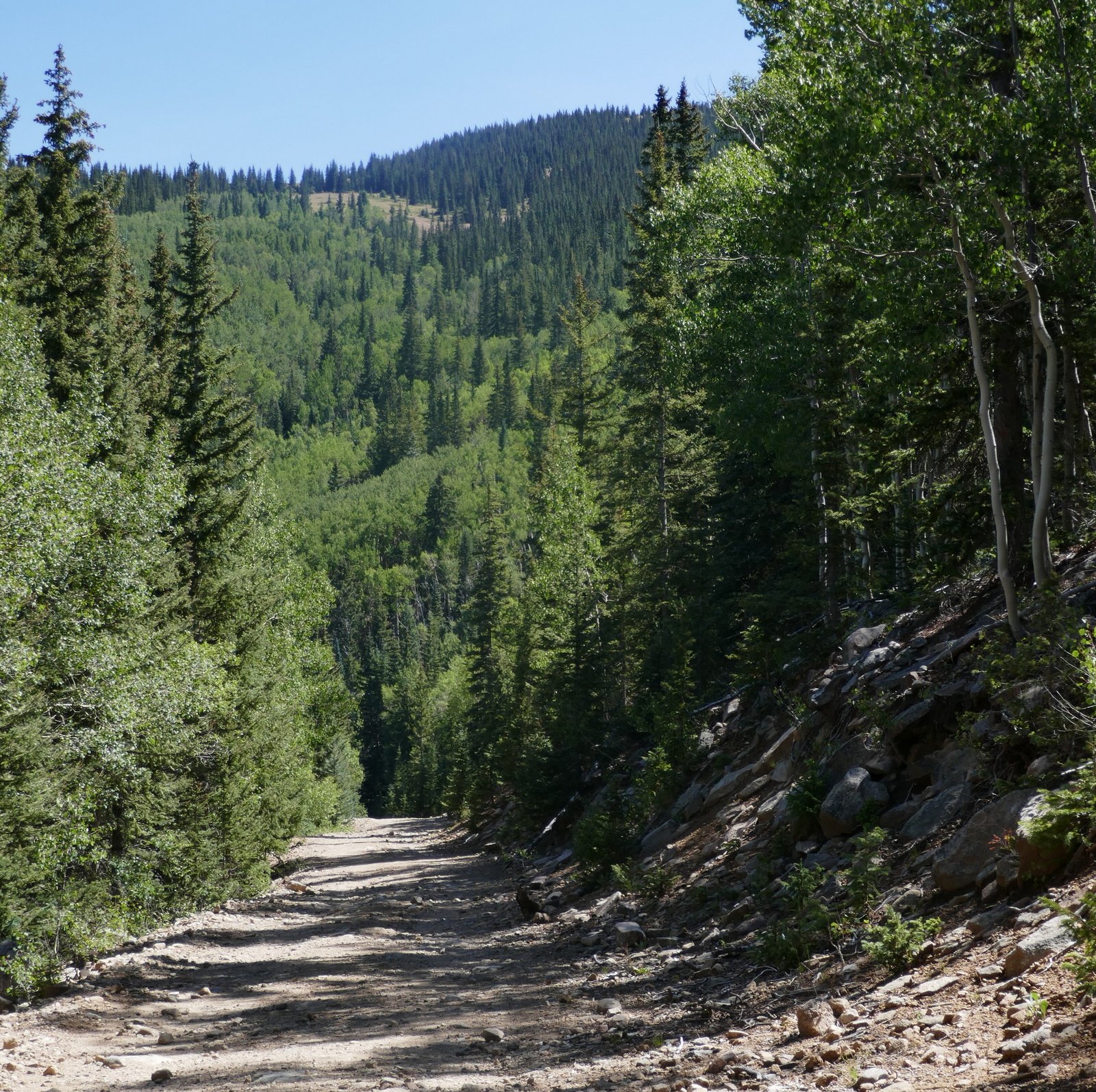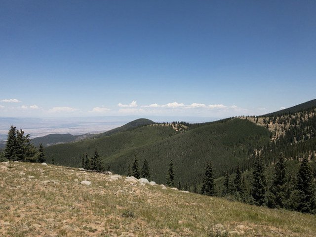 This trail is a well used two track; ‘tho not crowded on this Sunday, we encountered maybe 40 day hikers and a few mountain bikers. We could see why this trail is dubbed “Aspen Vista”; there are very large groves of very tall aspen for about two miles from the trailhead. Then nearing 11,000 feet elevation, the forest becomes primarily douglas fir and spruce. Because of the forest, there are few opportunities for vista views, although on this day smoke and humidity hindered getting a clear picture across Santa Fe, the Rio Grande valley, and to the Jemez mountains. At the top of our hike (half way to the advertised end at the peak above Santa Fe Ski Basin), we did enjoy a more open view from north, west, and south.