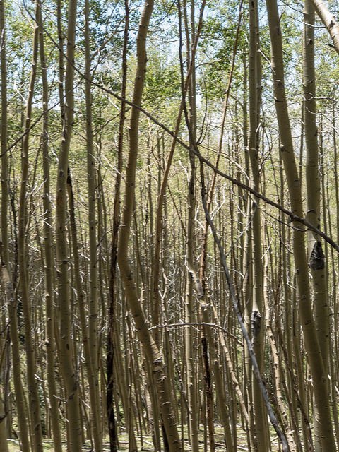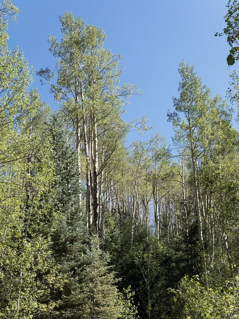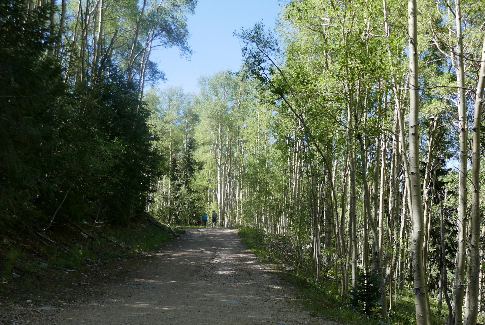 Seeking cooler temperatures, we headed for higher elevation – the Sangre de Christo mountains and the Aspen Vista trail. We began at nearly 10,000 feet; ’tis a steady climb up 3.4 miles to 11,300 feet. Air temperature was much cooler than in Albuquerque or even Santa Fe (well above 90 there); more like upper 70s on top (‘tho we descended into warmer temperatures, finishing the hike mid-afternoon).