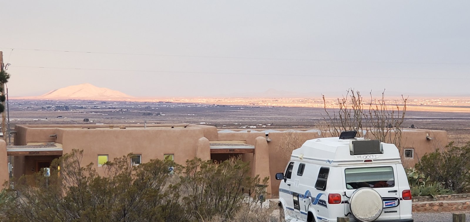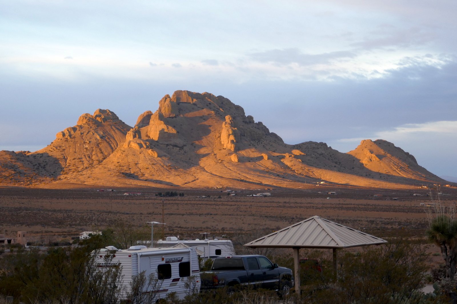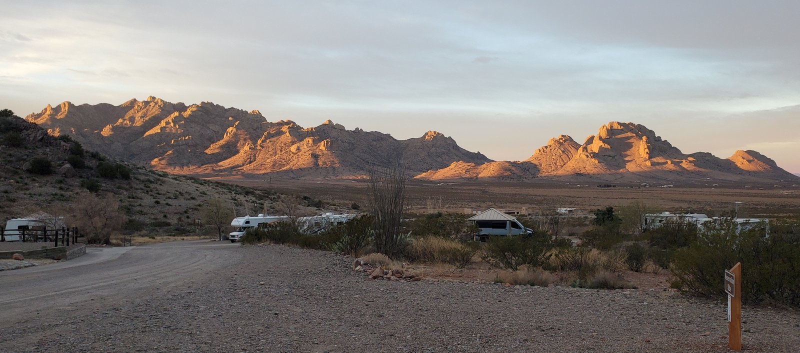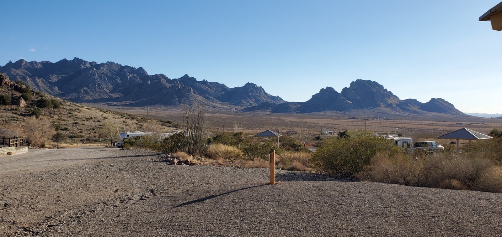 ‘Tis 331 miles from Albuquerque, almost a six hour drive with our R-Pod camper/trailer. Campsites at our destination, Cave Creek (Sunny Flat and Stewart) are first-come-first-serve, and we had been advised to be there soon after noon when people would be leaving. So we took 2 days, spending the first night at the Rockhound State Park south of Deming. This is a dandy campground with large site pads (with full hookups), each separated from nicely for the others, and offering great views of the Little Florida Mountain range to the east and across the plains to the west. Sites are by reservation and we were fortunate to get a nice site for Saturday night.