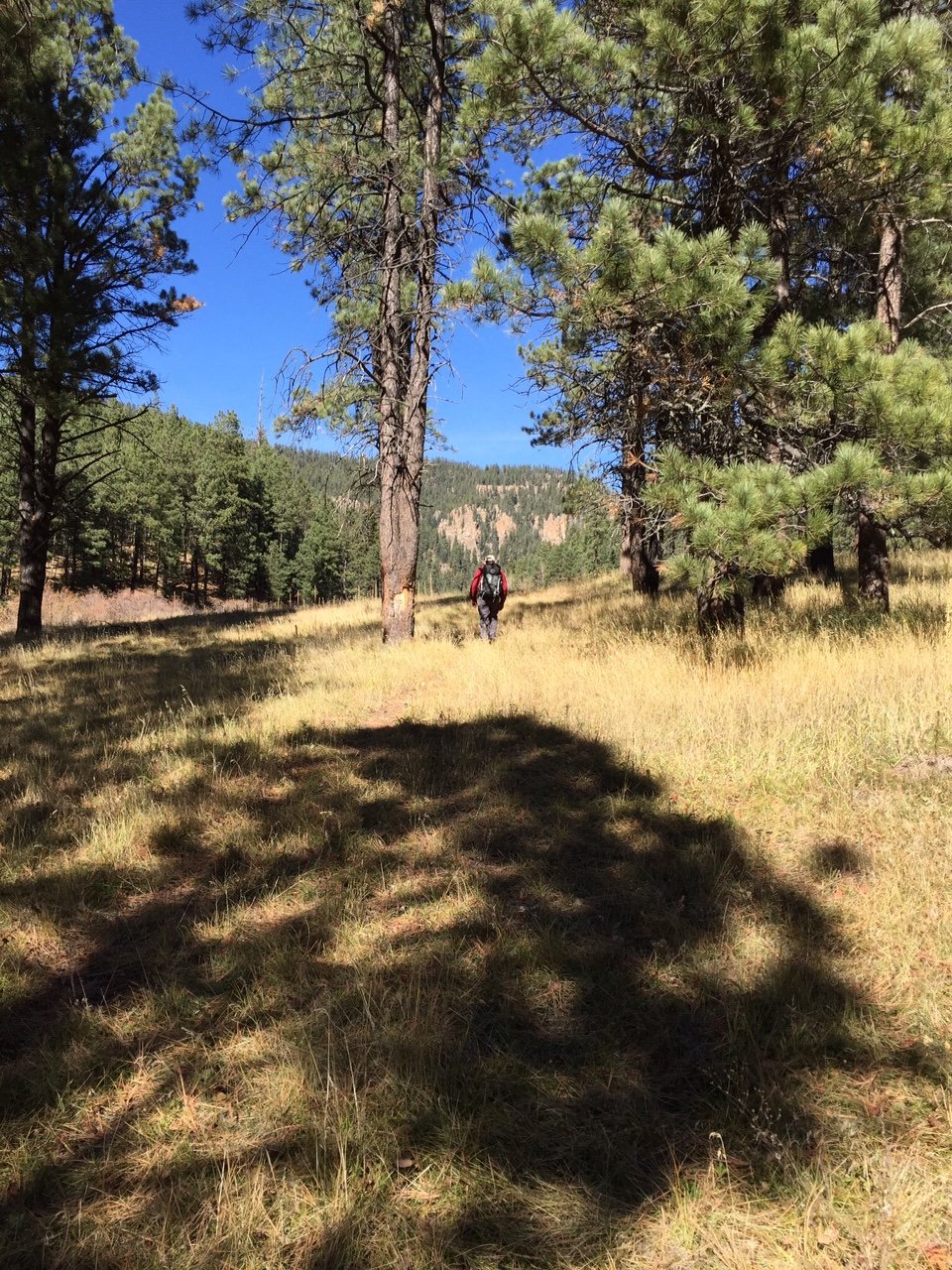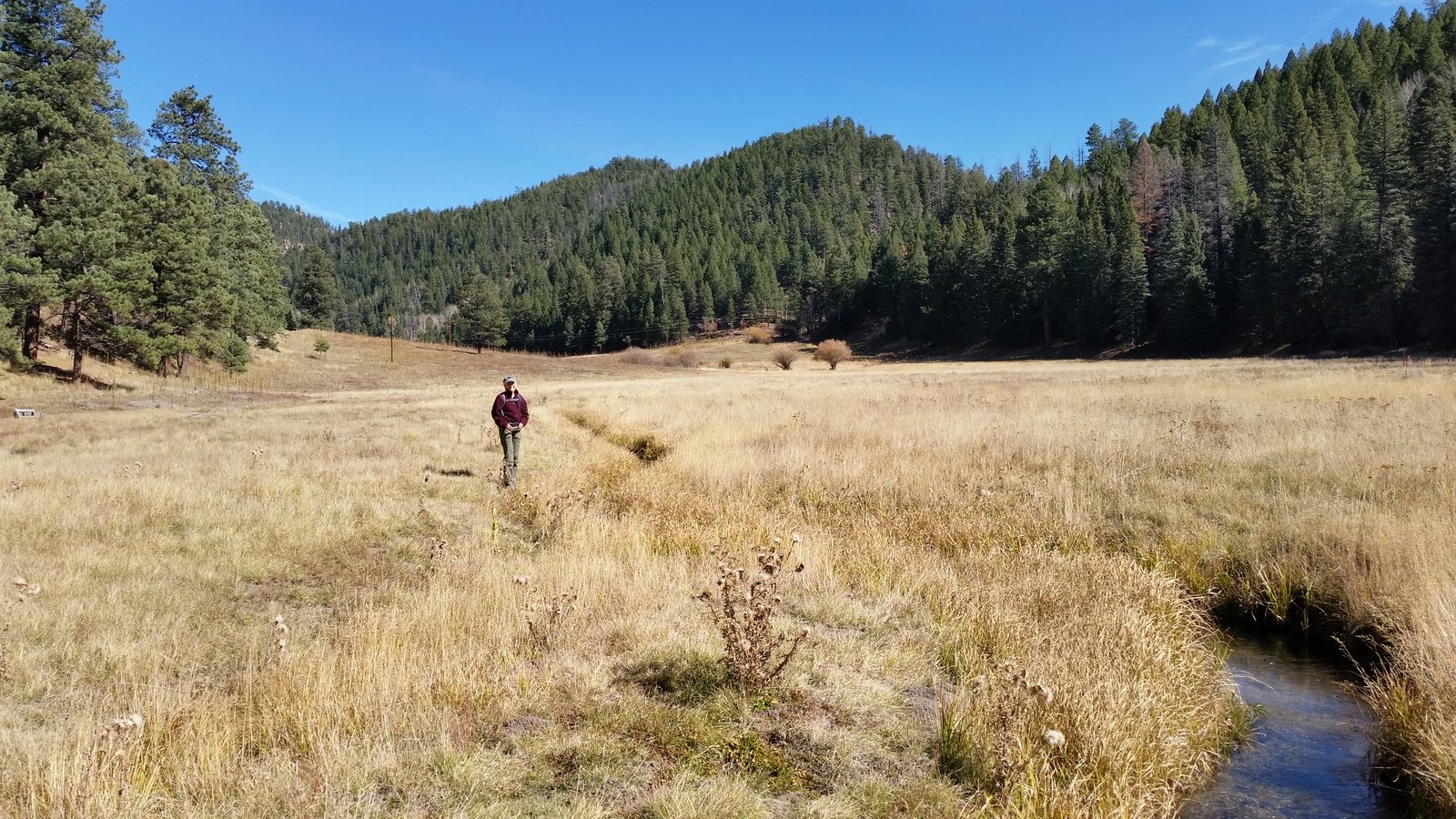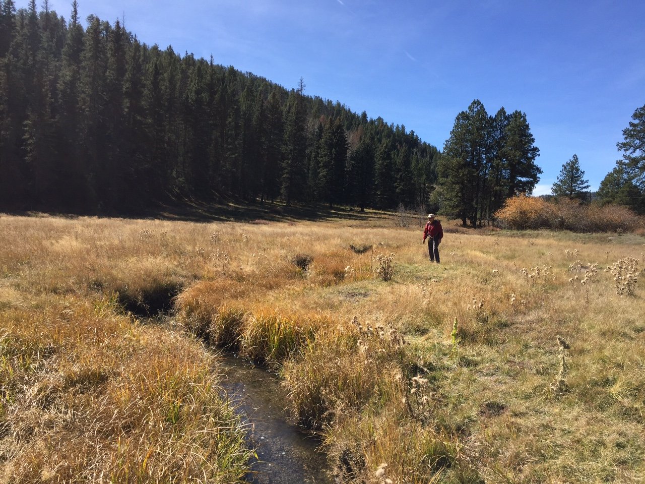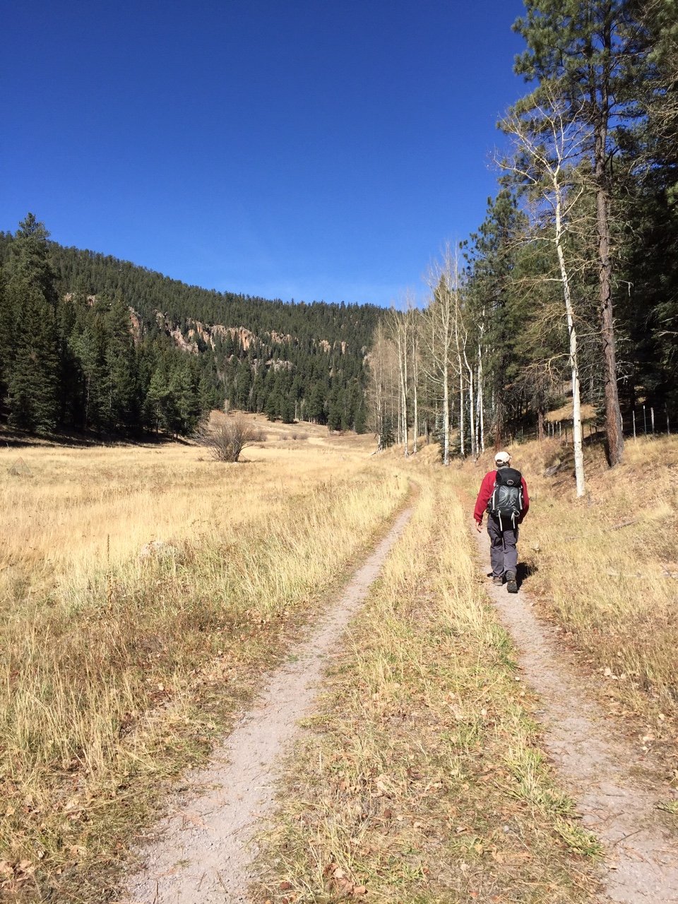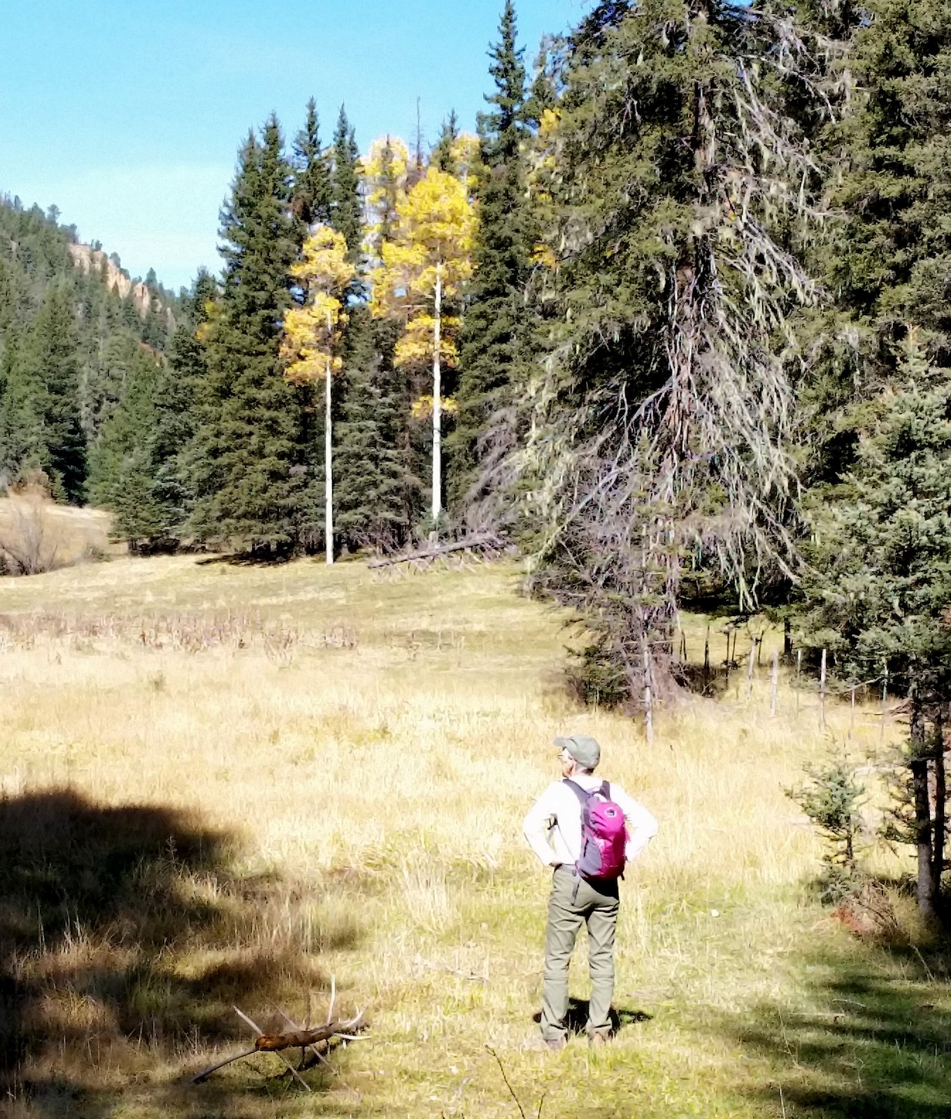 Cebolla Canyon, the site of my first foray into the Jemez Mountains, with Jay in 2014. And subsequently on the Oat-Hay Canyons hike. It is a beautiful canyon with the Rio Cebolla stream running through it. ‘Tis a perfect setting for an autumn hike with Pat.