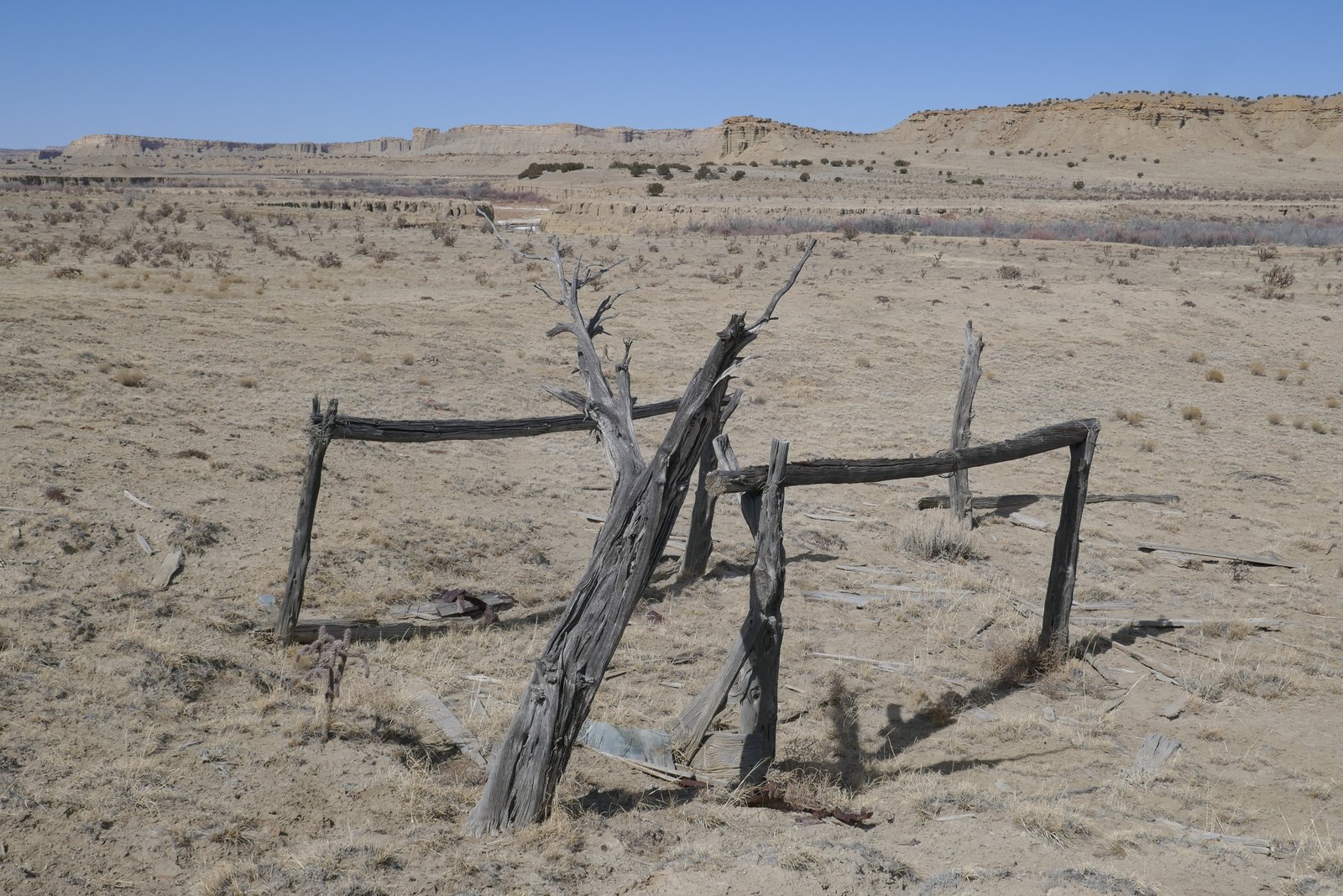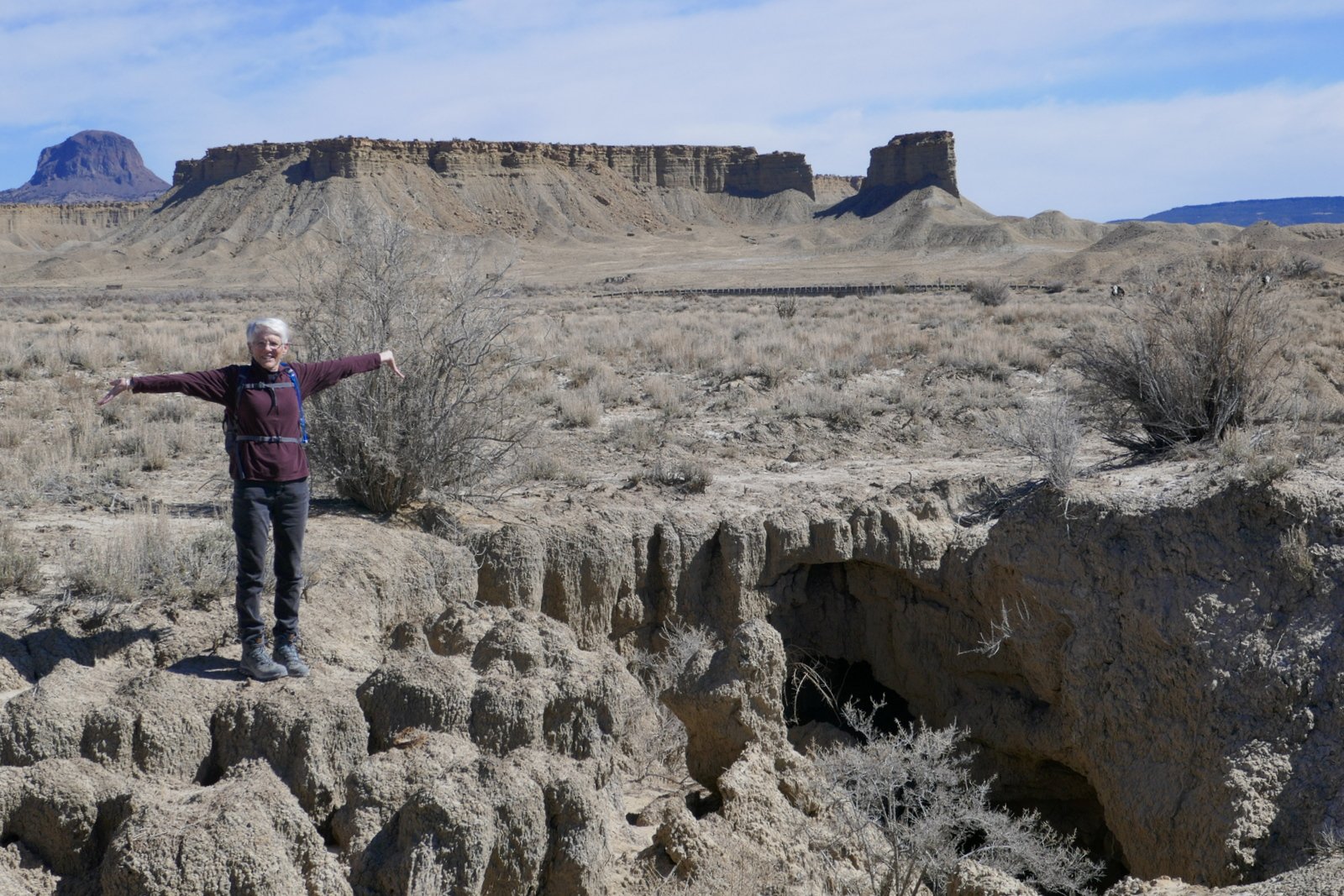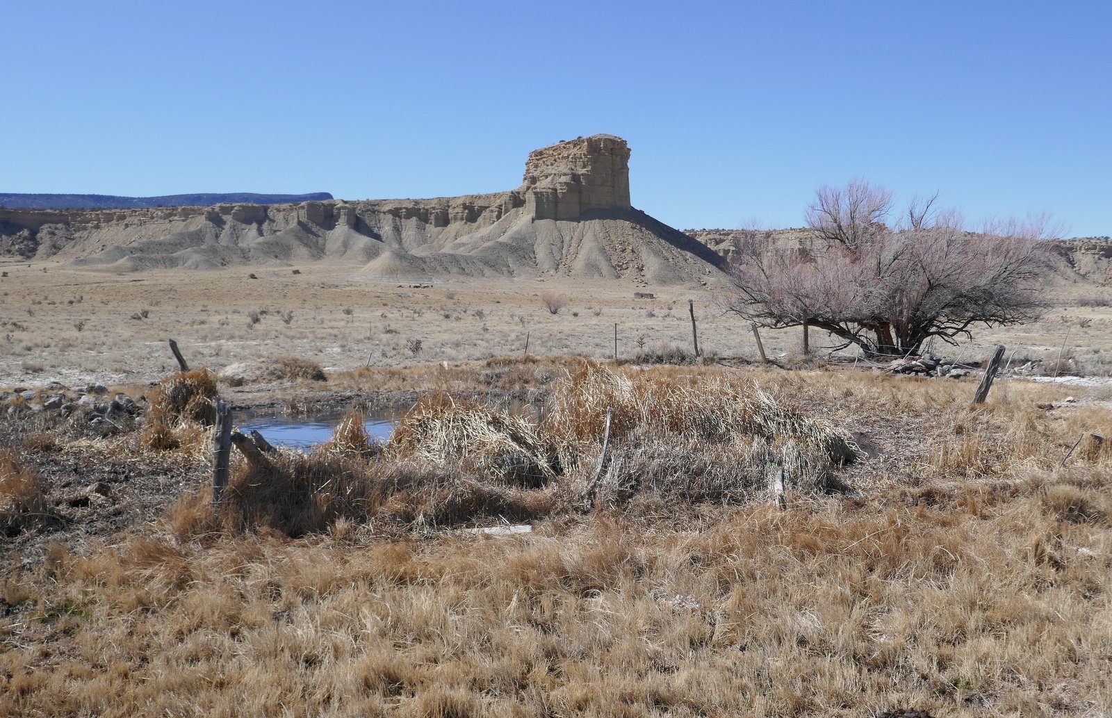 We identified another two-track further along NM 279. Again about a quarter of a mile in we encountered a sign: “No Trespassing”; we turned around. Halfway back to NM 279 we were met by another rancher. During a most pleasant conversation we explained our goal and that we had honored the sign. He told us we were welcome to go further but that we would come to the end of the two-track in a mile or less. Having told him we were planning to hike from there, he advised us that we might find it difficult to cross the arroyo. (In the Rio Puerco, these arroyos are channels cut in the soft clay soil, 10 or more feet deep with sheer vertical sides, and often going for many hundreds of yards without a route to cross.) He did add that another two-track, just beyond the –third cattle guard– back on NM 279, might permit us to get closer to Cerro Cuate. We decided to check it out on another day.