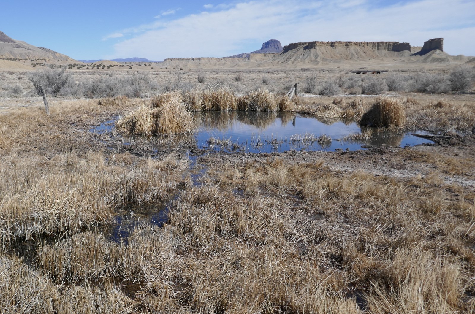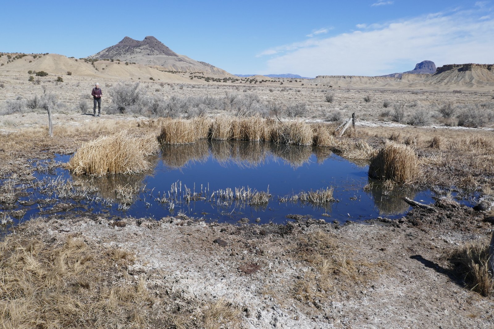 Nearing the placemark we discovered that the feature is a spring. It is some 50 feet across with surrounded by reeds (and a few of the tamarisk, an invasive shrub/tree that is present wherever the is some water). The water was quite clear, and there was a small stream flowing from it.