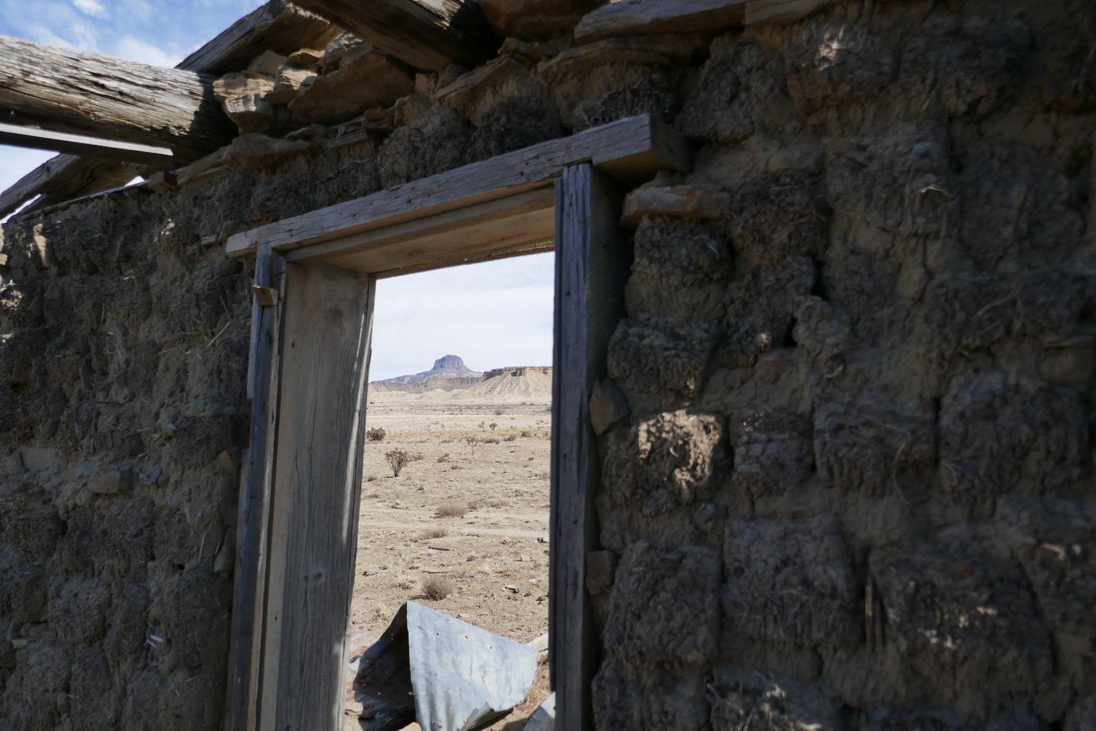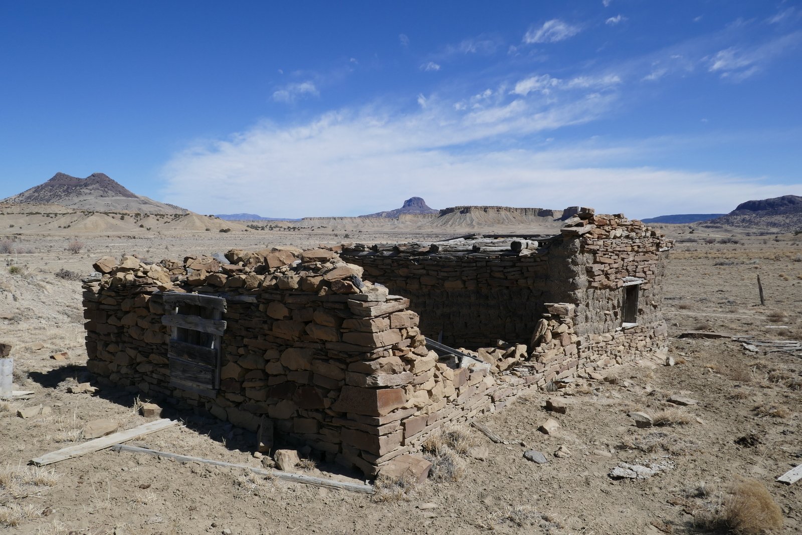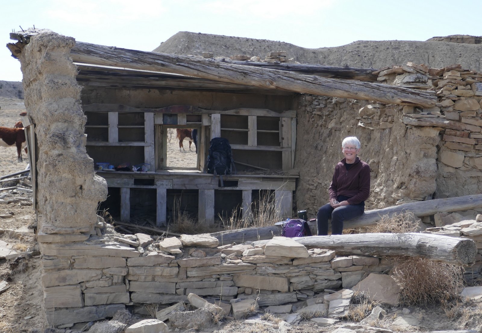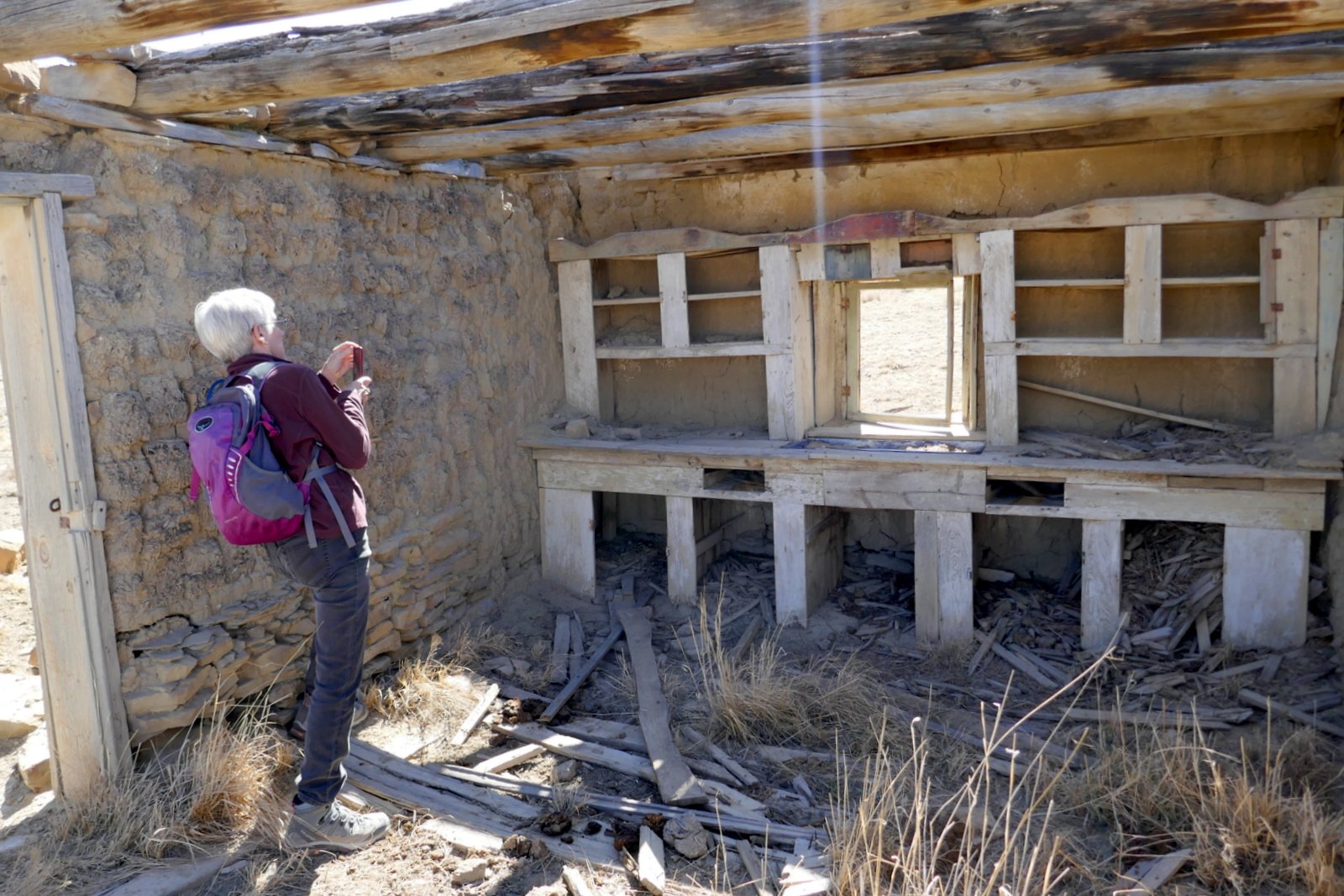 On the way to the spring, we had noticed what appeared to be a small man-made structure closer to mesa ahead of us. To satisfy our curiosity, we continued on to find that it is a small rock structure, some walls collapsed; some doors, windows, and some of the roof beams still in place; and .. kitchen cabinets. Hhmm, a kitchen .. it looked like a good place for our mid-afternoon break.
