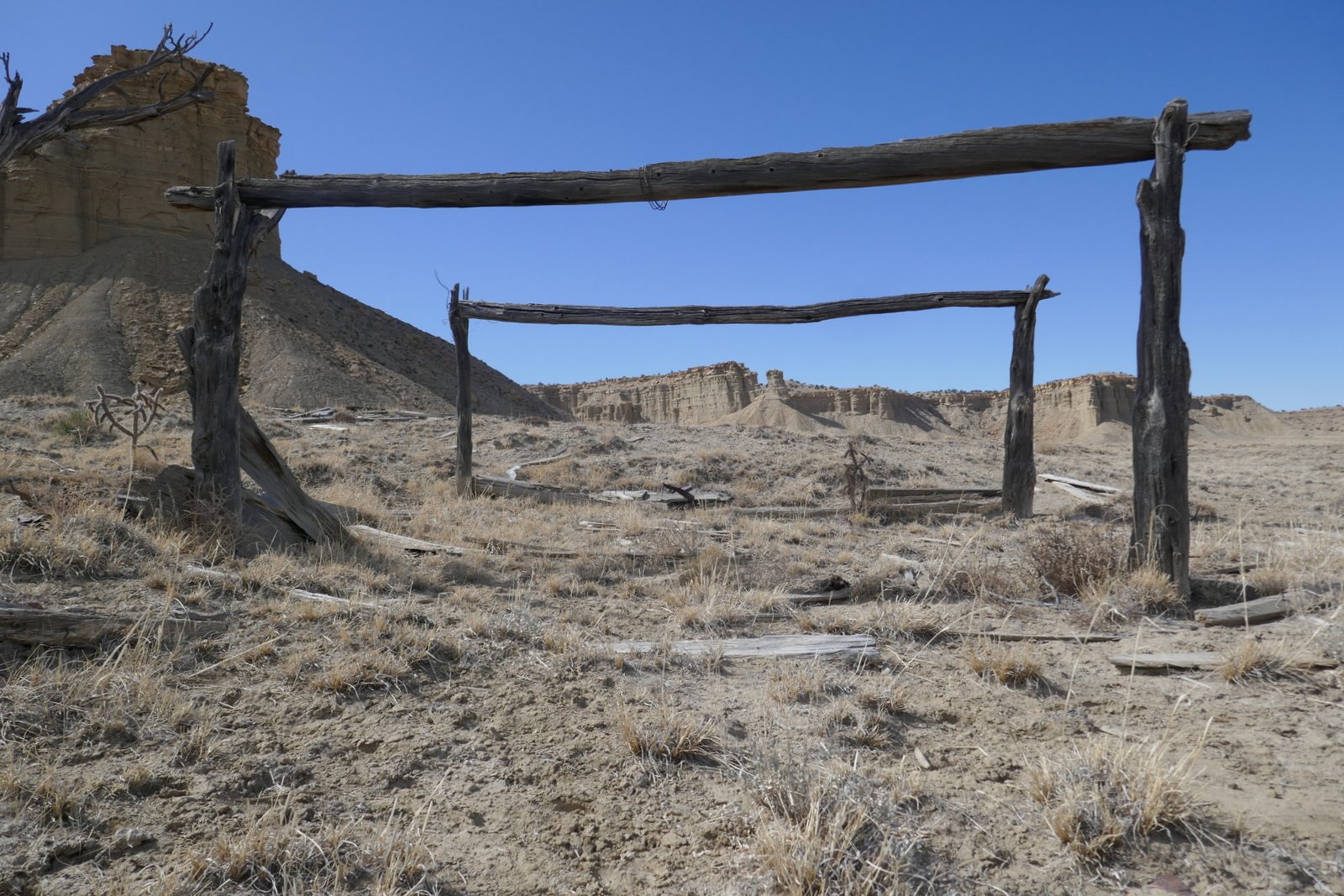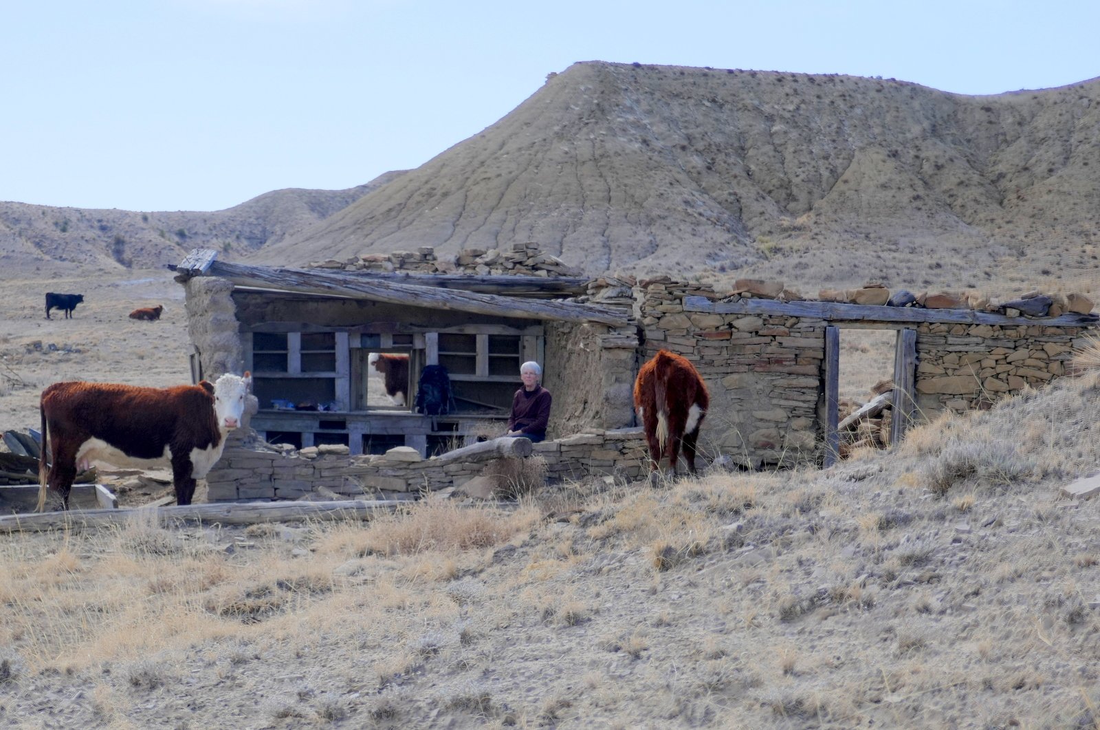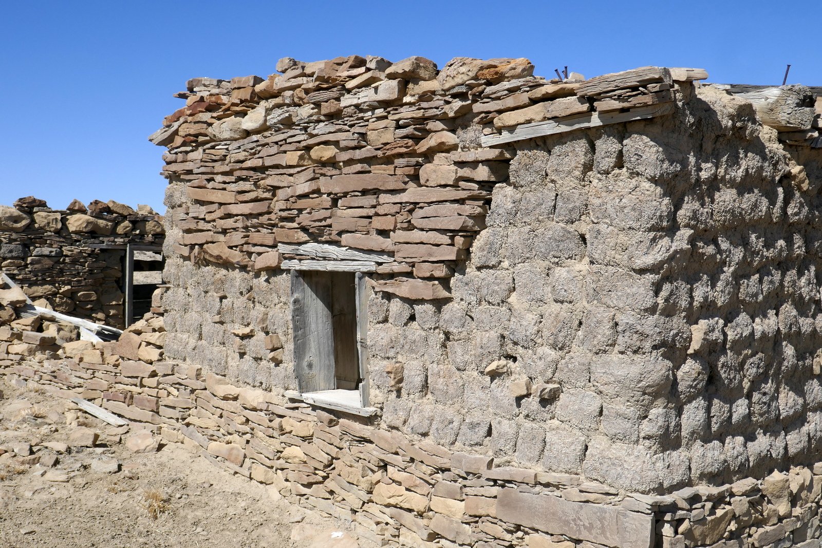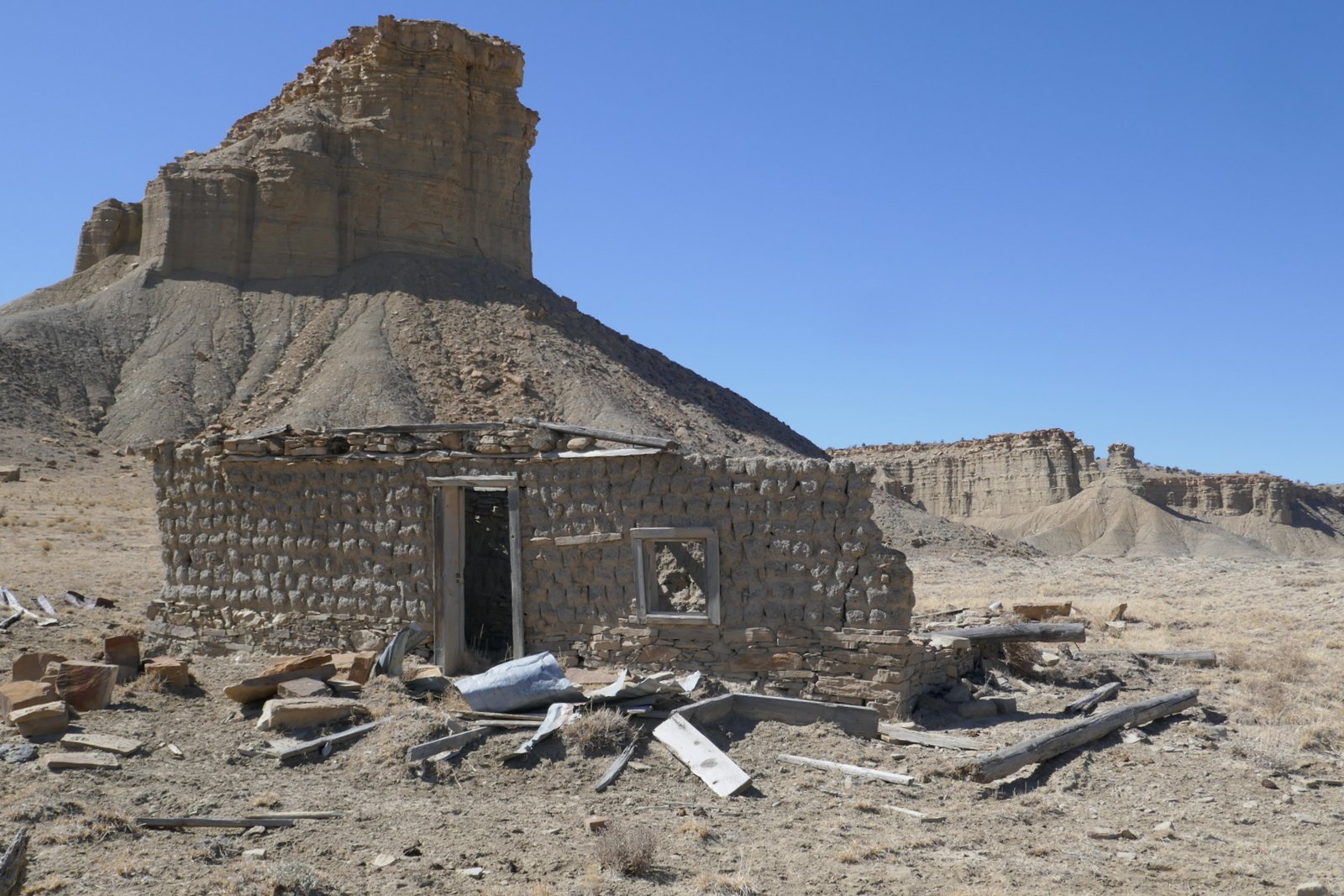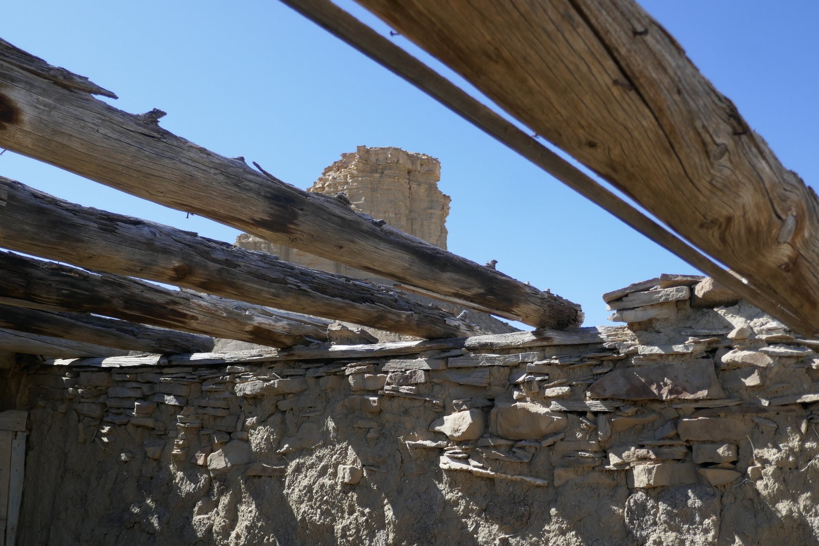 On the way to the spring, we had noticed what appeared to be a small man-made structure closer to mesa ahead of us. To satisfy our curiosity, we continued on to find that it is a small rock structure, some walls collapsed; some doors, windows, and some of the roof beams still in place; and .. kitchen cabinets. Hhmm, a kitchen .. it looked like a good place for our mid-afternoon break.
