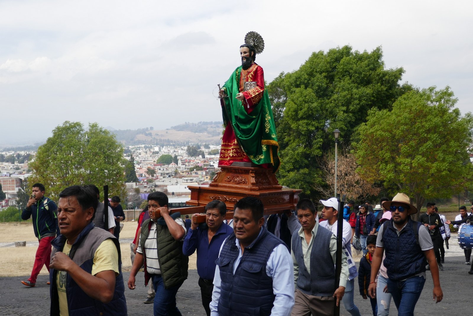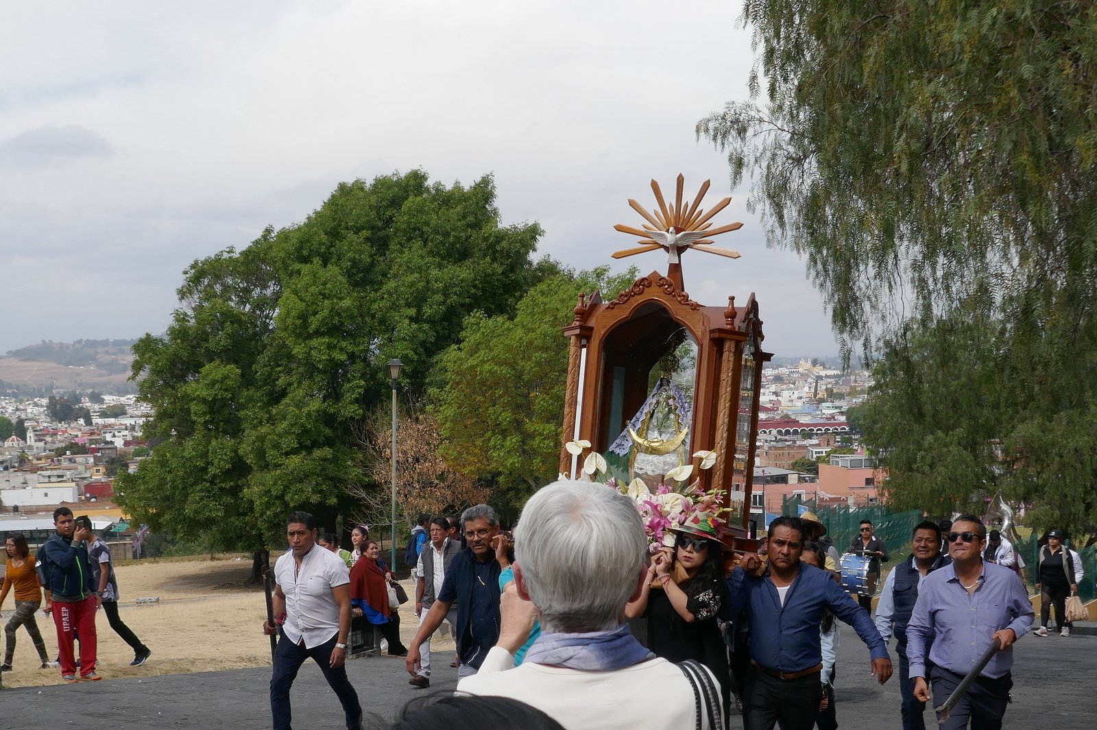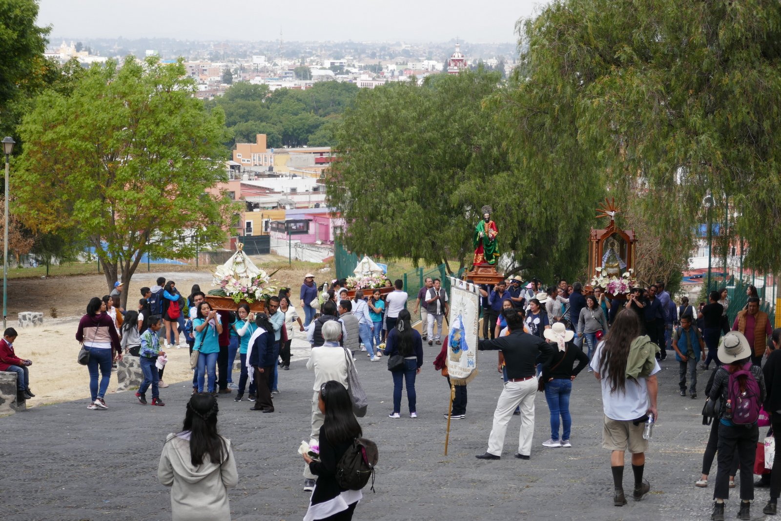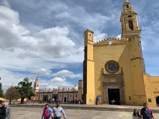 During our walkabout we enjoyed a lunch in a local cafe, visited the church Parroquia de San Andrés Apóstol, then visited the Great Pyramid and Iglesia de Nuestra Señora. As part of the visit to Iglesia de Nuestra Señora we toured the interior including the tunnels beneath the church which were part of the pyramid build by the Aztecs. While at the Great Pyramid we happened to come across a procession bringing one of their saints up to the church – truly a treat for our visit. From there we found our way to Cholula’s Zocalo and toured the grounds of the San Gabriel Franciscan Convent including the huge Capilla Real. We finished the day by walking through a market area near the Zocalo. Then another Uber ride back to Puebla