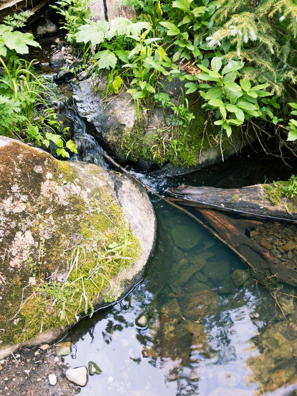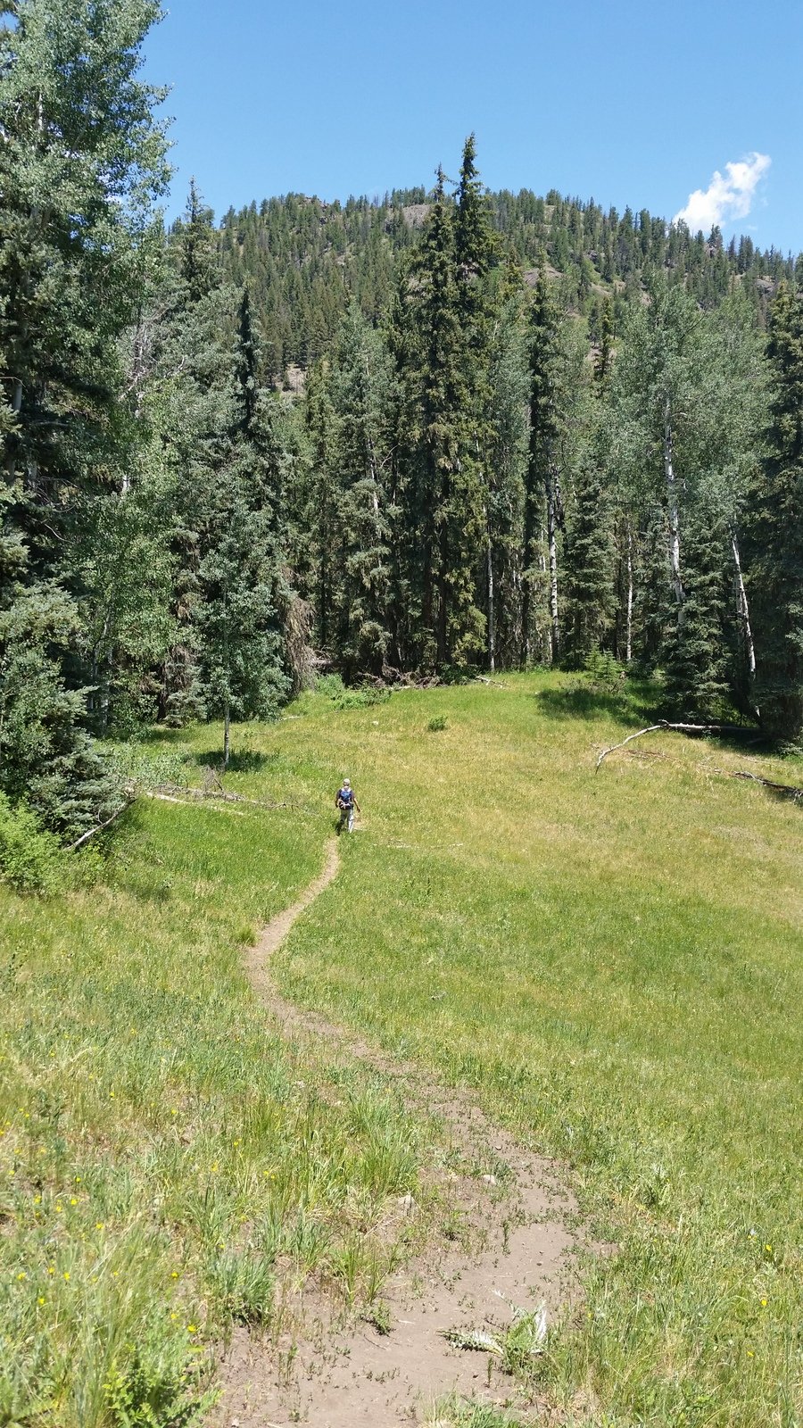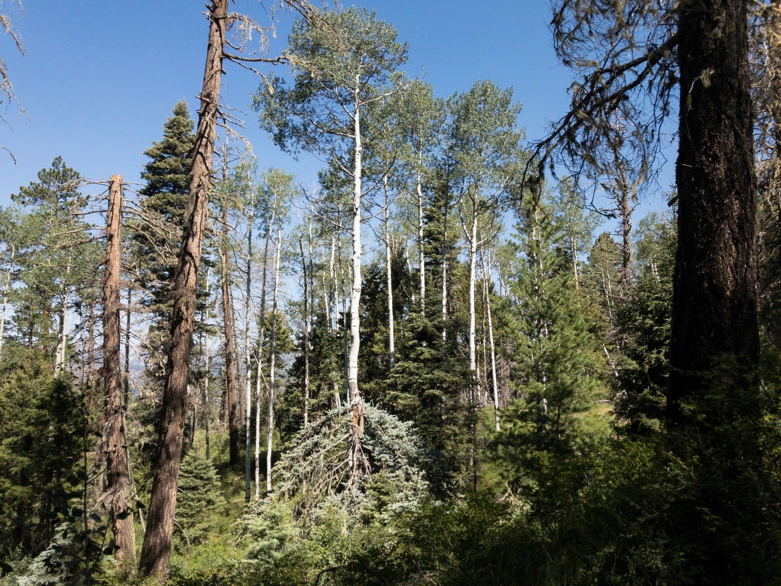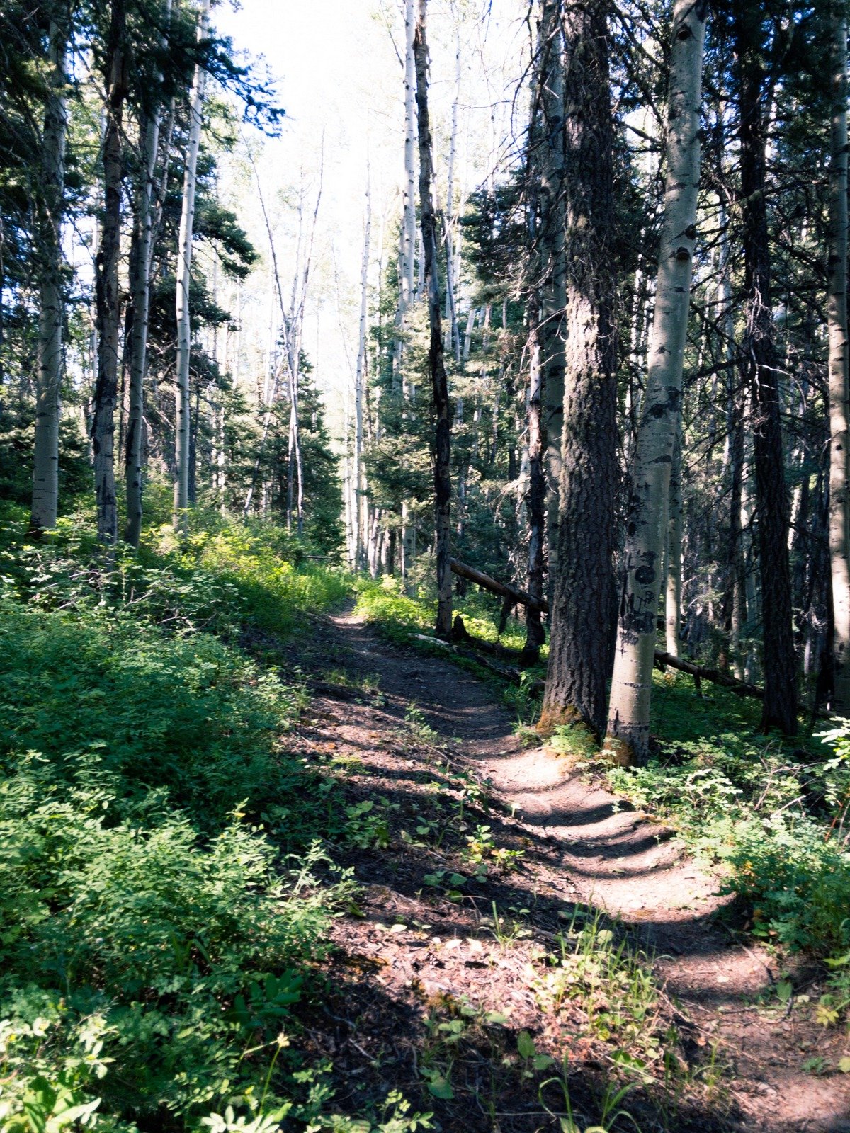The trail, well marked like the Turkey Creek Trail, presented us with a steady climb from the git-go. Except for an area of open hillside near the start, we were in fairly dense forest throughout – not many scenic views like those we’re accustomed to in New Mexico – with lots of aspen (-big- aspen), ponderosa pine, douglas fir, scrub oak, and more. About 2 miles into the hike on the Trail we found ourselves tracking parallel to a very nice brook – the sound of water coursing over rock falls and fallen tree trunks was quite pleasant.