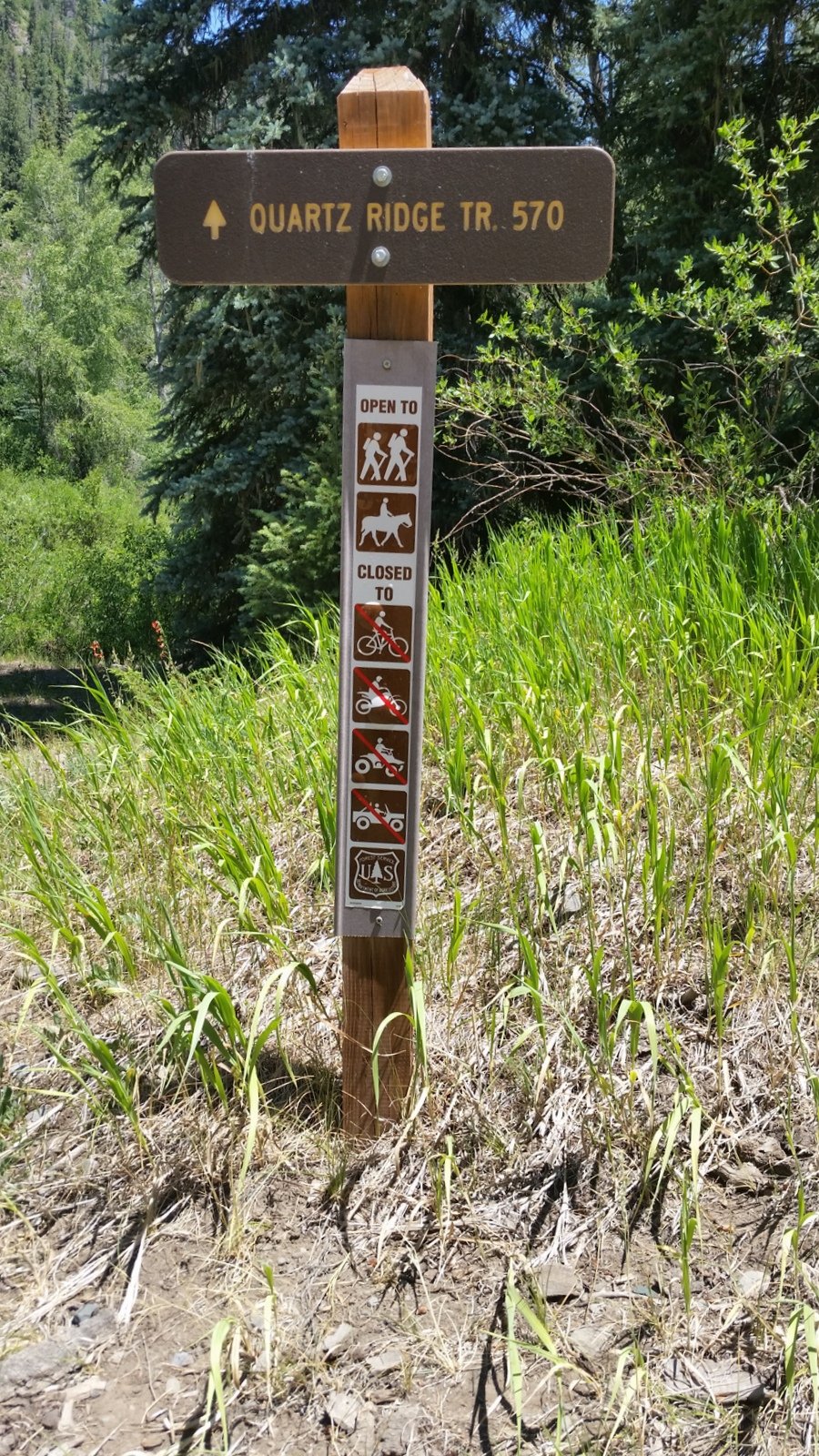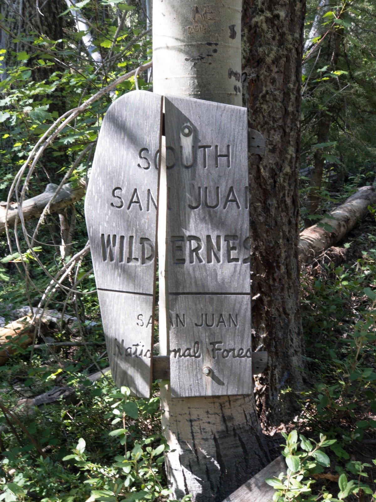 This was our second day of hiking in the San Juan mountains near Pagosa Springs. Our original plan was to hit the north end of the Quartz Ridge Trail, the trailhead located about 3 miles up the East Fork San Juan River on County Road 667 from the campground. After parking, we soon discovered that the trail required crossing either the East Fork San Juan River or Sand Creek, both of which were running large and fast. Not prepared for wading, we turned towards the Coal Creek trail, the trailhead being on the other side of the parking area.