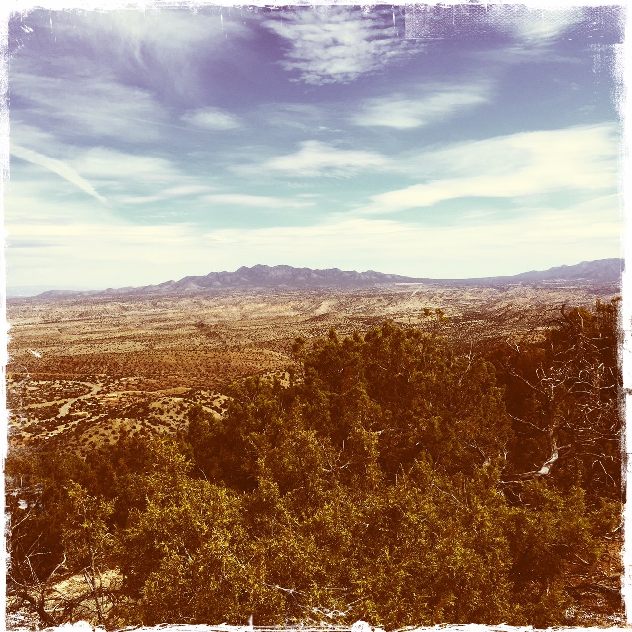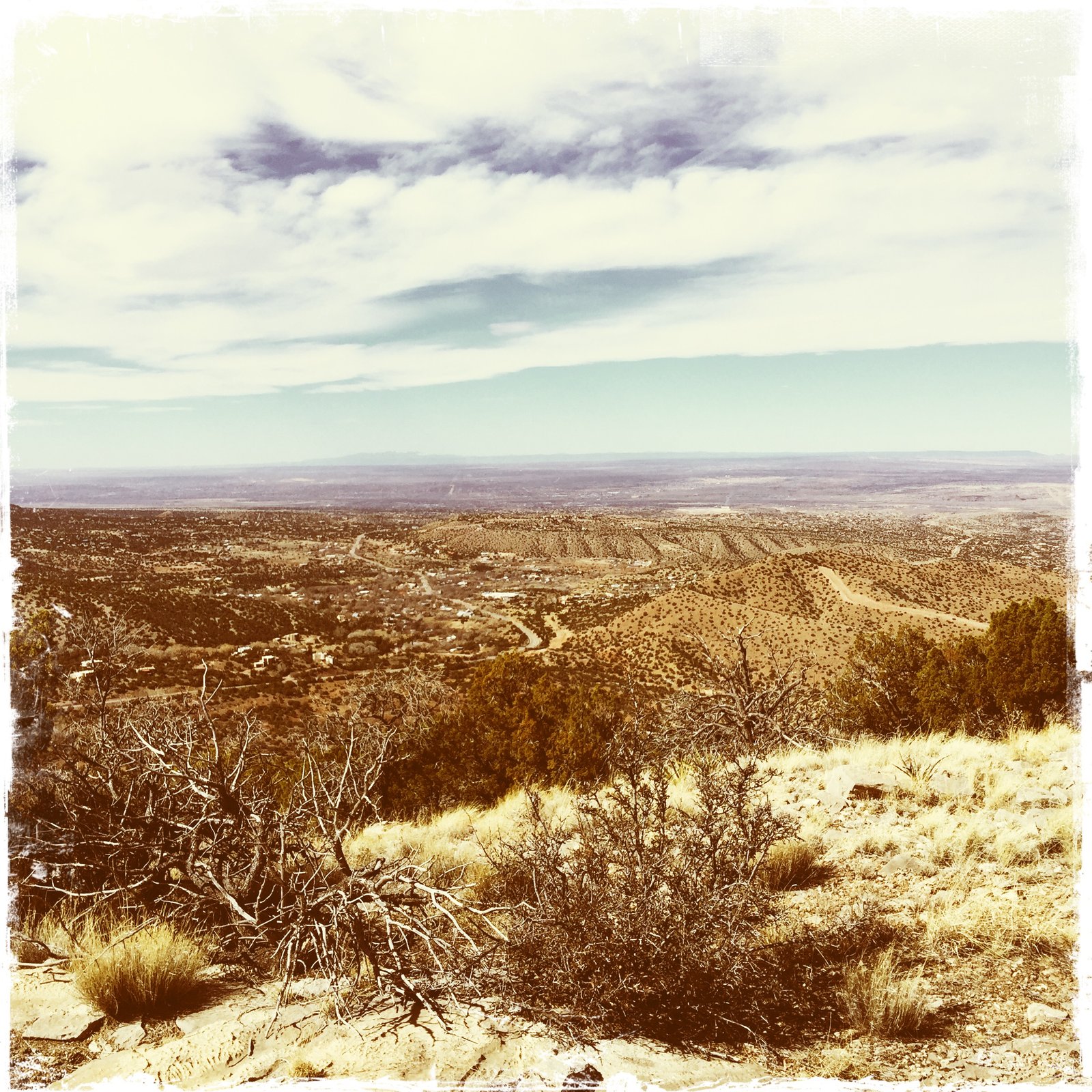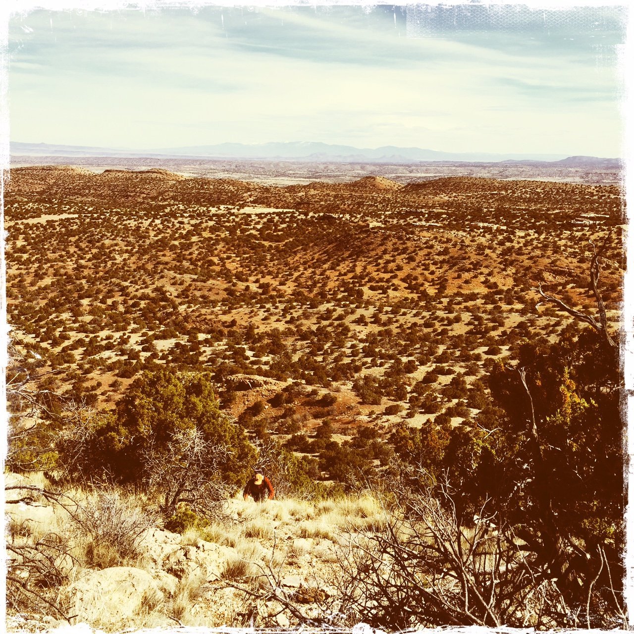 - Once up on top, the hike along the ridge was easy (certainly by comparison). We looked down a -very- steep slope to the southwest into Las Huertas Creek and Canyon, and beyond the east face of the Sandia Mountains. The views to the north were spectacular, as are so many in the Sandias. As is our custom, we set up a ‘micro camp’ at the top to enjoy hot coffee (augmented with a bit of Makers Mark) and trail mix.