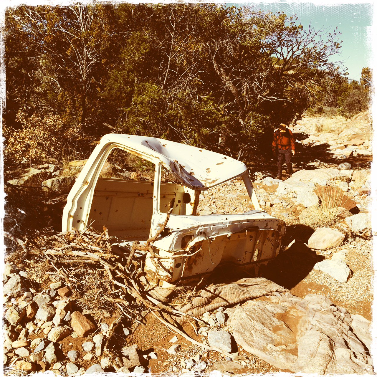 - Again following our predecessor’s track, we headed down a different ridge which was much easier than the ridge we climbed – should we return for another visit, we will go up by this route. Along the way we came across a what appeared to be a vertical mine shaft, maybe 15 feet deep. This raised images of having found the long-rumored Montezuma Mine (read accounts of the story here and here), but so many people have searched for their riches that it is unlikely that we found it.