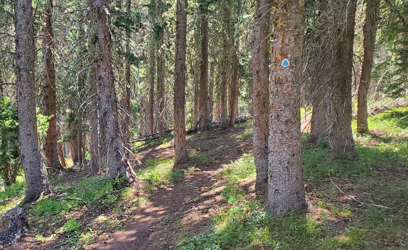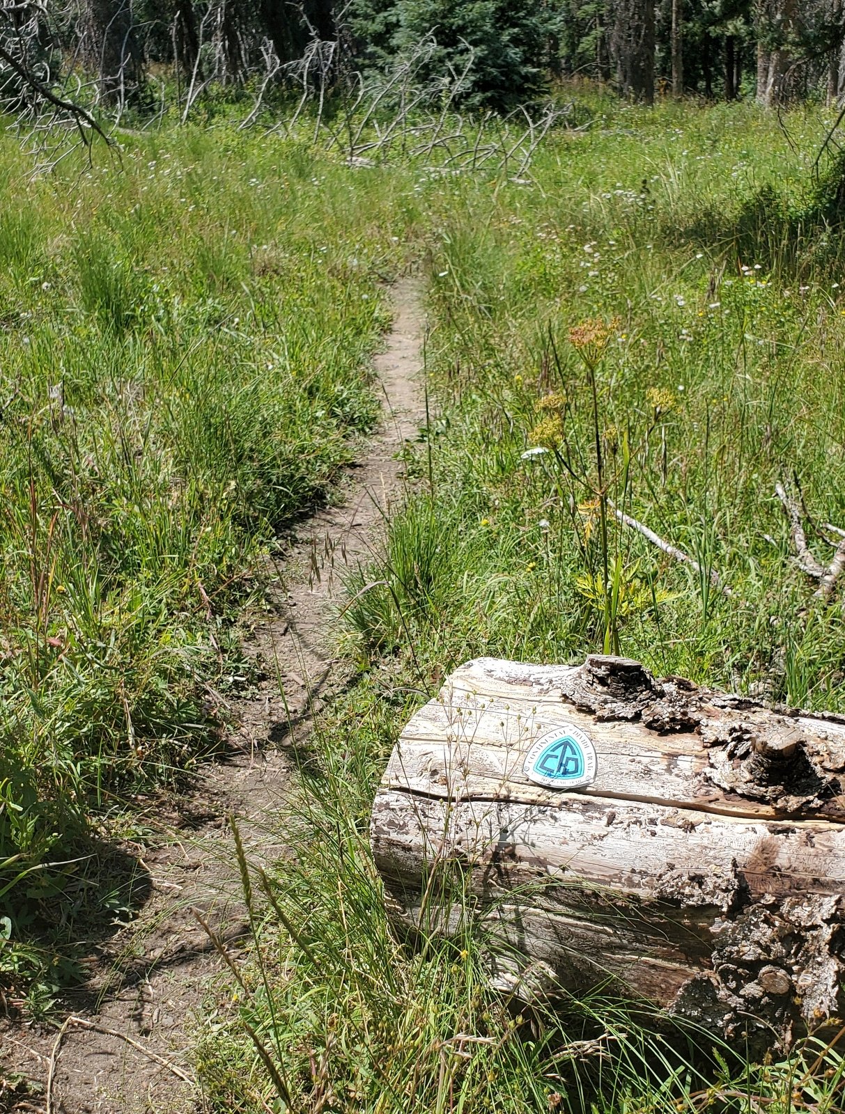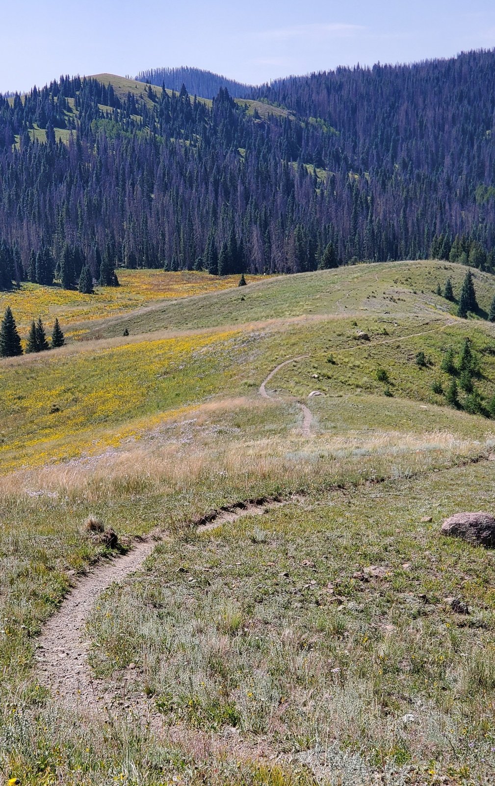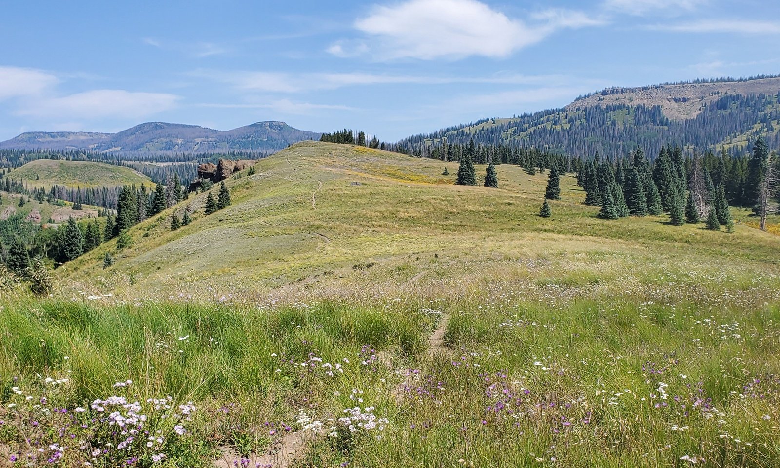 As it was for the CDT North, the trail is well used, smooth ground bordered by very green grasses with an abundance of flowers. From just under 10,000 feet elevation, the trail climbs a couple of hundred feet in the first half mile, then descends a bit on the top of a ridge for 3/4 mile. The views are spectacular, to the west towards Chama down the Wolf Creek valley. For the next 1.25 miles the trail climbs close to 500 feet, up to 10,469 feet elevation. Most of the distance is in open grassland with parcels of forest along the way.