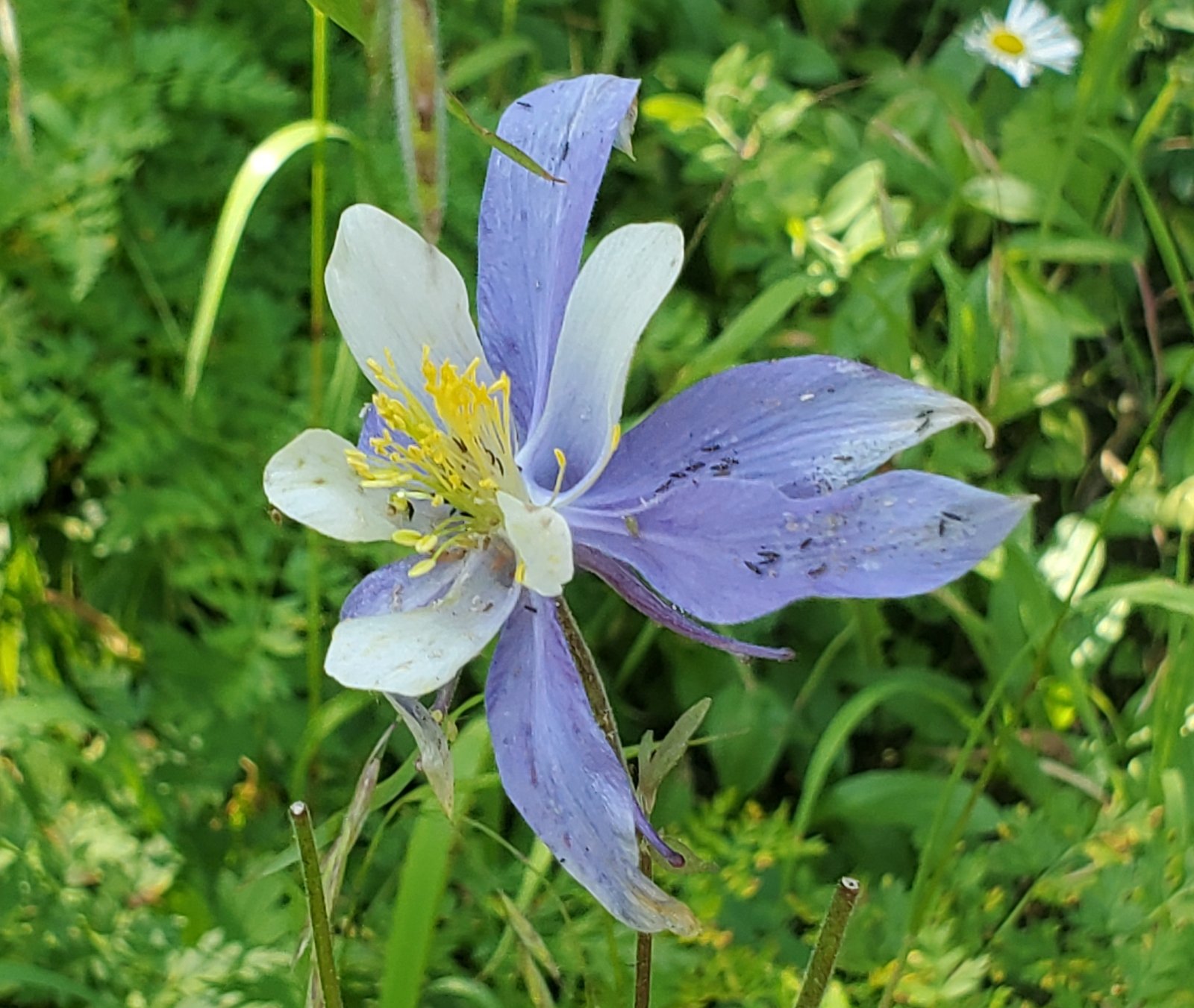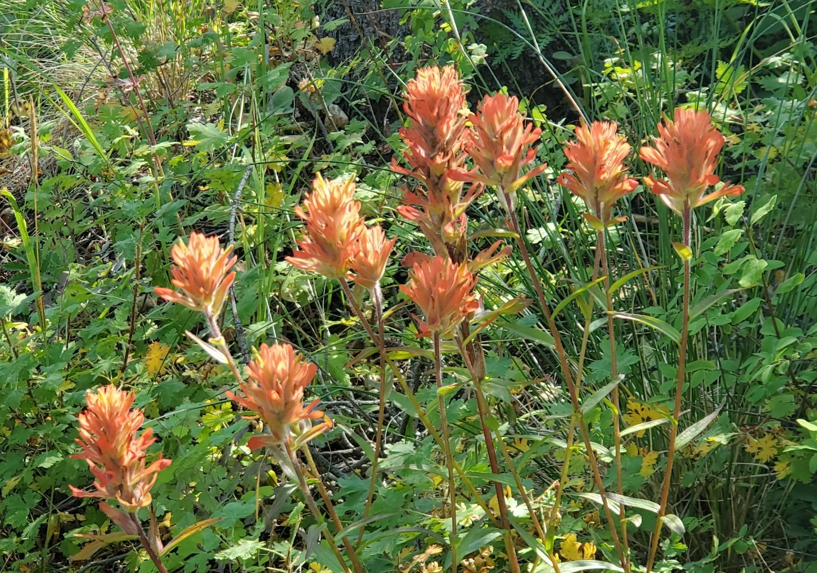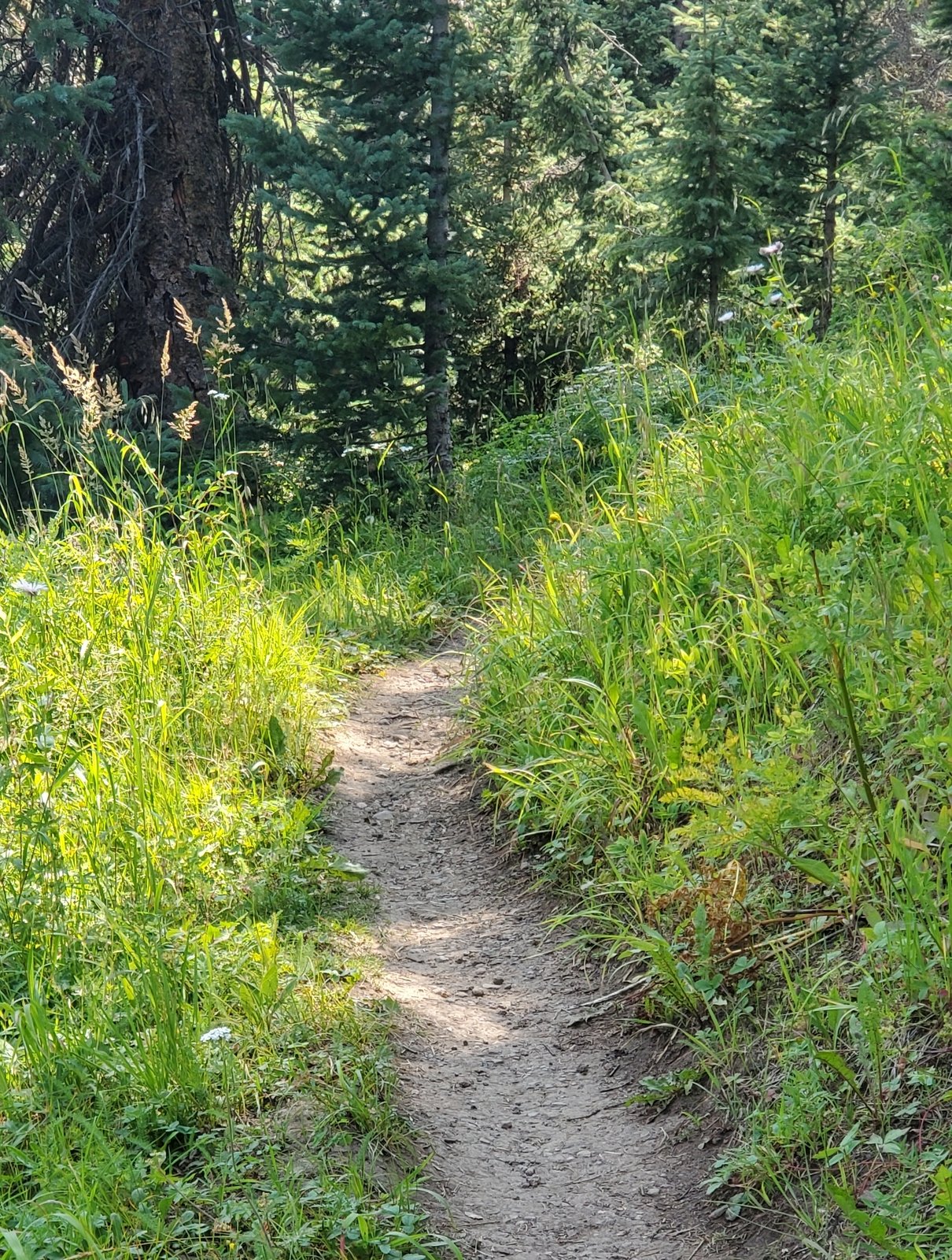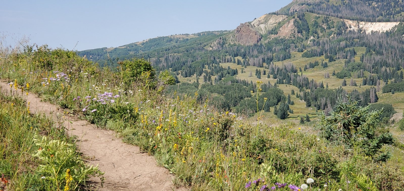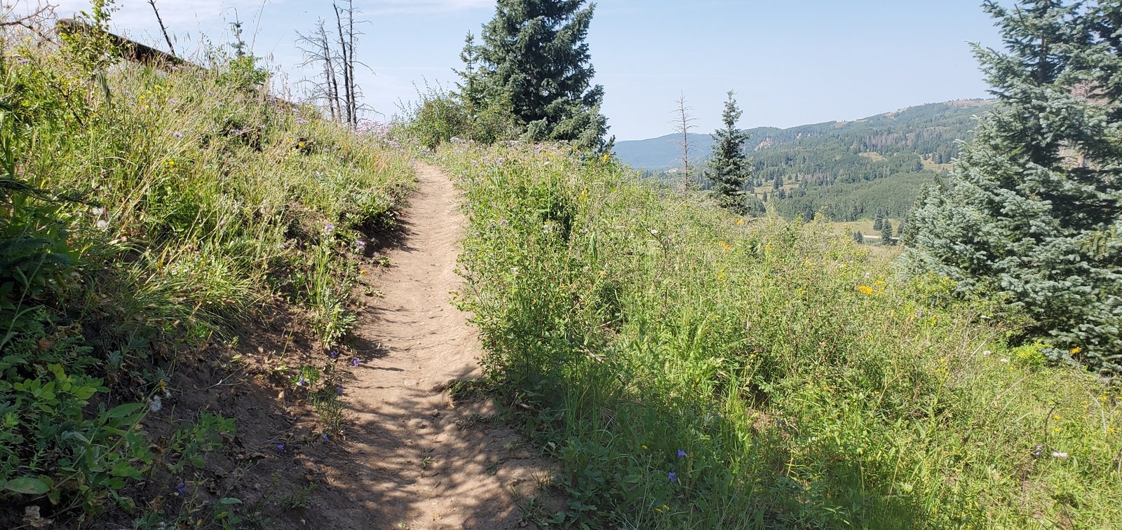 As it was for the CDT North, the trail is well used, smooth ground bordered by very green grasses with an abundance of flowers. From just under 10,000 feet elevation, the trail climbs a couple of hundred feet in the first half mile, then descends a bit on the top of a ridge for 3/4 mile. The views are spectacular, to the west towards Chama down the Wolf Creek valley. For the next 1.25 miles the trail climbs close to 500 feet, up to 10,469 feet elevation. Most of the distance is in open grassland with parcels of forest along the way.
