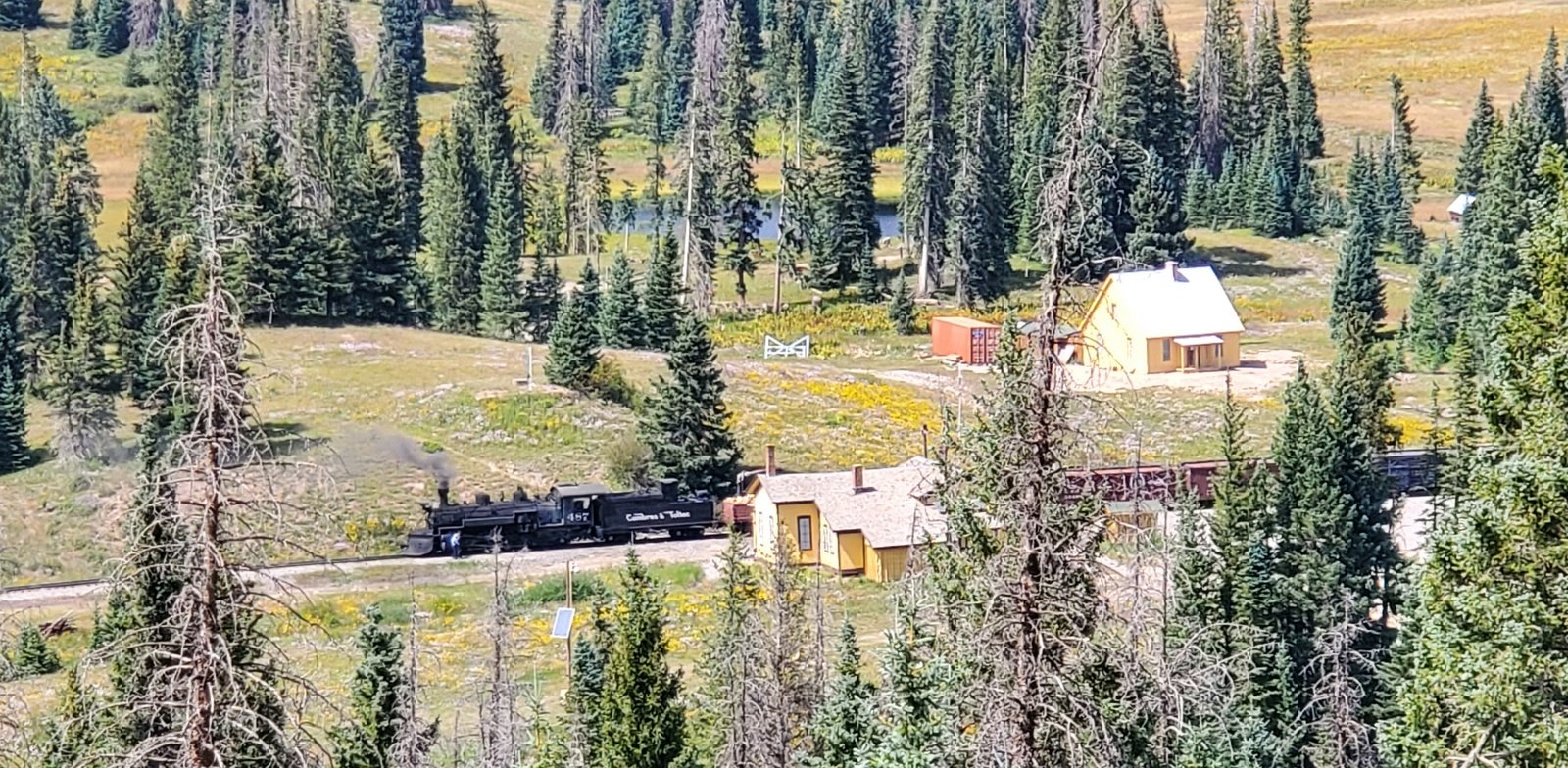 The trail begins from the parking area on the right side of CO 17 at the top of Cumbres Pass. As yesterday for the CDT North hike, my timing was good – the Cumbres and Toltec passenger train was parked at the station, preparing to continue on to Antonito.