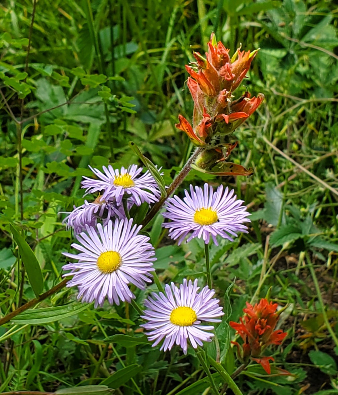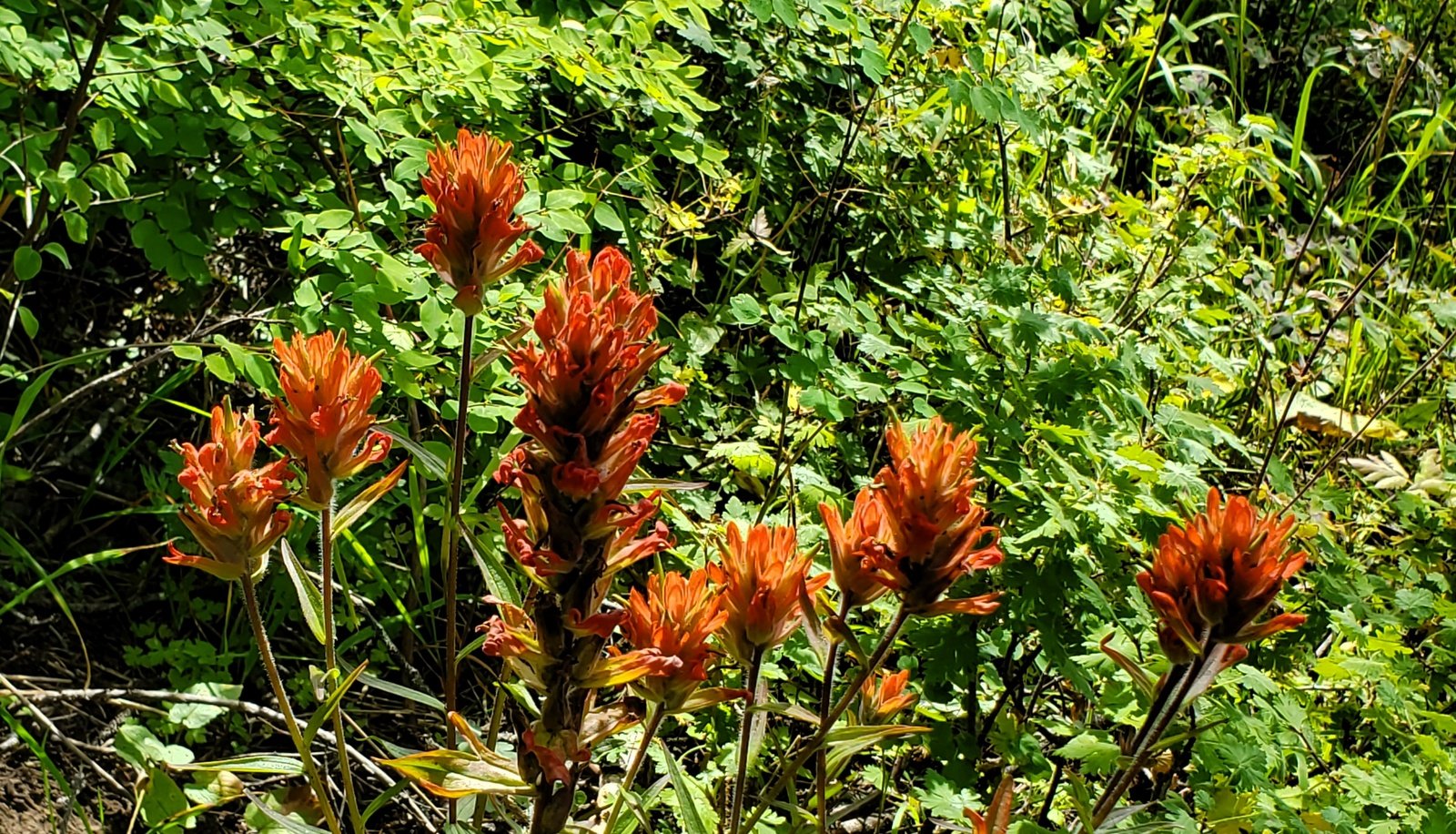 As it was for the CDT North, the trail is well used, smooth ground bordered by very green grasses with an abundance of flowers. From just under 10,000 feet elevation, the trail climbs a couple of hundred feet in the first half mile, then descends a bit on the top of a ridge for 3/4 mile. The views are spectacular, to the west towards Chama down the Wolf Creek valley. For the next 1.25 miles the trail climbs close to 500 feet, up to 10,469 feet elevation. Most of the distance is in open grassland with parcels of forest along the way.
