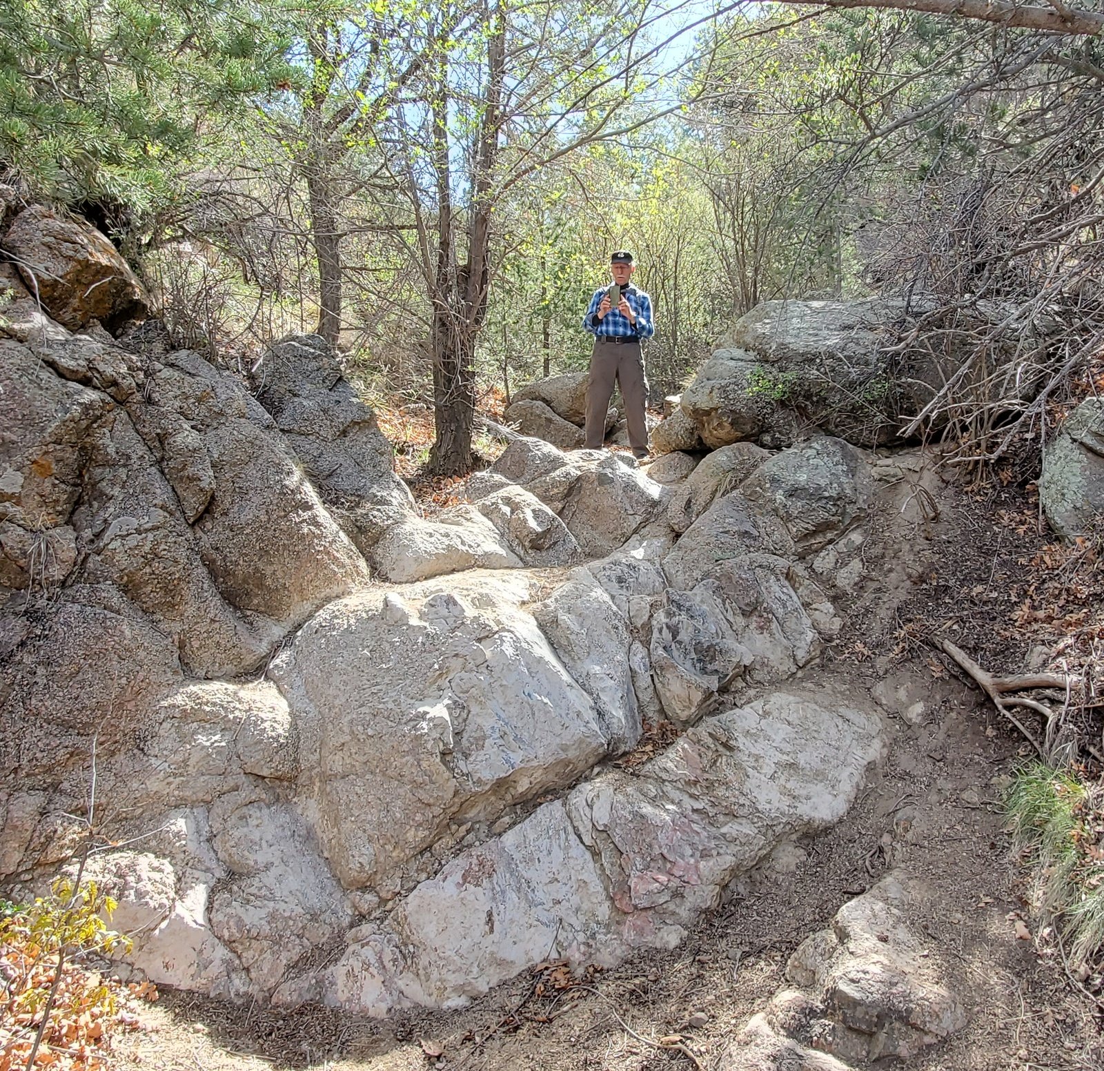 On the way down Piedra Lisa, not far from the intersection with Agua Sarca, we spotted an outcropping of white rock. It appeared to be similar to the “Quartz Outcrop” that we’ve hiked to a couple of times. If so, then we were unexpectedly close to that hike. But checking the topo map, and reviewing the tracks for the Quartz Outcrop hike, we concluded that it is another such Outcrop. And it becomes another destination, to cross the intervening arroyo from Piedra Lisa to inspect it more closely.