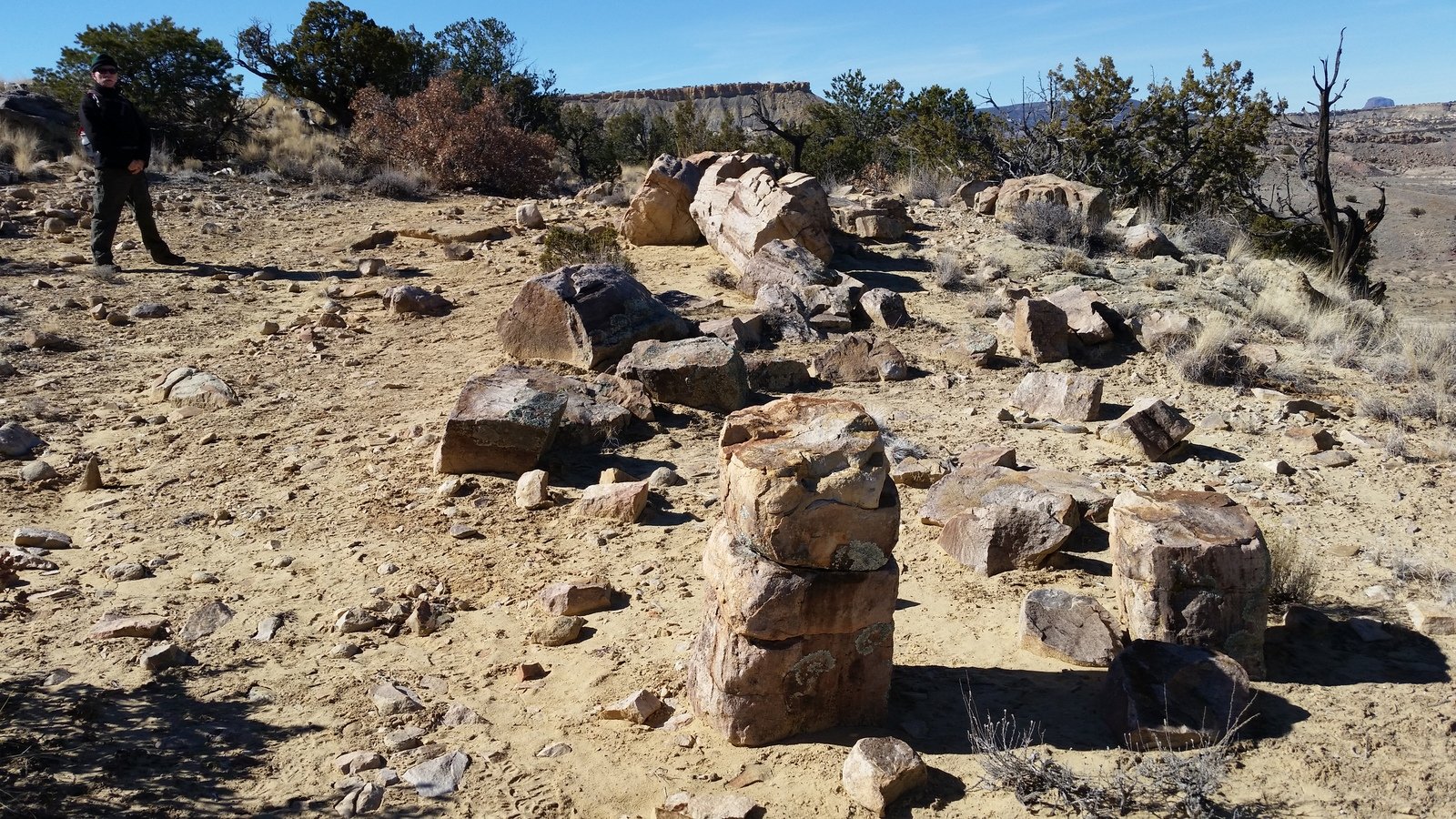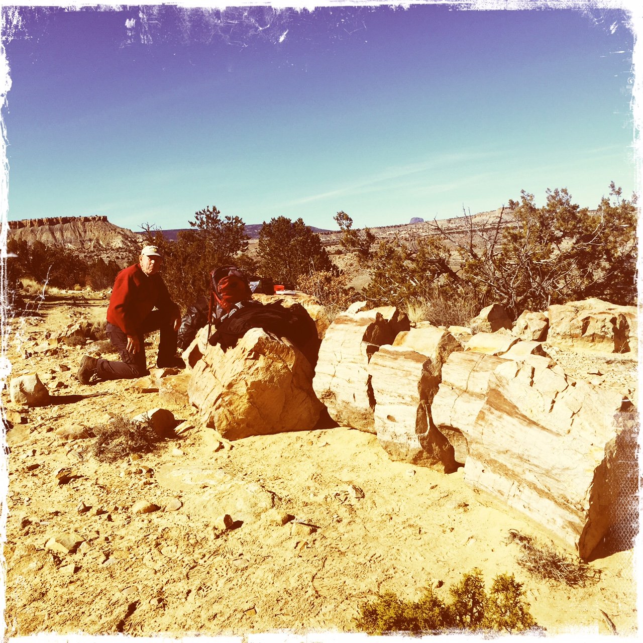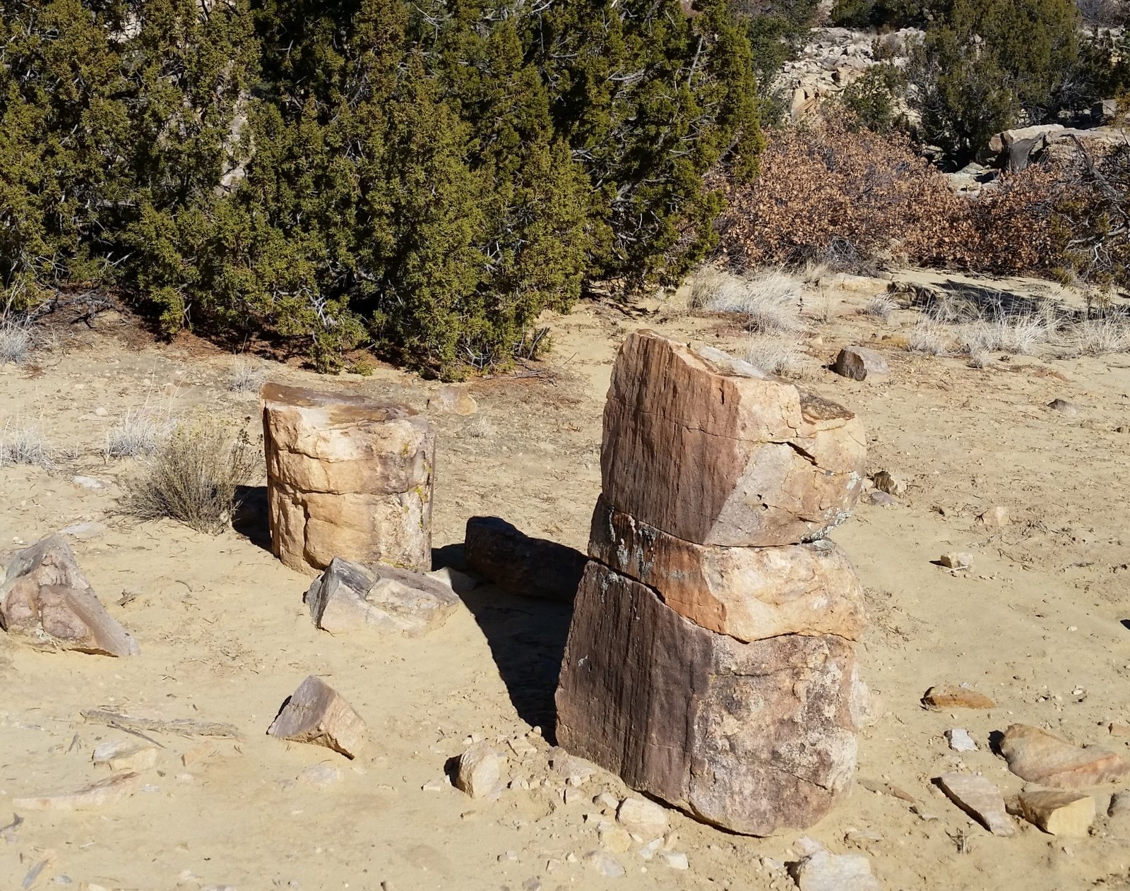 Along the way, we found other rock ‘assemblies’ that still puzzle us – the shape strongly suggests petrified tree trunks, but the appearance and texture of the outer surface and what would be the inside of a tree trunk appear nothing like petrified wood we’ve seen elsewhere. (Where is the geologist when we need one?) At the “Logs”, the rocks there were so much more like what we expect that we concluded they -are- petrified wood. And they made a fine “coffee bar” for our mid-hike break.
