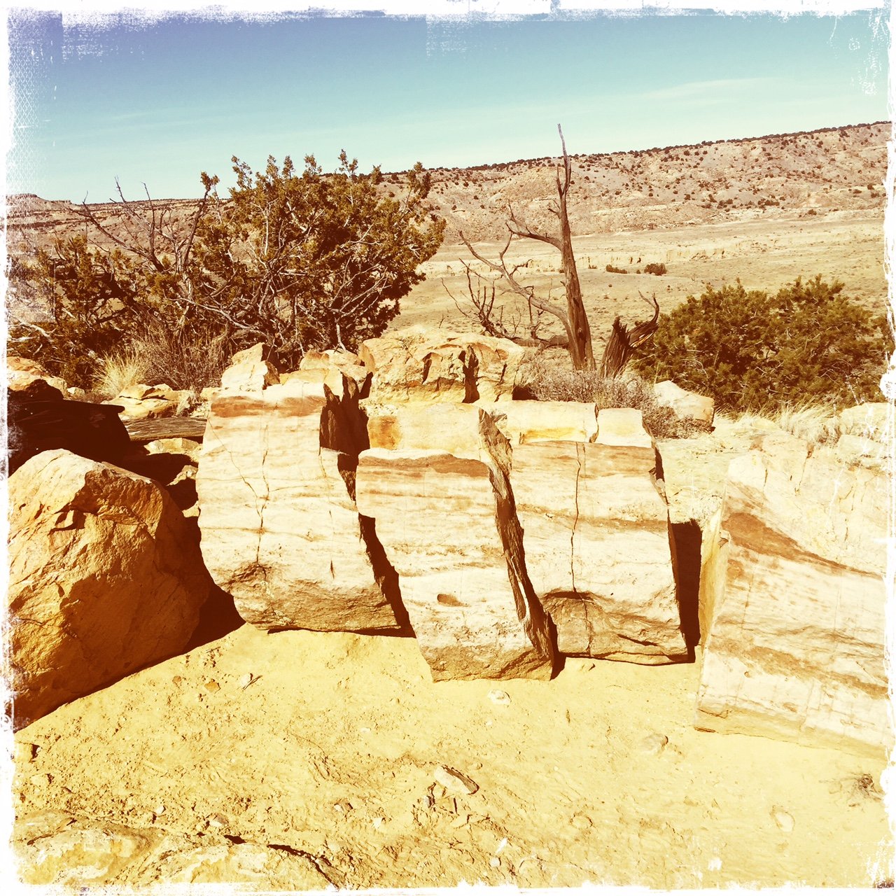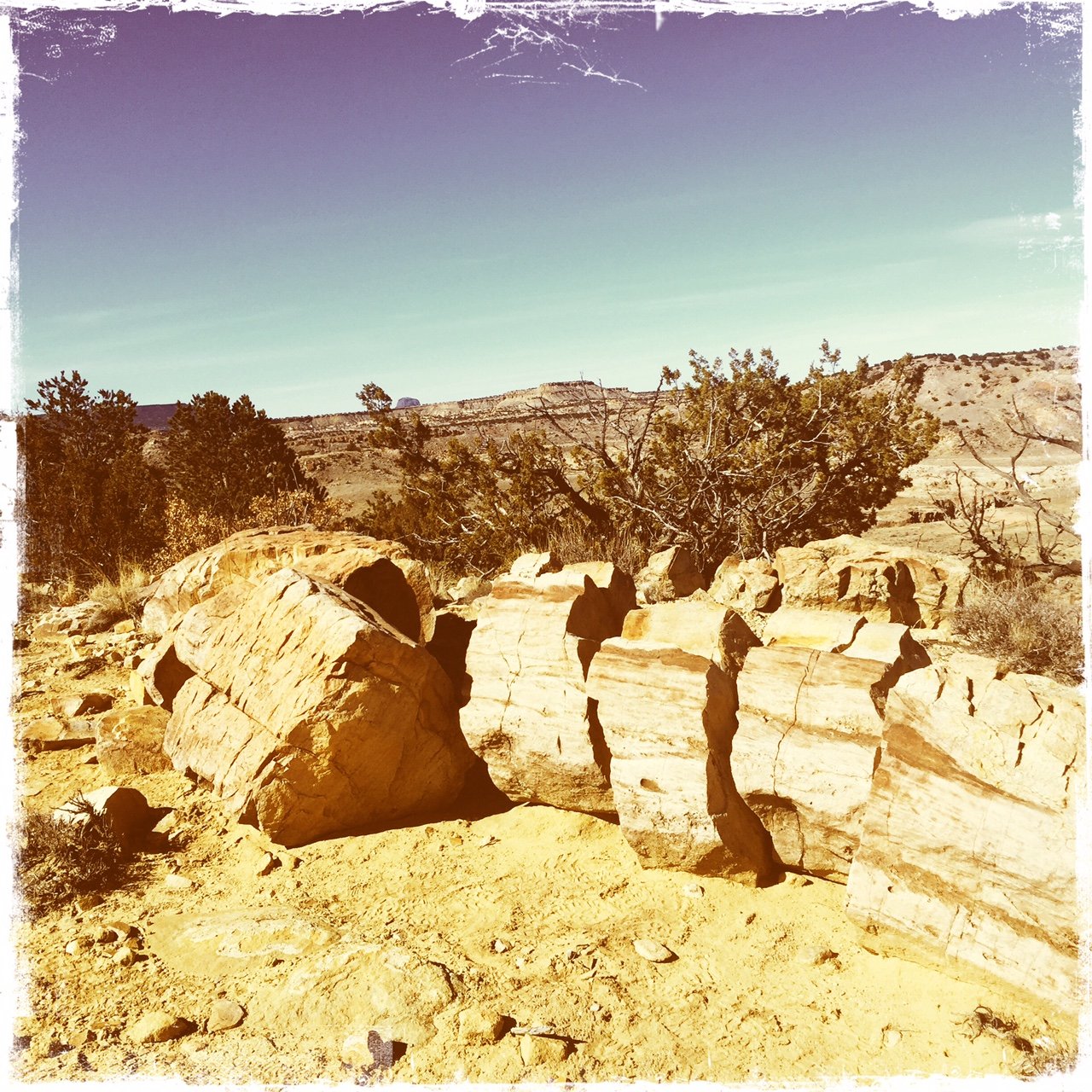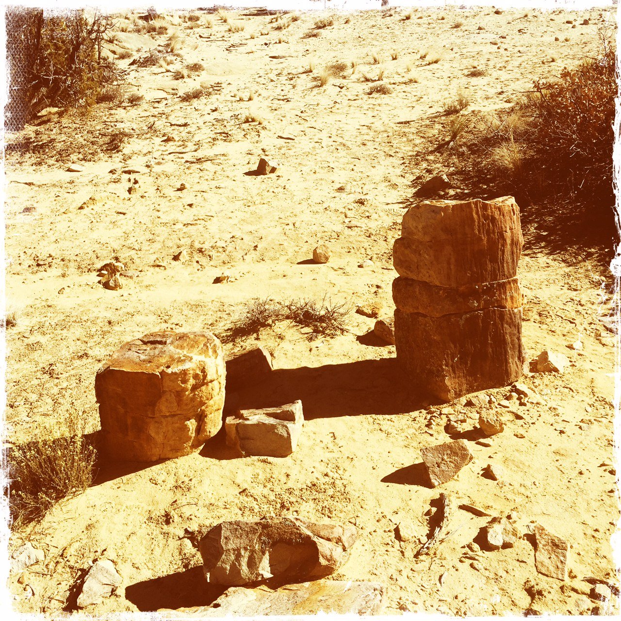 Along the way, we found other rock ‘assemblies’ that still puzzle us – the shape strongly suggests petrified tree trunks, but the appearance and texture of the outer surface and what would be the inside of a tree trunk appear nothing like petrified wood we’ve seen elsewhere. (Where is the geologist when we need one?) At the “Logs”, the rocks there were so much more like what we expect that we concluded they -are- petrified wood. And they made a fine “coffee bar” for our mid-hike break.