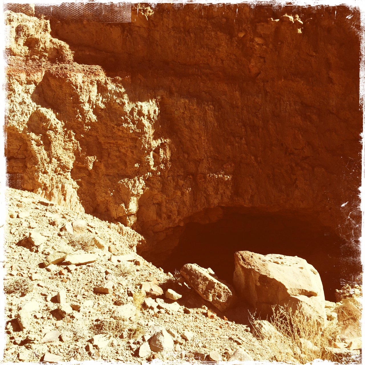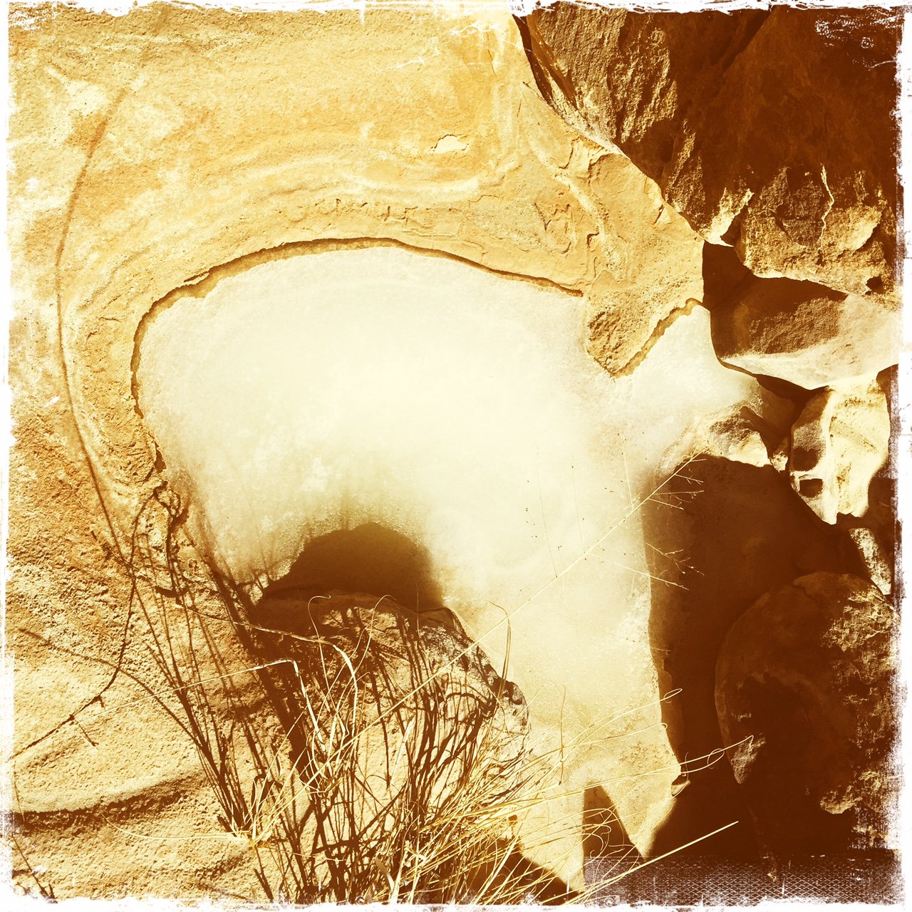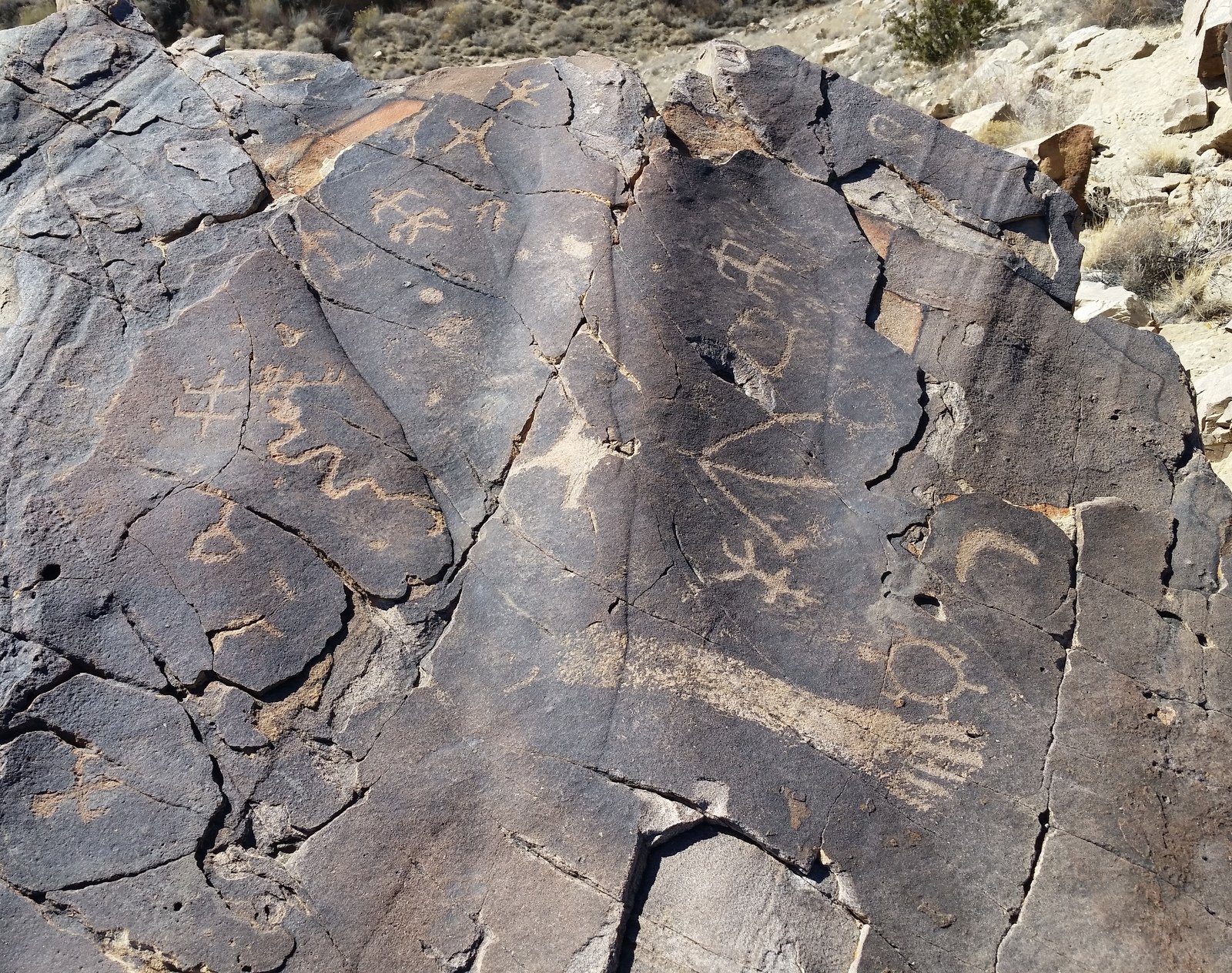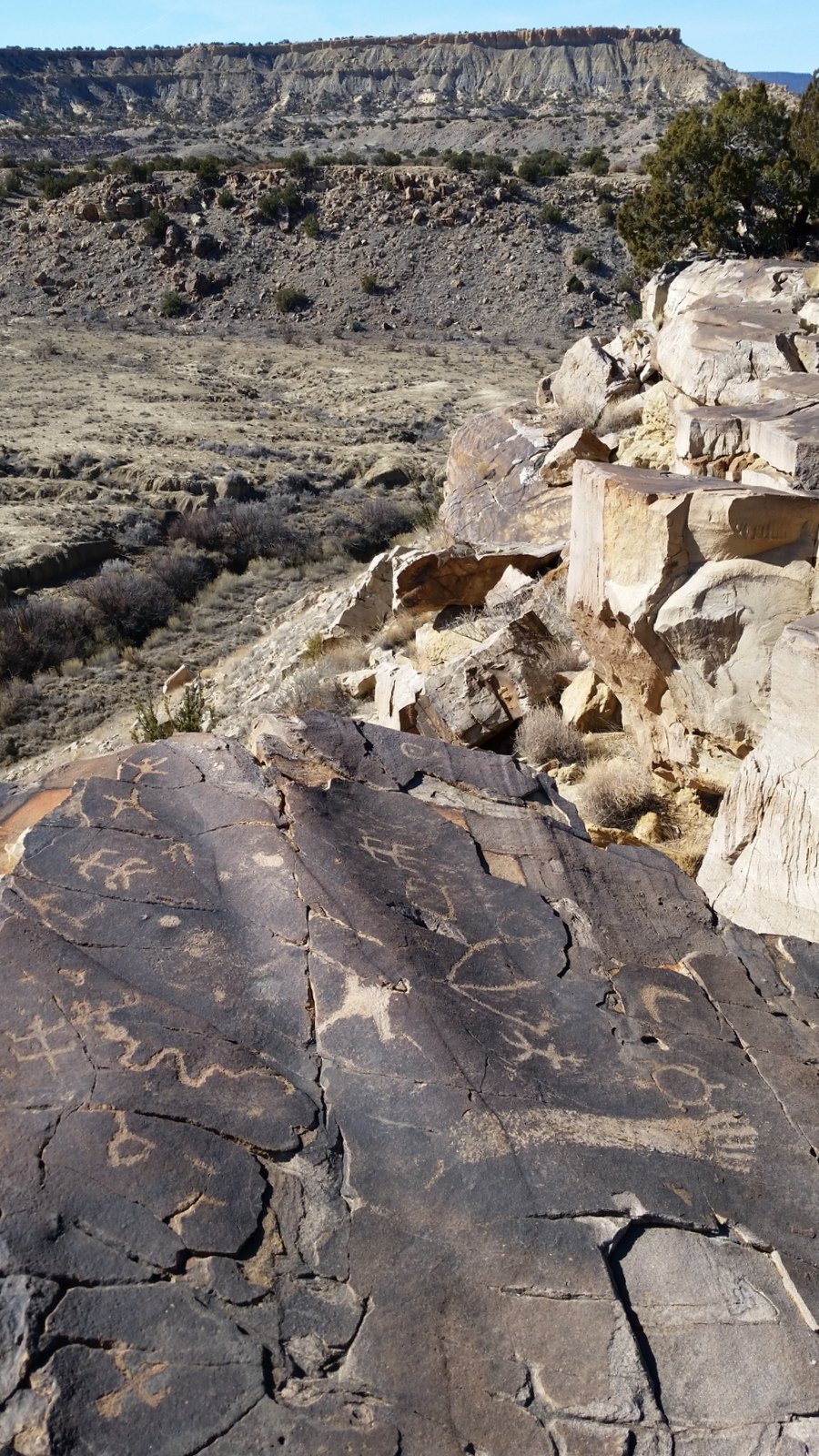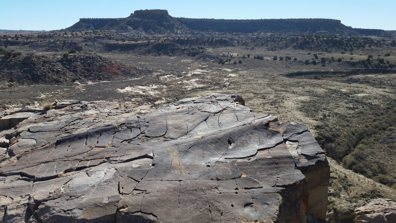 The site of the Dinosaur Dig is a large area of sand, quite unusual compared to the terrain all around (and elsewhere, for that matter). And it is near the end of this mesa, with a 200-300, maybe 400 foot drop-off to the valley floor – this seems unusual, but the mesa is clearly “held up” by a solid foundation of rock geology. And closer to the end of the mesa than the Dig, we found the petroglyphs – unusual in that they were inscribed on a horizontal surface of rock (and at the mesa’s edge, so I had to take photos so Jay could see them up close).