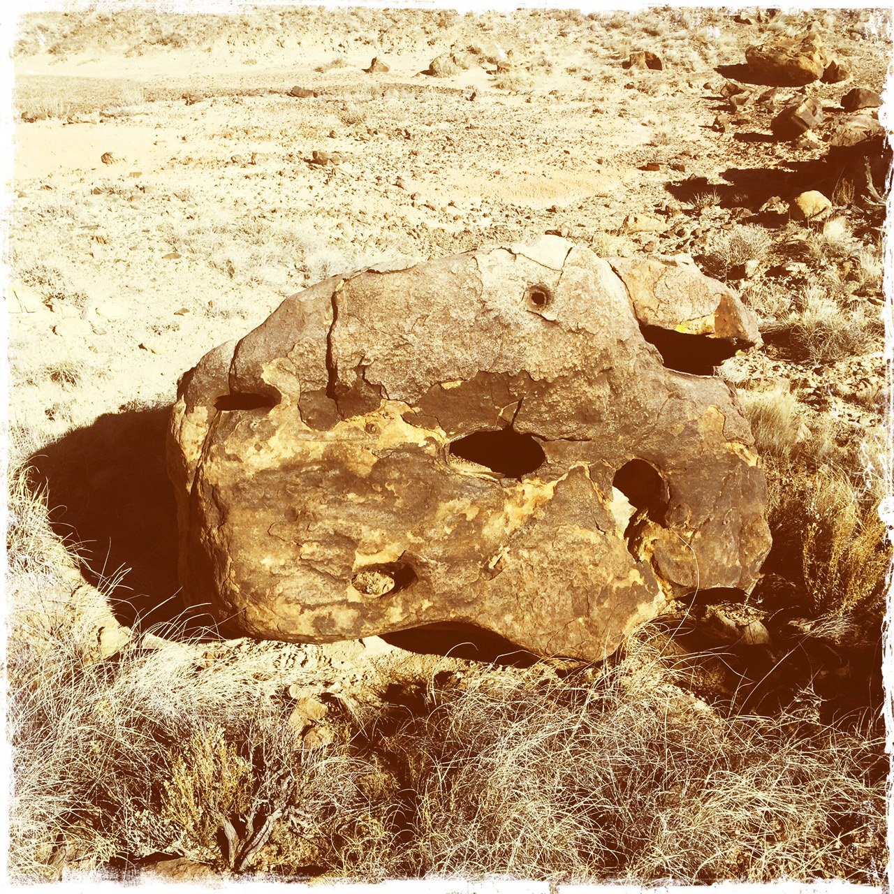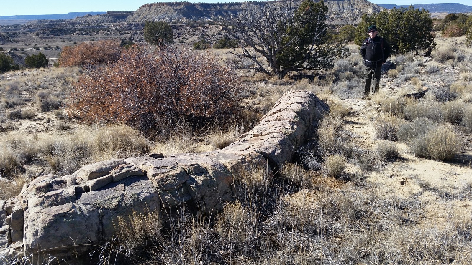 This hike is a followup to our recent outing, Hoodoo Pines, when we thought we were heading towards the Dinosaur Dig, but … we started at a different trailhead and were using a different ASCHG track. Today, tho’ we got on track, followed Dinosaur Dig Hike, (with a half mile backtrack, if you look at the GoogleEarth .kml track closely), and found our way to the Logs, the Cave, the Dig, and the Petroglyphs.