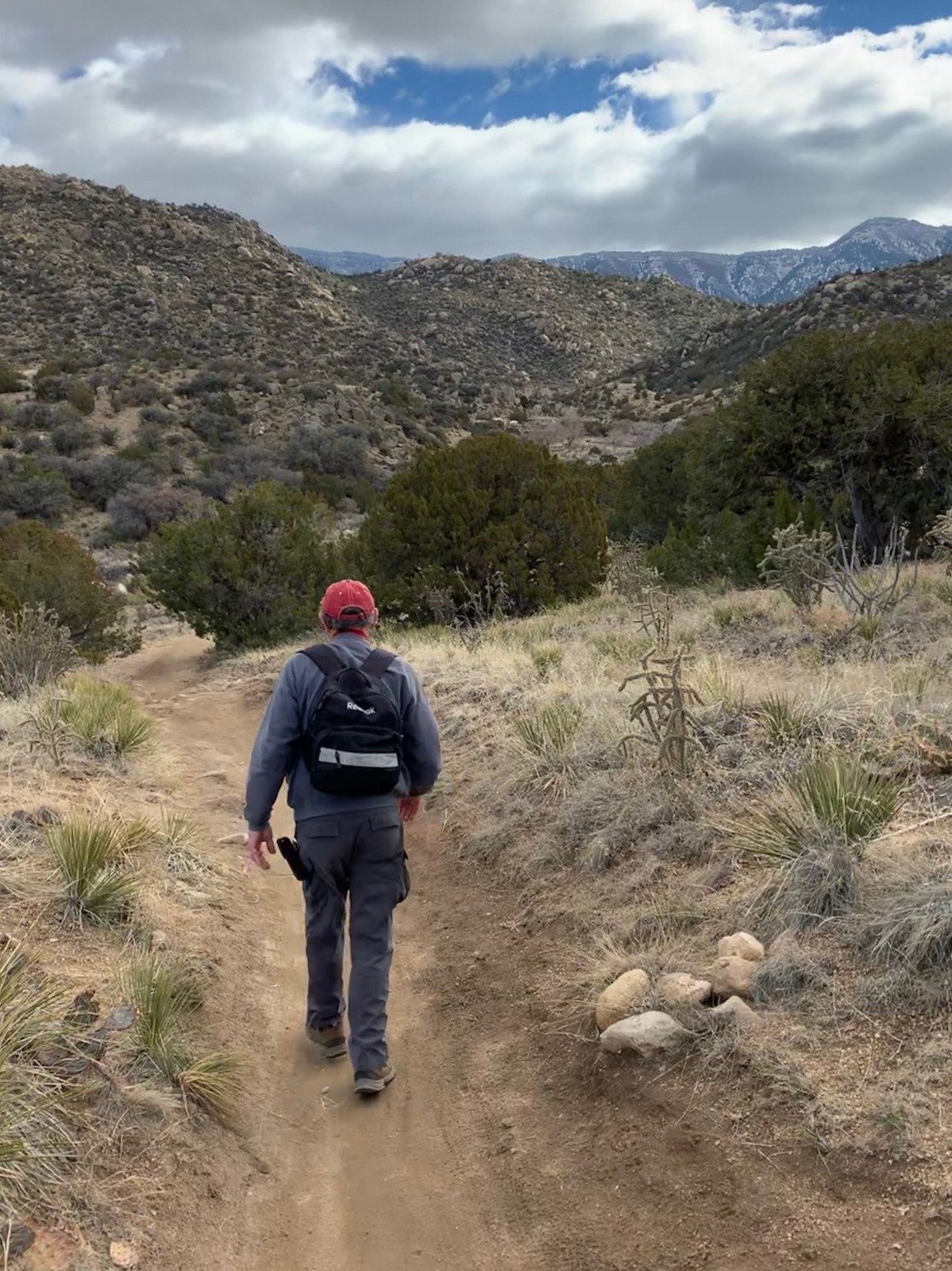 We brought a map (pdf) which was good to get us started. We chose trails that would give us more than 3 miles and finish within 2 hours. As you can see, it was somewhat longer but we made the 2 hours. Like all trails, most are well used and present a comfortable track. Going transverse to the arroyos, the trails present some ups and downs; we welcomed even that small elevation gain to prepare us for more to come this spring.