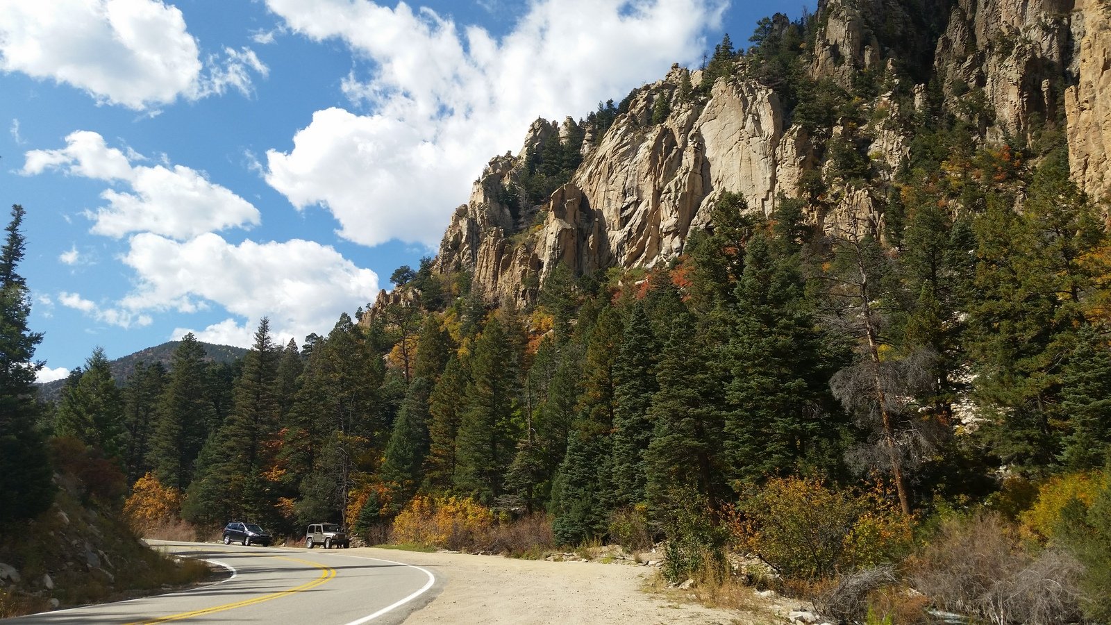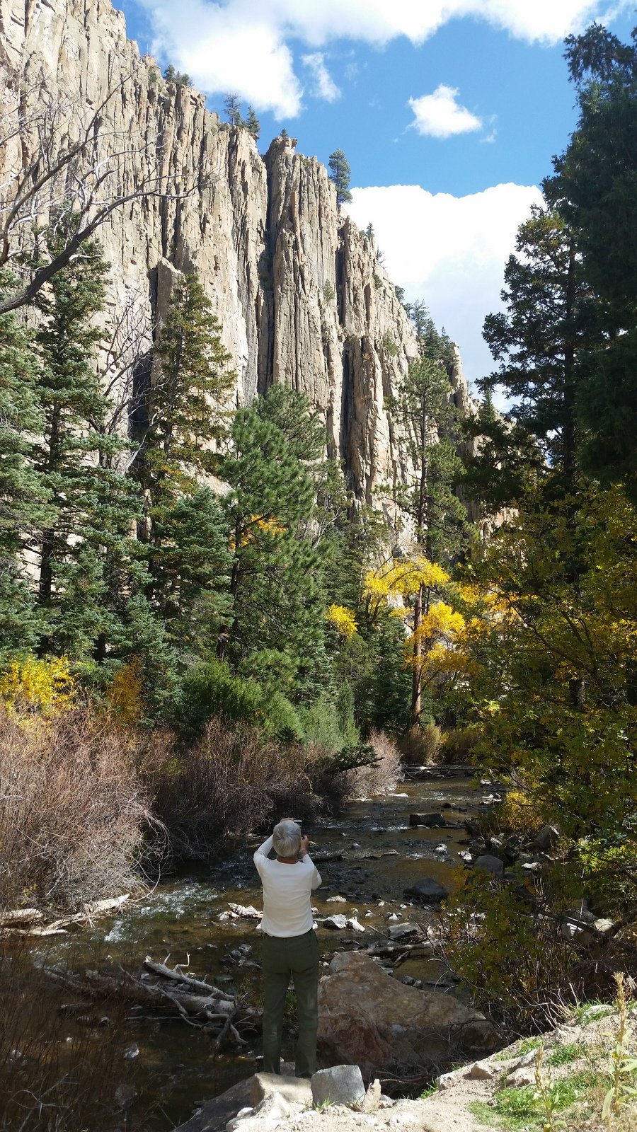 Our timing for this trip could not have been better to enjoy the autumn colors in New Mexico. On the way to Questa we passed by bright yellow cottonwood trees all along the highway, and we could see on the mountain 5 to 10 miles distant great splashes of yellow aspen. Driving up Red River Canyon, there was hardly a break in the continuous flow of cottonwood and aspen in their full autumn color – bright golden yellow – with other trees and grasses adding their colors. Scattered along the way were amazing cliffs, hundreds of feet above the roadway, adding even more spectacle to the drive – truly spectacular.