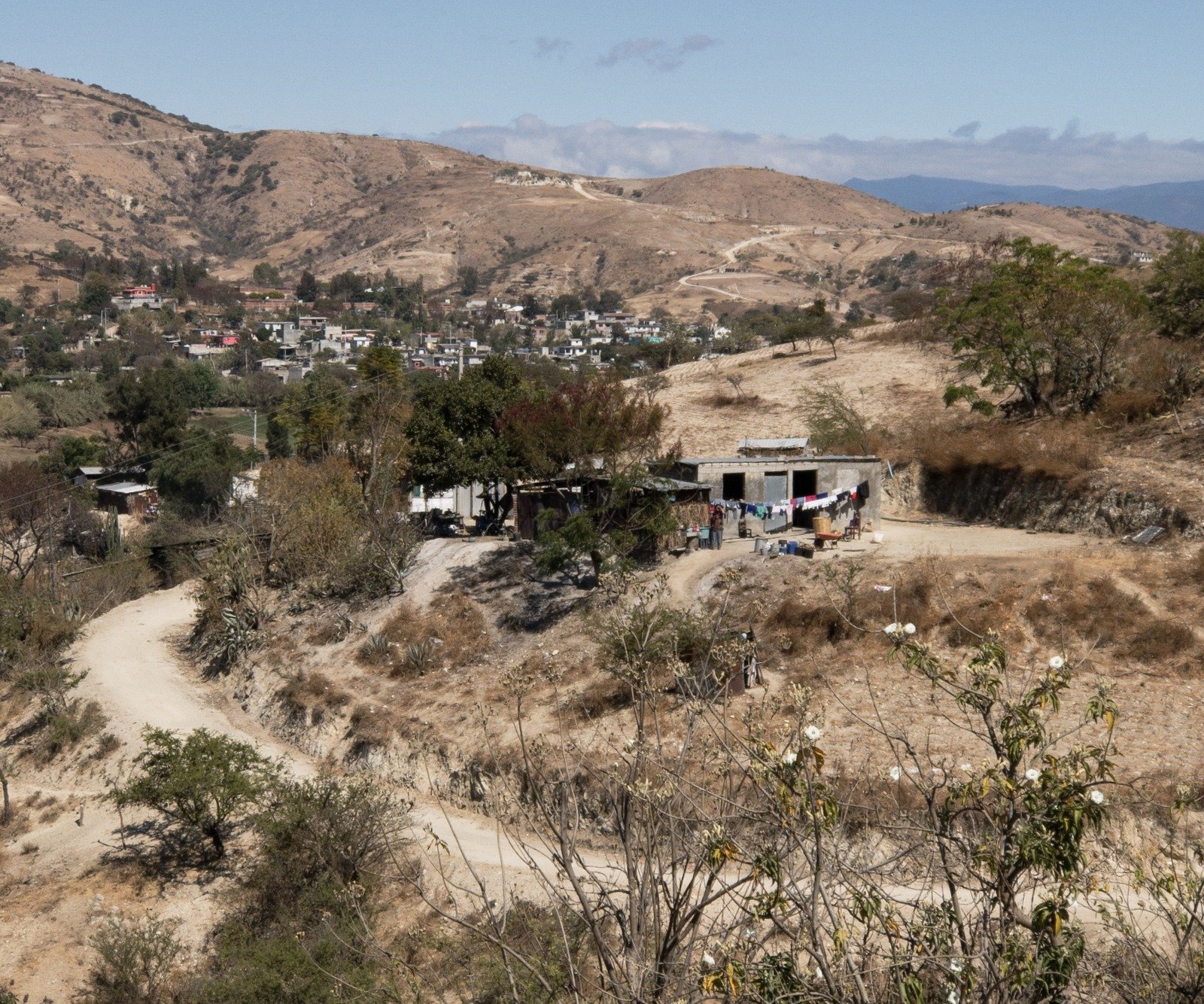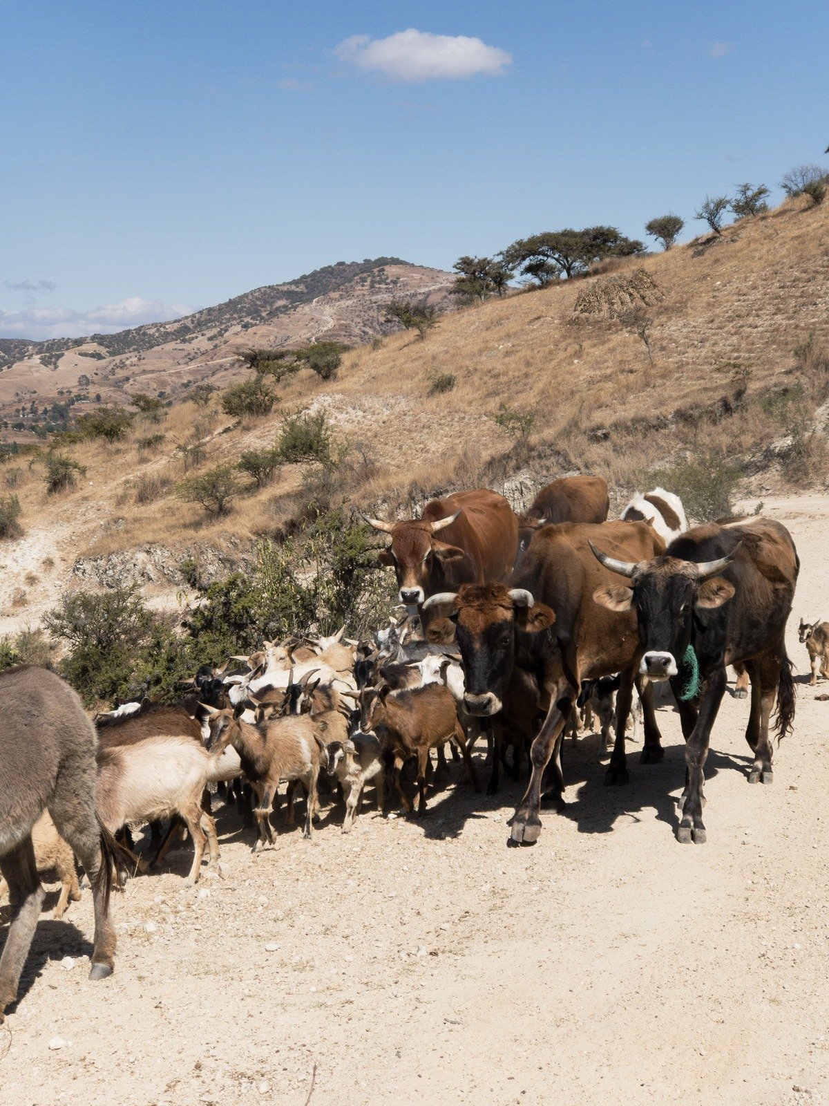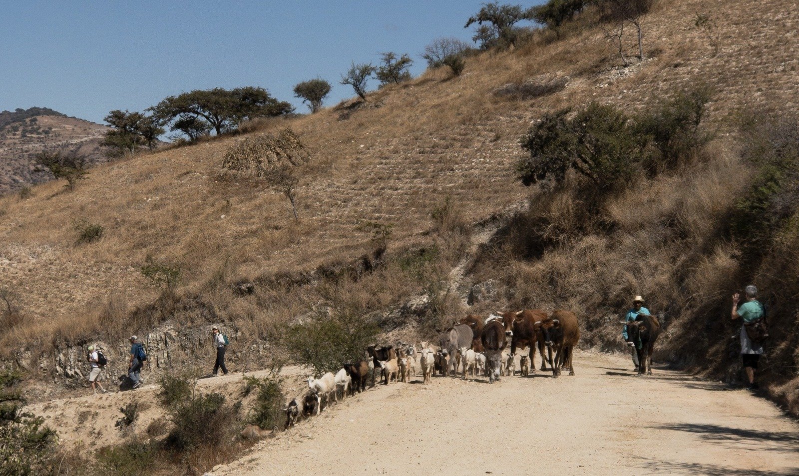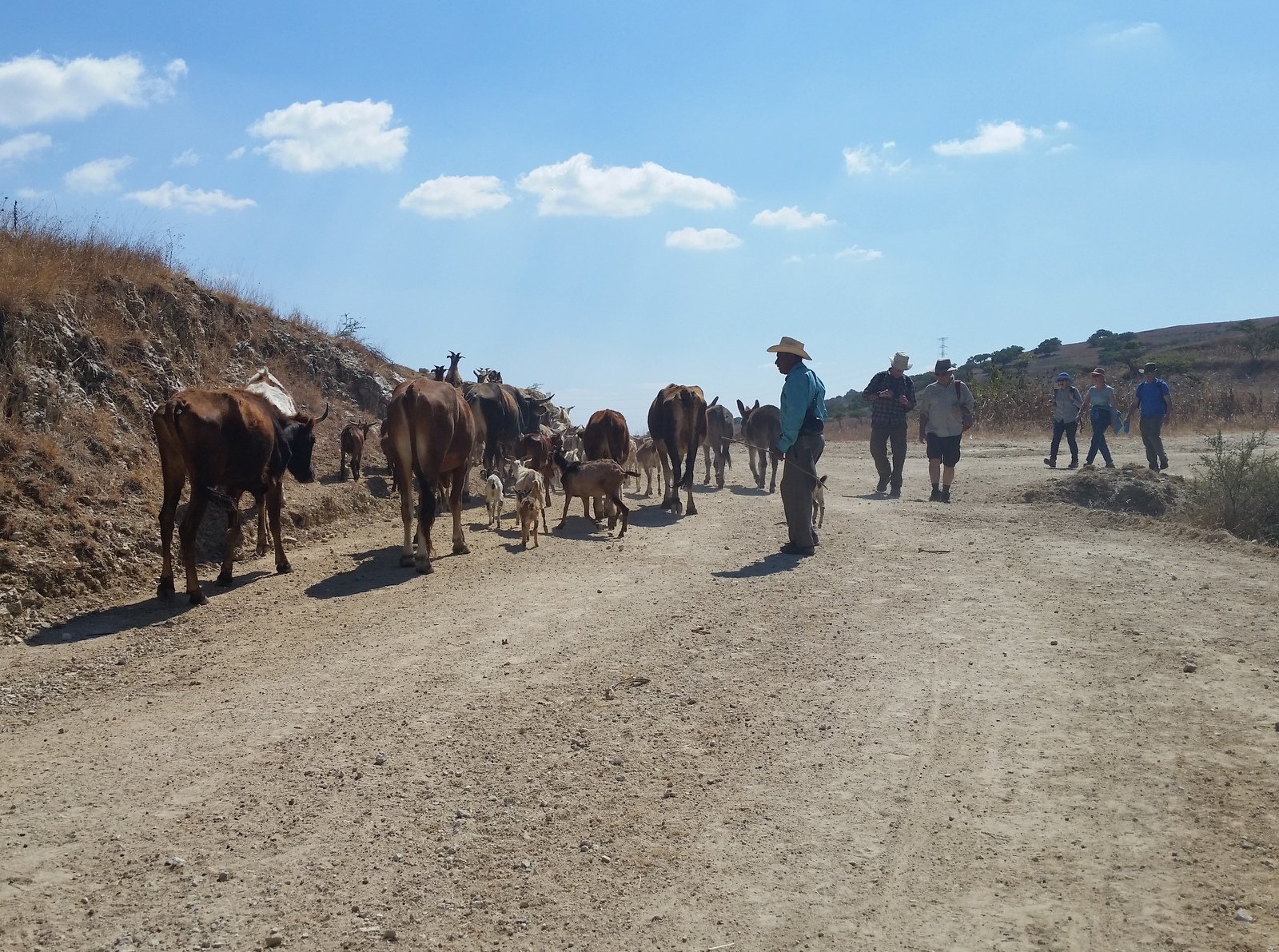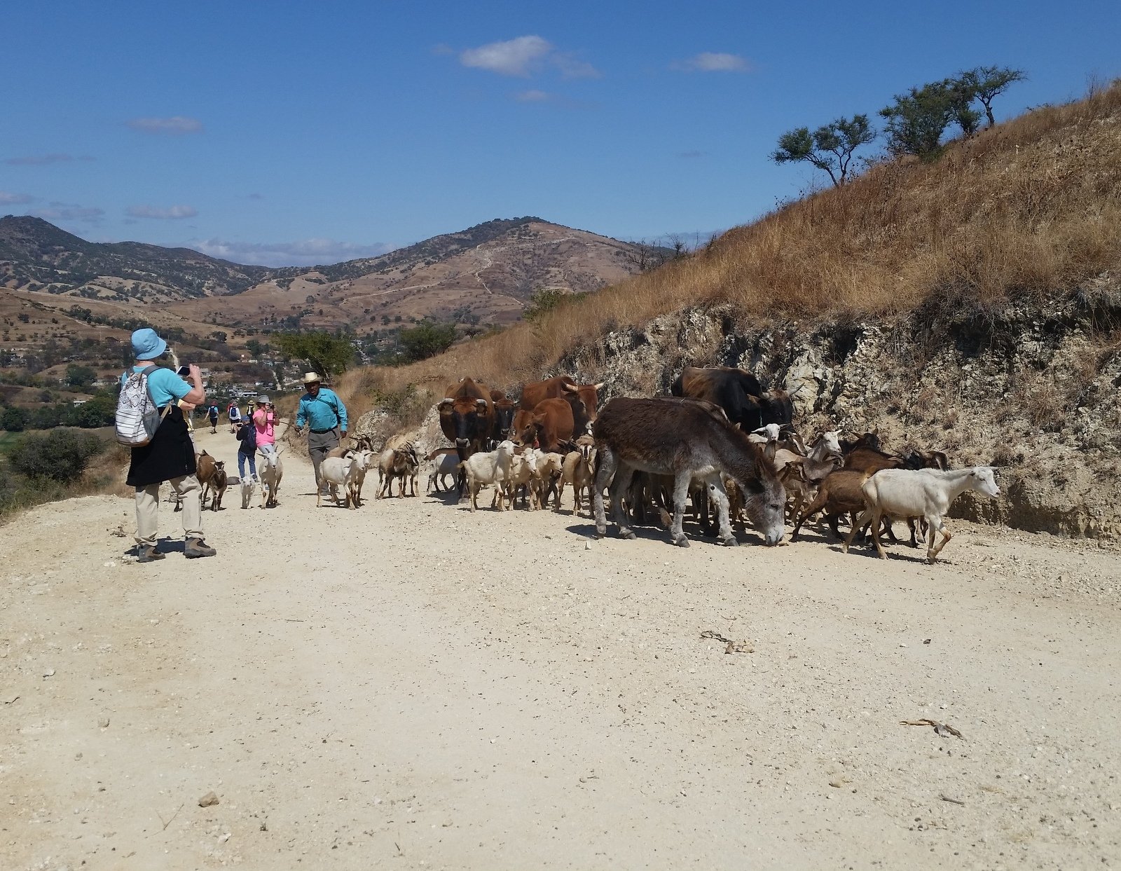 From the top of the ridge it was an easy walk down the road towards San Felipe Tejalapam. We encountered a small sheep and a few cows being herded up the road by their master and his trusty dog – this certainly added to the ambience of the experience. Approaching the end of the hike we passed among numerous cultivated fields, and crossed a small stream on the way into Tejalapam.