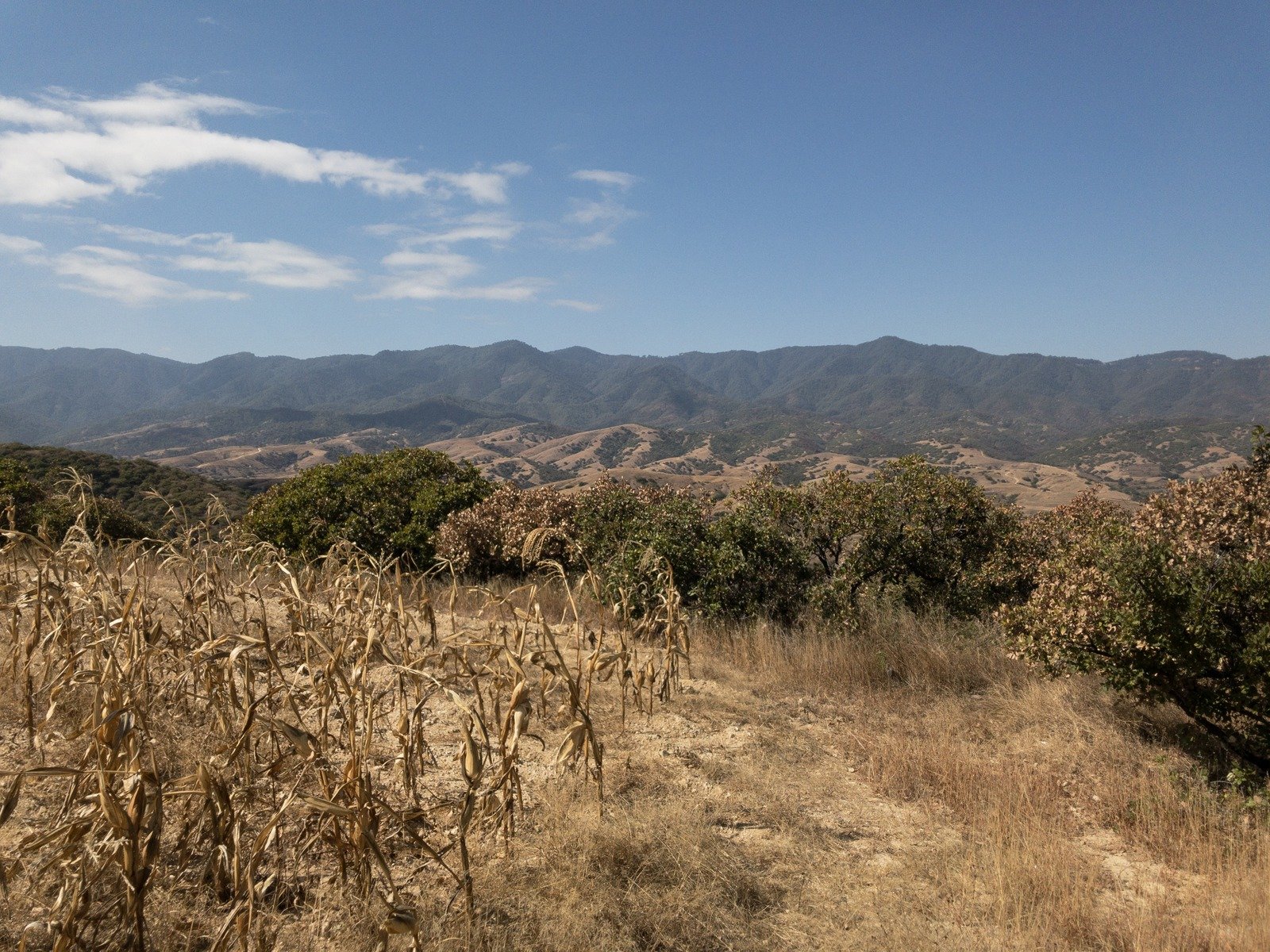 This hike follows a dirt road for its full distance. The first mile or so passes through the outskirts of Ixtlahuaca, then starts a gentle climb up towards the ridge that separates two rivers. Along the way one will see numerous small corn plots, most all of them on a slope, in some cases a steep slope. Because of the size and the terrain, it is apparent all are tended by hand or with the assistance of oxen. Few of the fields had been harvested, the ears removed from the stalks, the stalks left standing.