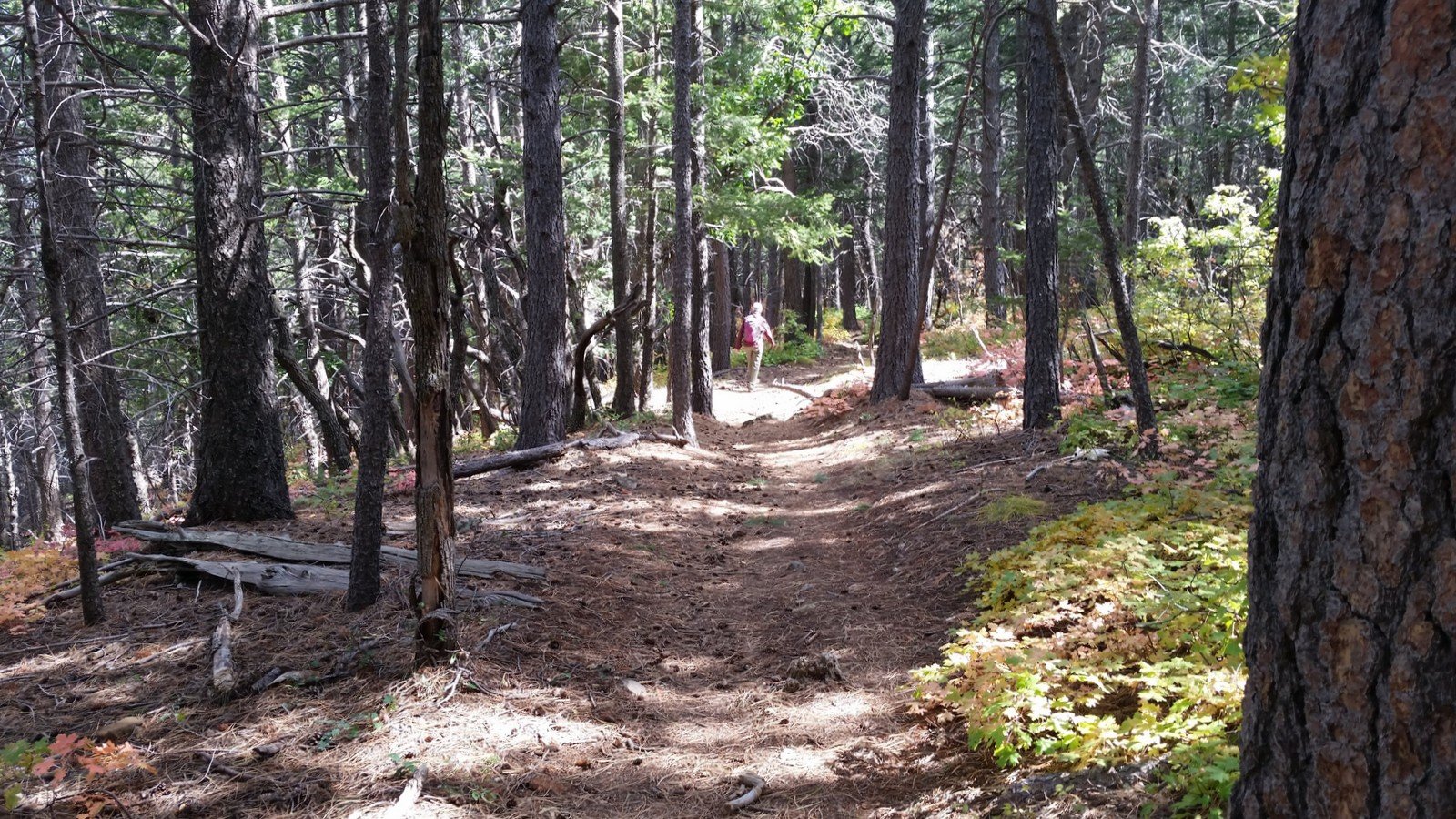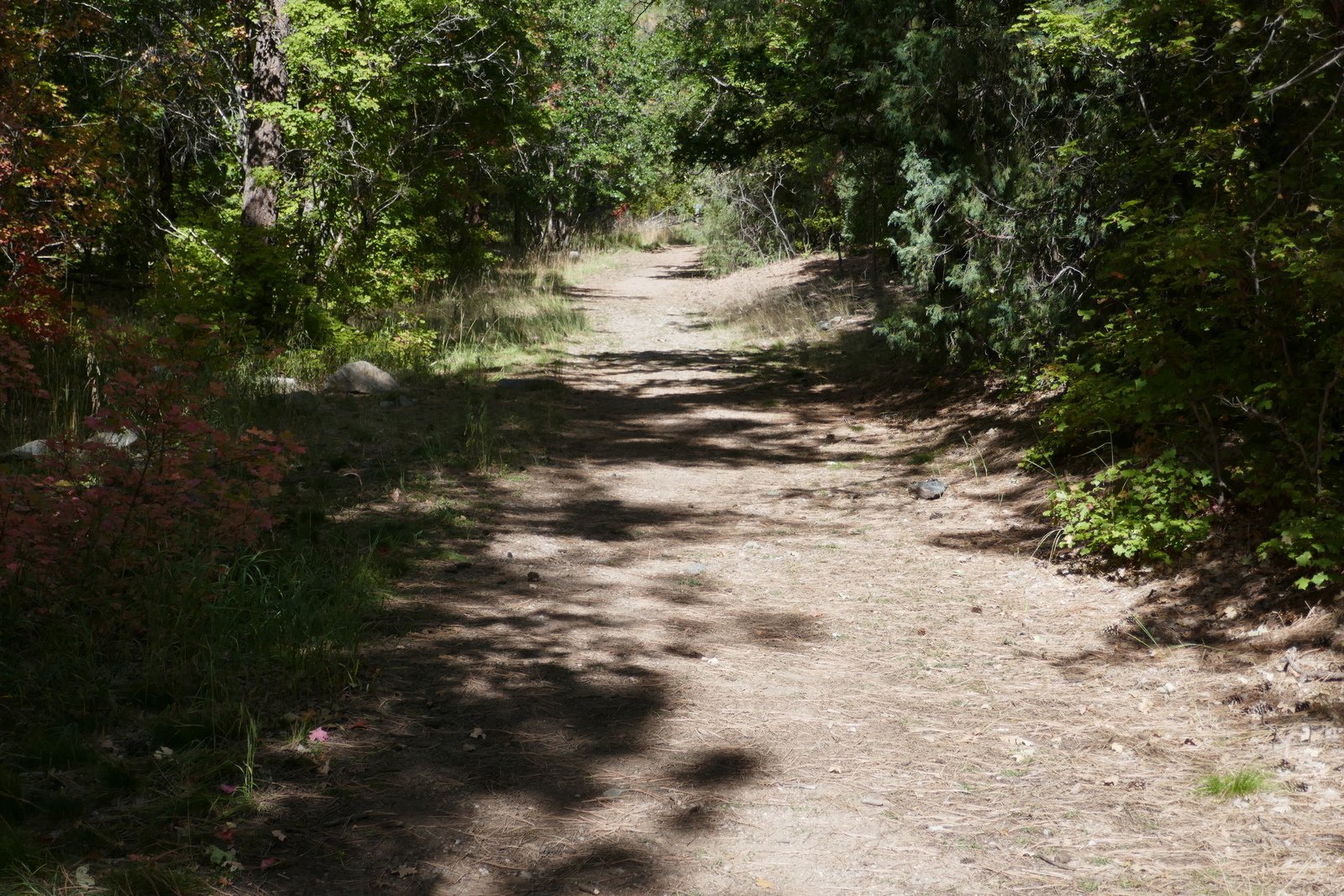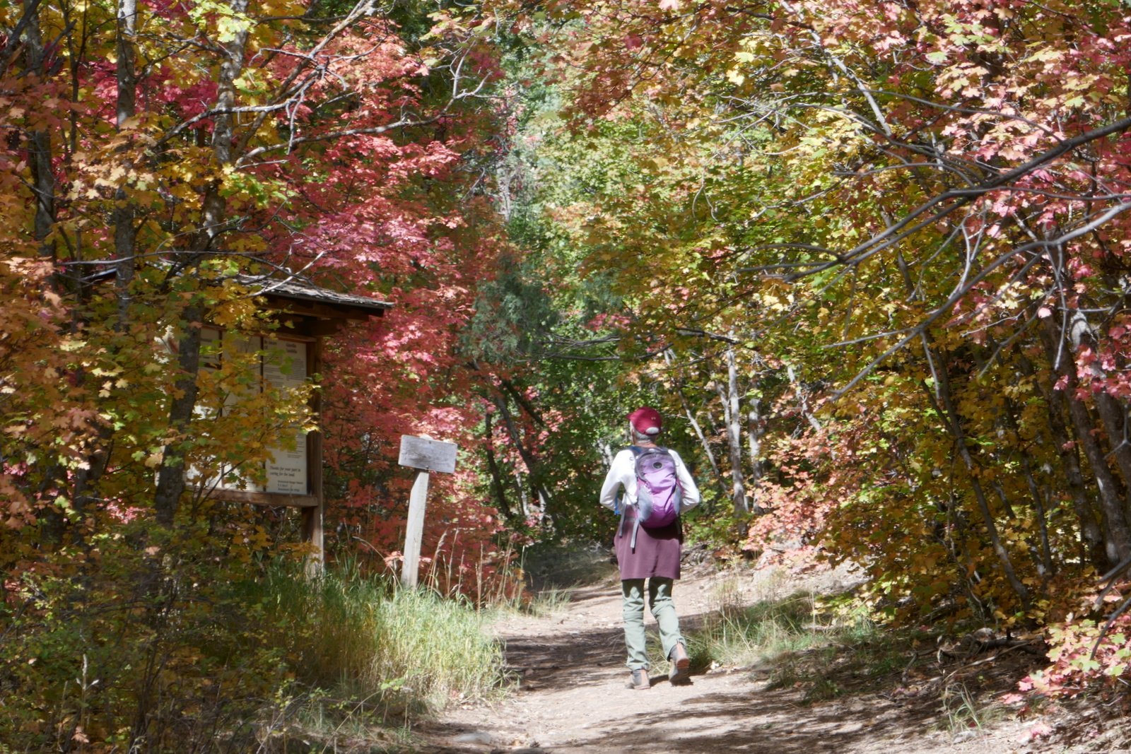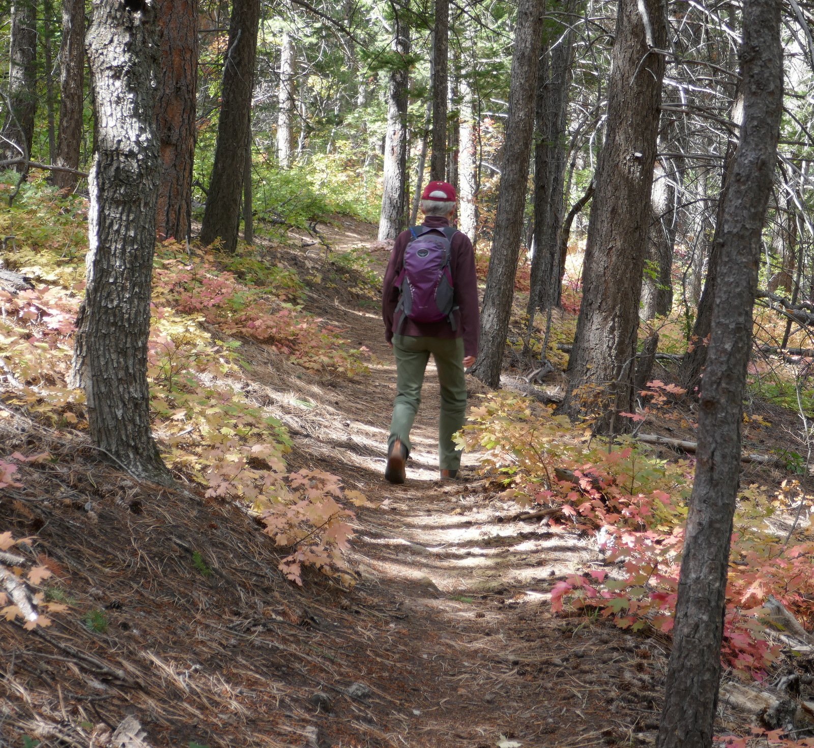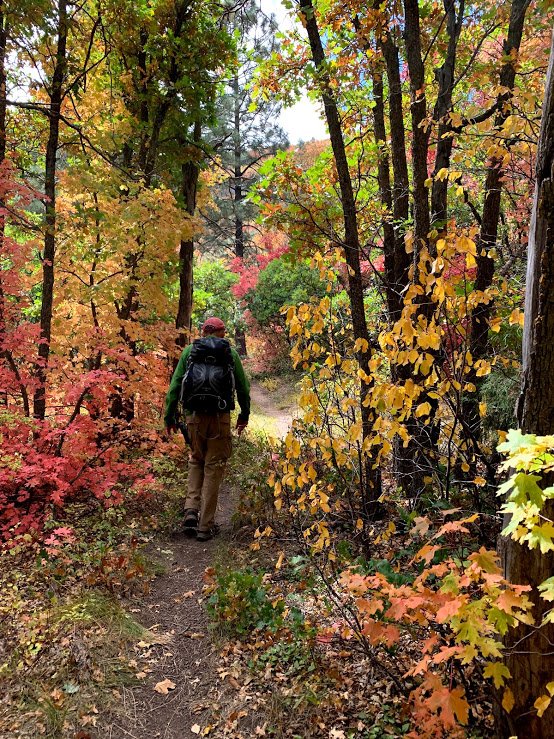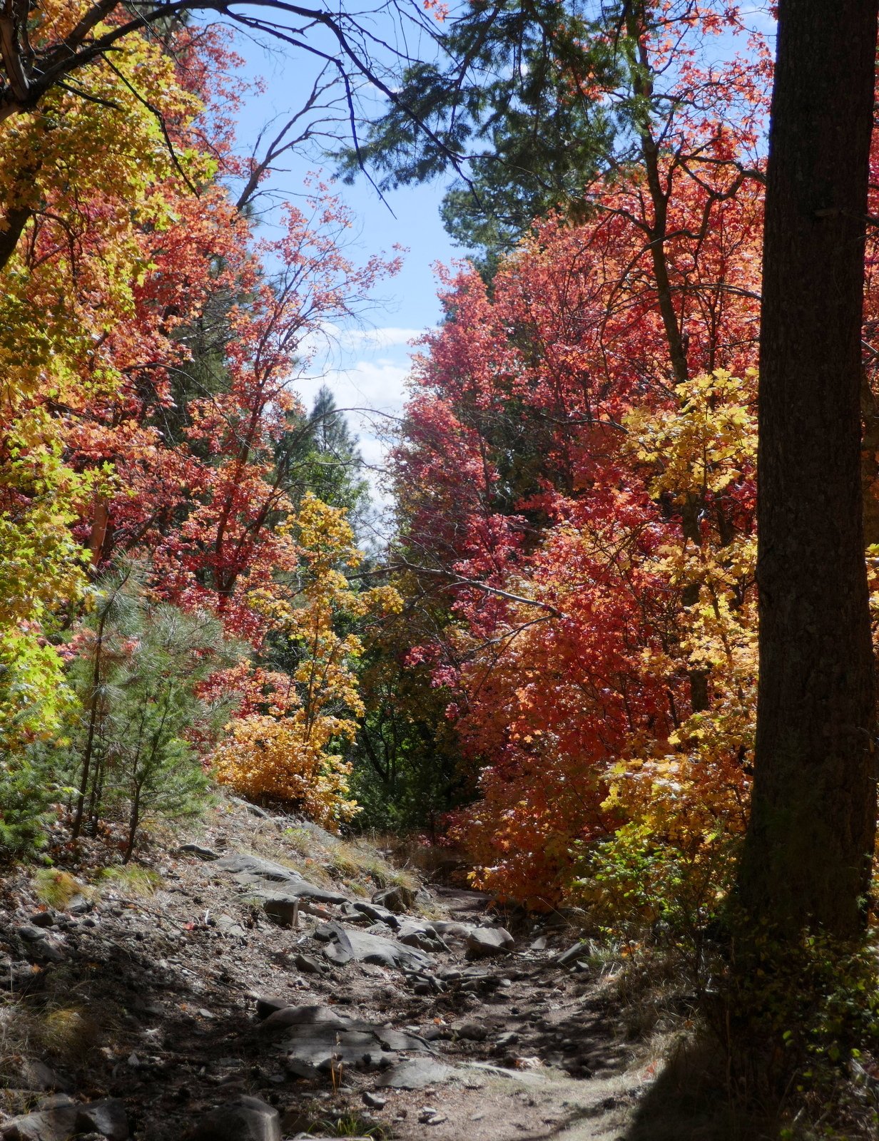 After passing the Lower Fourth of July Spring, the trail becomes a bit more challenging with more rocky surface in spots and a gentle but constant climb (after all, 1,100 feet in some 2 miles). Midway up the trail, after passing the Upper Fourth of July Spring, sections of the trail level out, are smooth and covered with pine needles – very easy hiking. Past the half way point, we had a view of higher elevations and the amazing colors in the mixed forest.