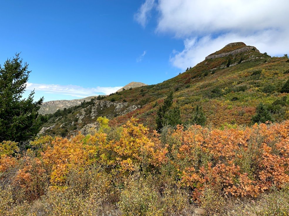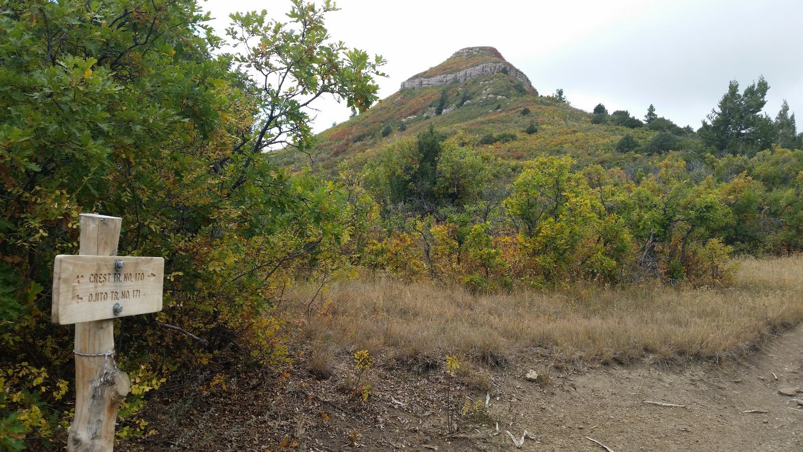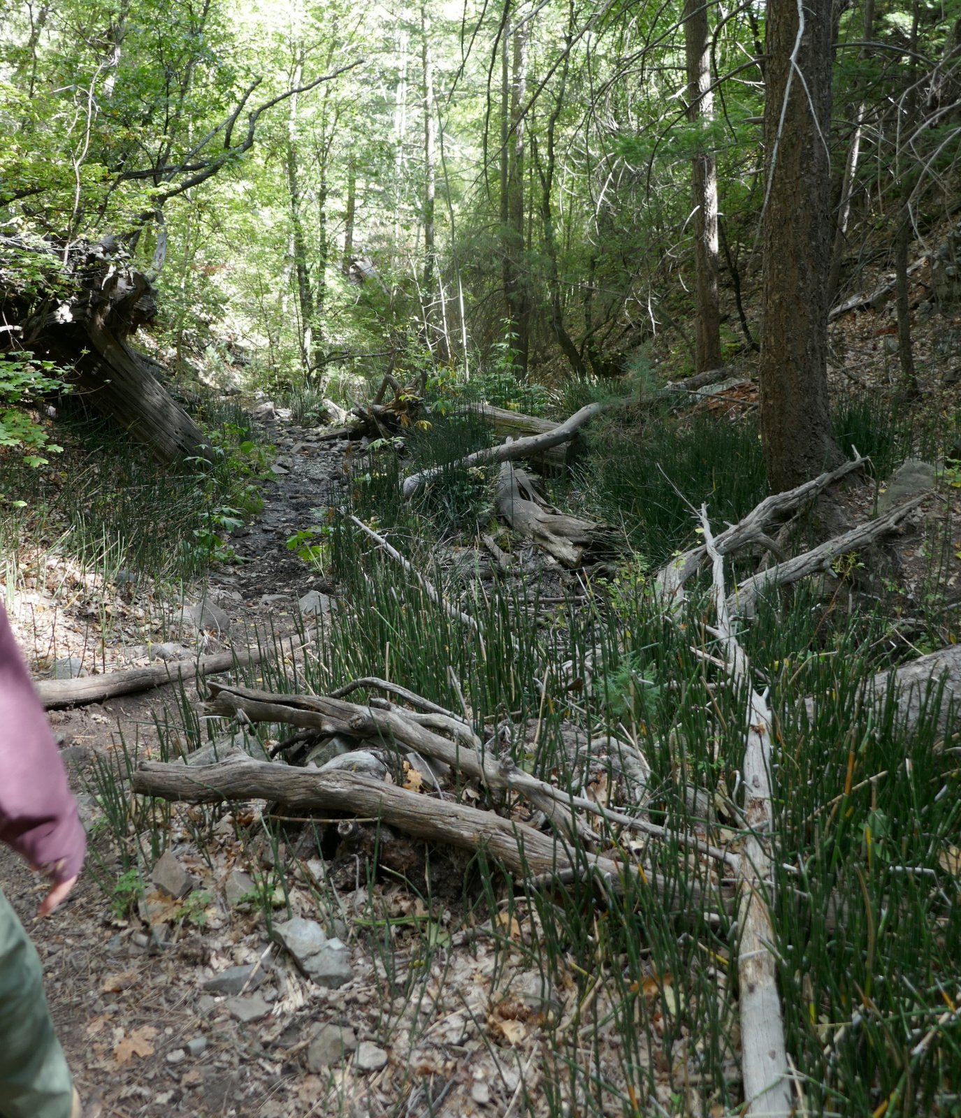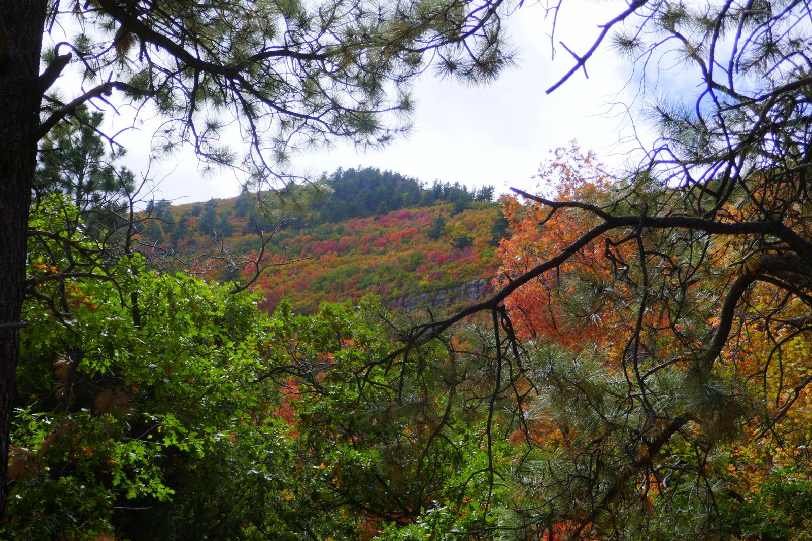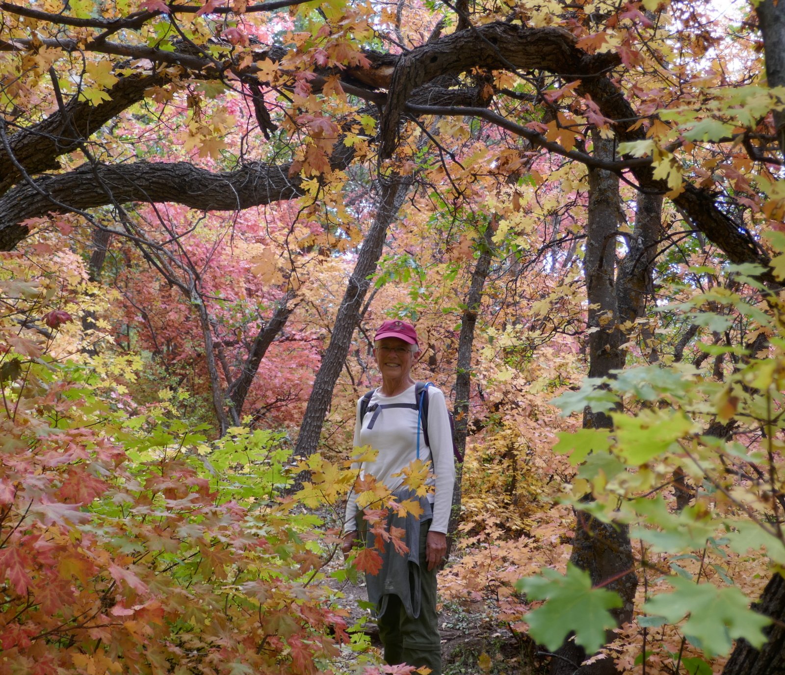 After passing the Lower Fourth of July Spring, the trail becomes a bit more challenging with more rocky surface in spots and a gentle but constant climb (after all, 1,100 feet in some 2 miles). Midway up the trail, after passing the Upper Fourth of July Spring, sections of the trail level out, are smooth and covered with pine needles – very easy hiking. Past the half way point, we had a view of higher elevations and the amazing colors in the mixed forest.
