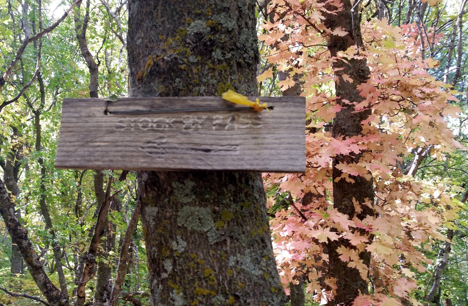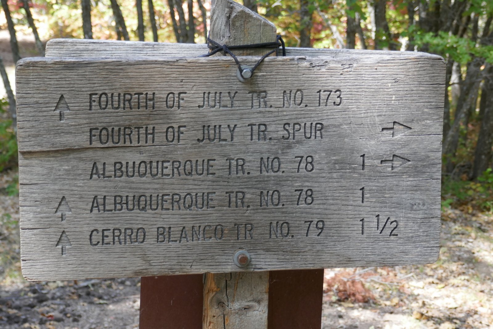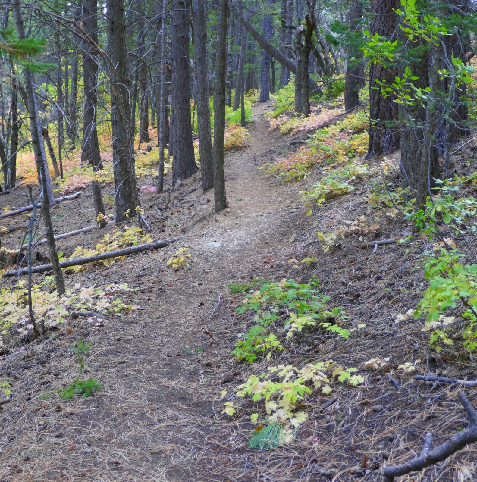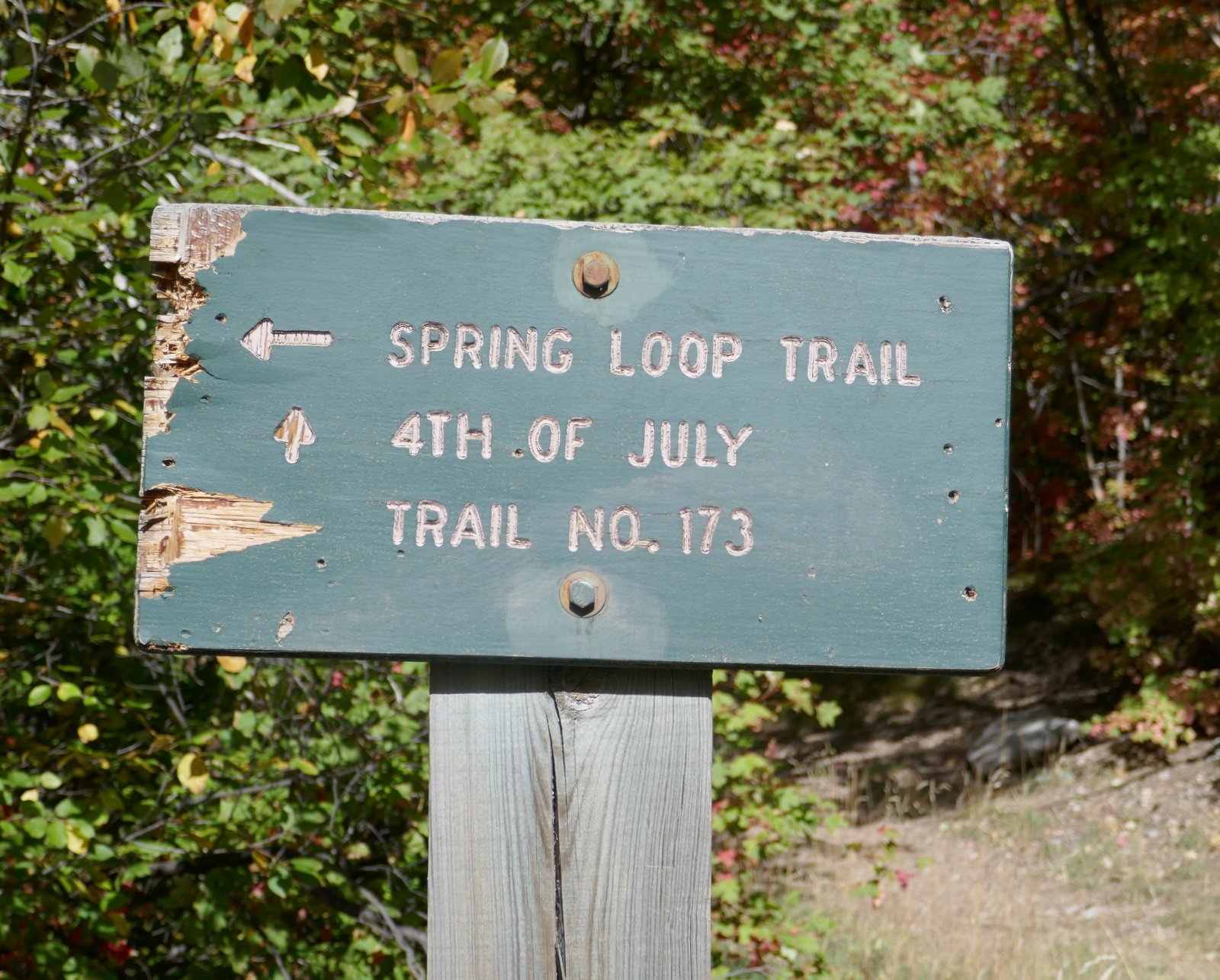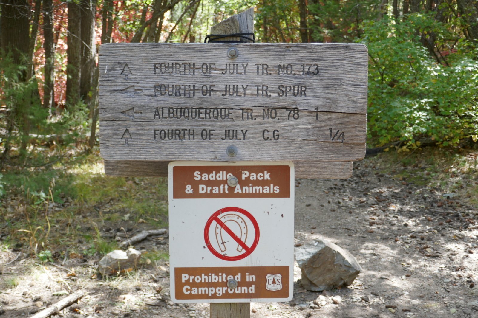 The Fourth of July trailhead, at the far (west) end of the campground, is clearly marked and starts out as a ‘thoroughfare’ trail (see the photos in the Gallery below). Signs, and the Welcome Board, leave no doubt which direction to proceed at each intersection going up the trail. The area is replete with maple trees, and this first week on October is perfect to enjoy their colors.