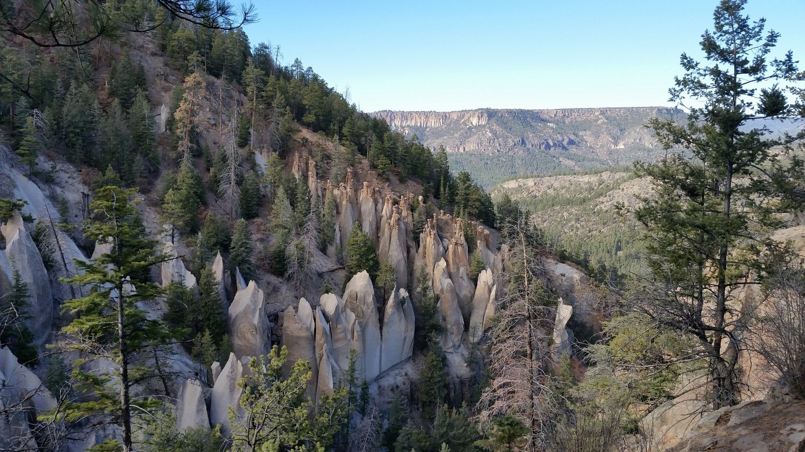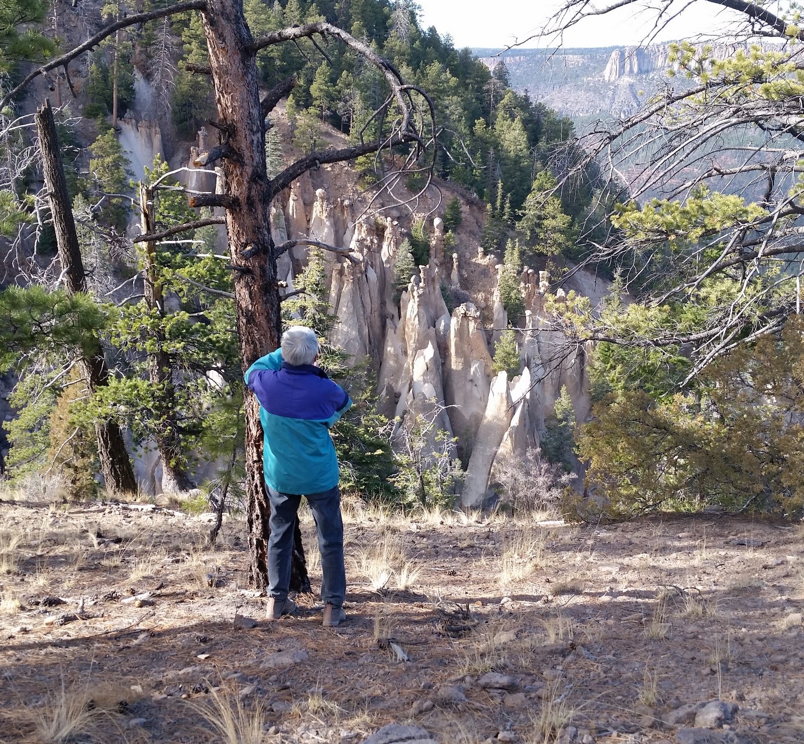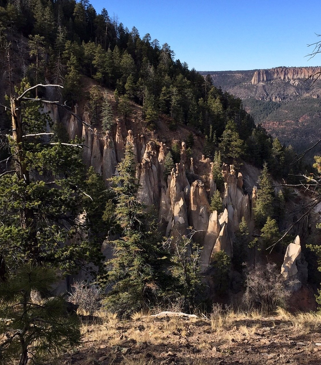 We parked and began hiking down the road with a couple of diversions toward the edge of the mesa for the impressive views down into the East Fork of the Jemez River. (We thought we were looking down upon Jemez Falls, which we visited recently. At home, looking at Google Earth, we were some distance downstream from the Falls; the view was spectacular none the less.) The second diversion led us to an area ideal for camping; with road access and opens pace, it is on our list for future overnight trips. And, from this vantage point, we looked down upon an amazing array of hoodoos; check out the photos below.