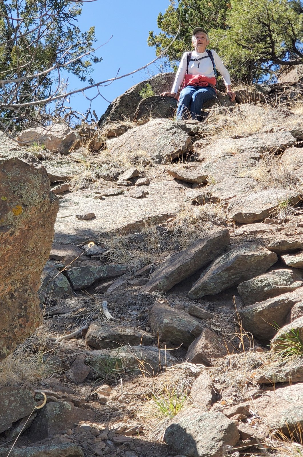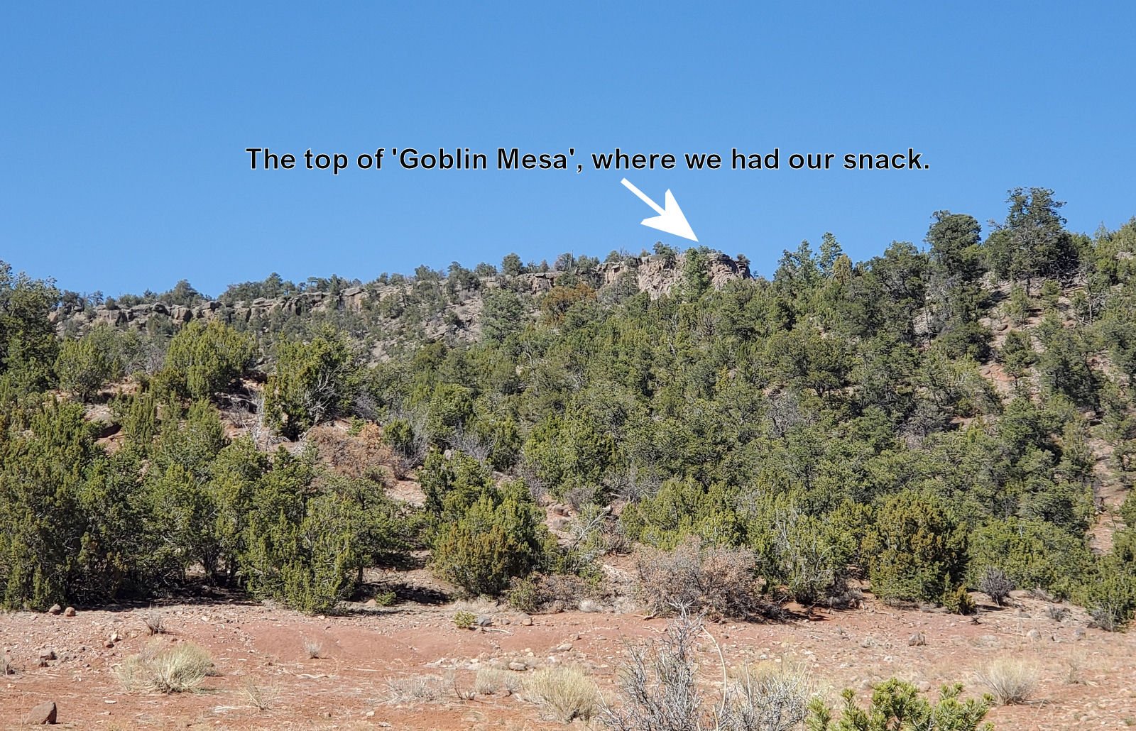 Normally, we’ve taken the wash to the Colony. But today – we diverted to explore potential camping sites, looking for level ground on the hillside above the wash. So we climbed 50′ to to the first area, then 150′ to another; and then without a real plan we continued climbing up the side of this small mesa (I can’t find a name for it, so I’m dubbing it “Goblin Mesa”, in honor of the Colony). And we continued climbing.