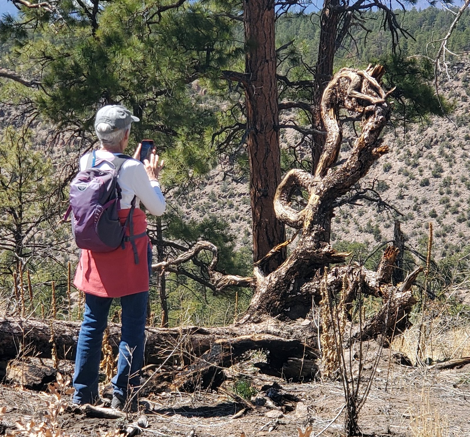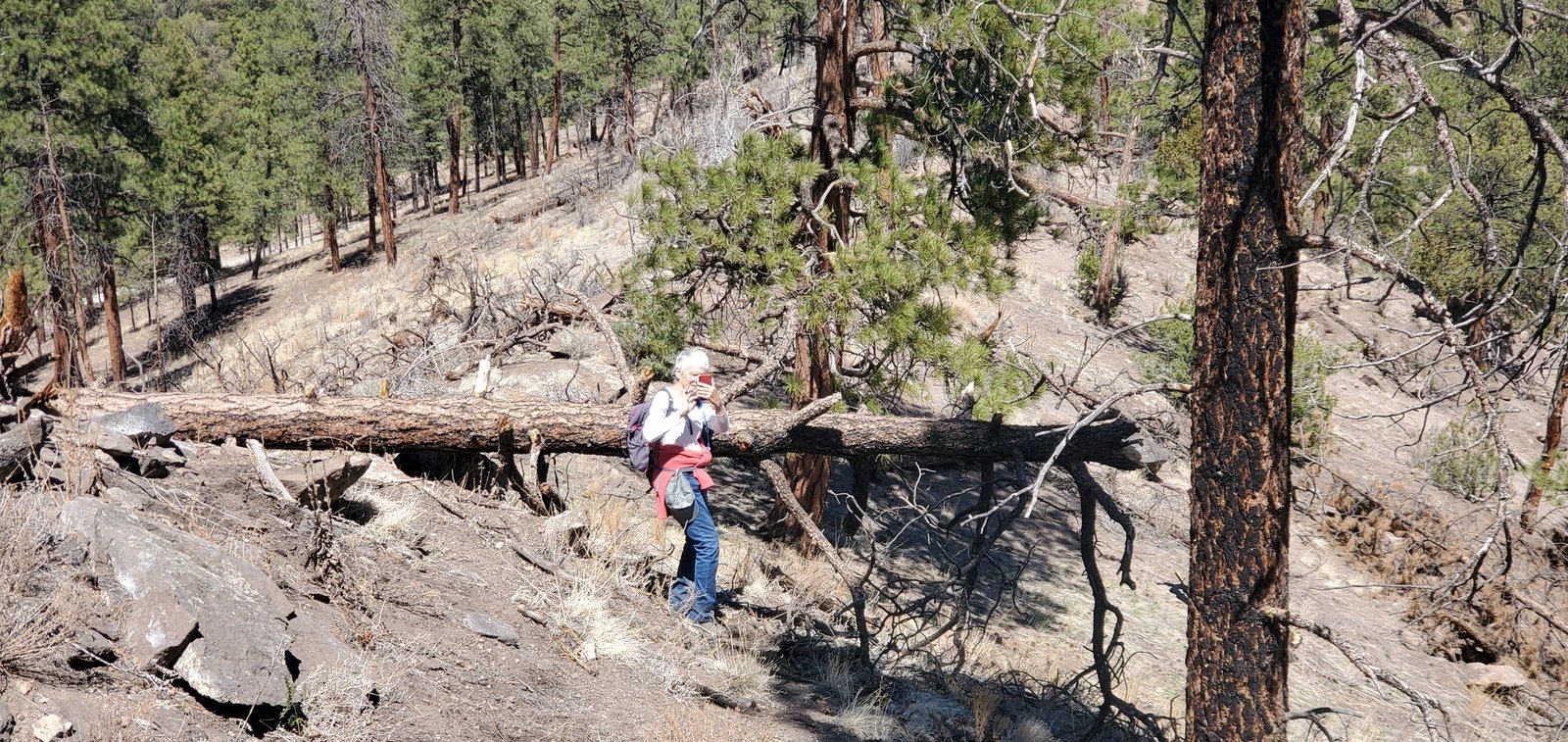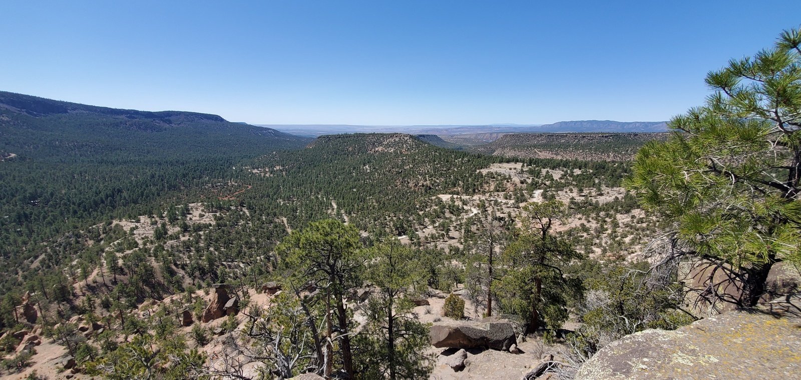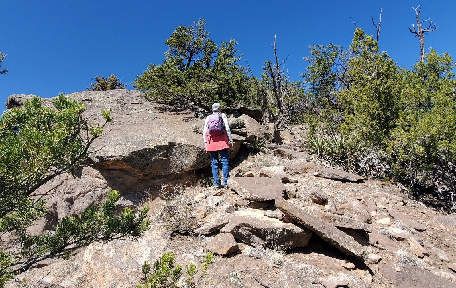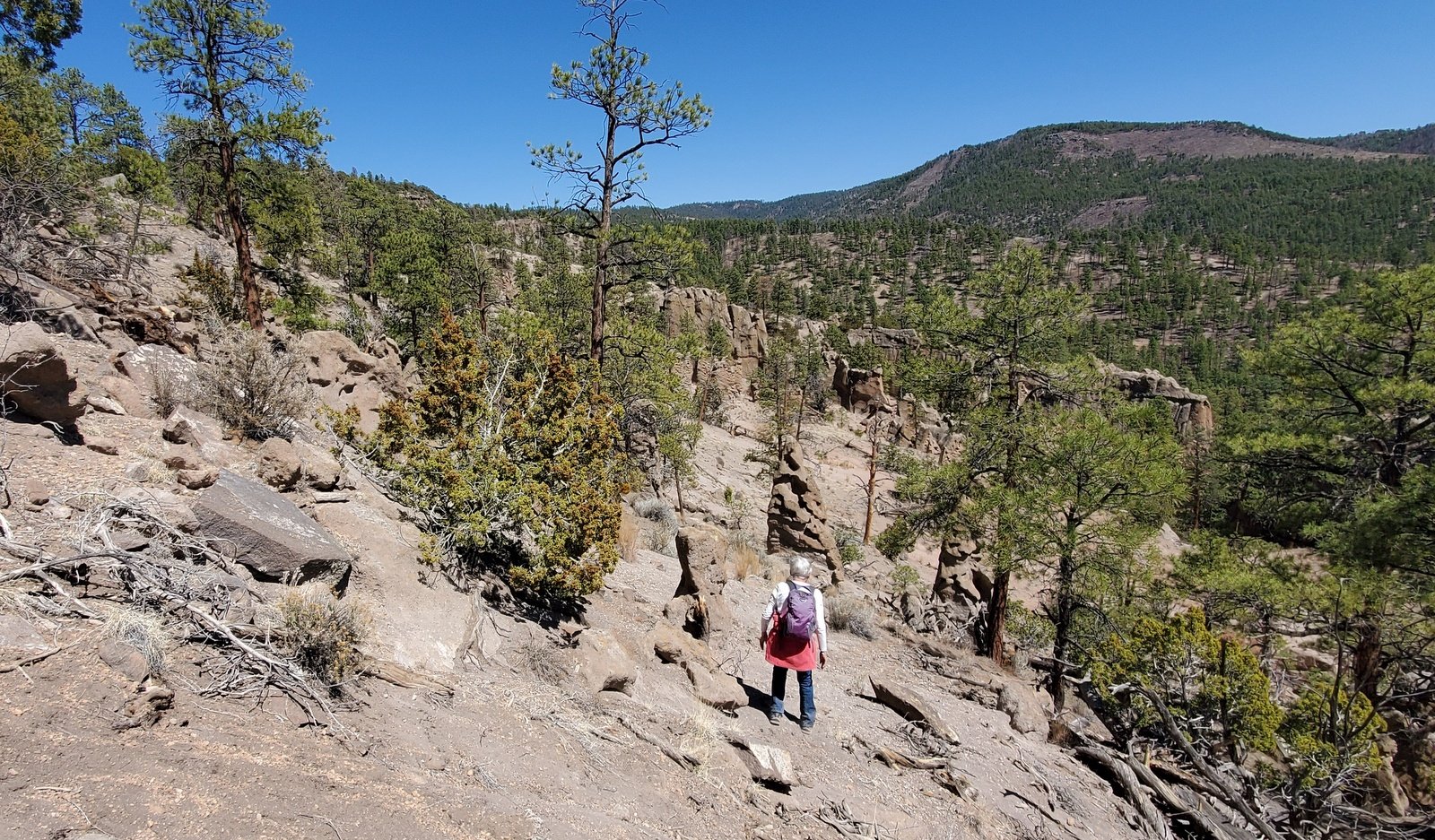 We gave only momentary thought to descending the way we came up. After checking the topo map (on USTopo, the GPS app on my phone), we decided to take our chances that there would be a easier descent (& safer!) at the other end of the mesa. The hiking along the mesa was easy with some rocky areas and a fair amount of deadfall in some areas (it appeared to be wind-blown where the mesa narrowed, exposing the trees to the strongest winds).