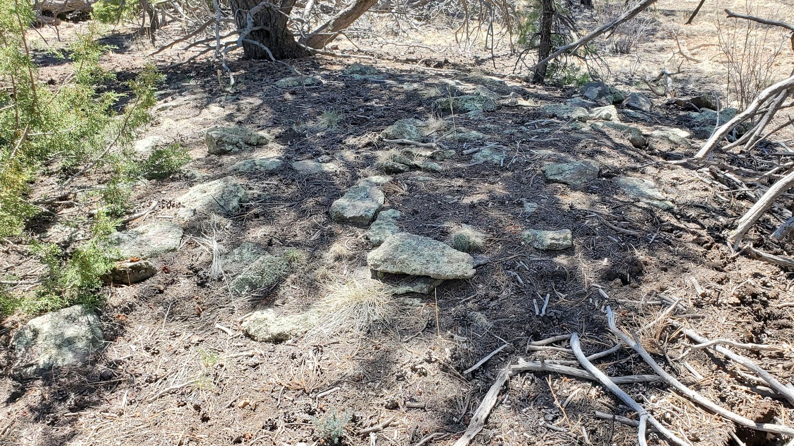 From visits to various sites of Pueblo ruins, I suspected there might be a Pueblo ruin of some sort on this mesa; I was on the lookout for any sign of a ruin. And I did spot a mound with lots of rocks strewn across it, which did not look like something Mother Nature would have formed. I’m convinced it is a small (15’x15′) ruin site.