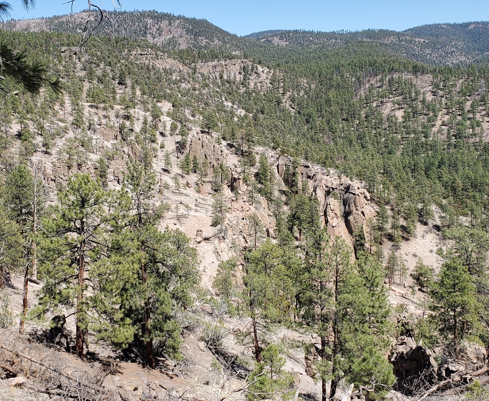 As we neared the top, of course it became more and more steep, until the last 100′ we were scrambling up a rock and gravel slope, about 45°. But we gained the top of Goblin Mesa. We found ourselves on flat & level rock surface that forms the end of the mesa, with an edge that was -vertical-, dropping precipitously a few 10s of feet. From this vantage point, where we paused for a snack, we took in the marvelous views of the canyons and mesas of this part of the Jemez Mountains.