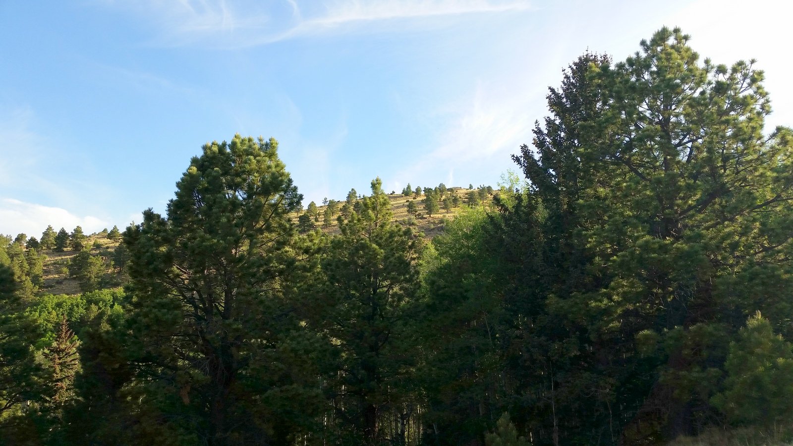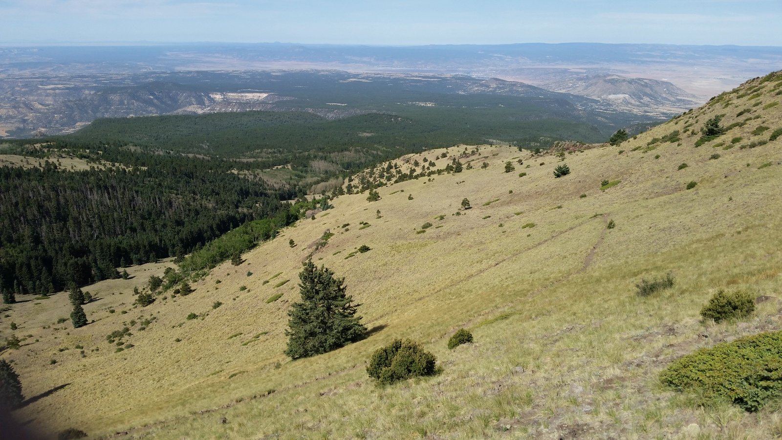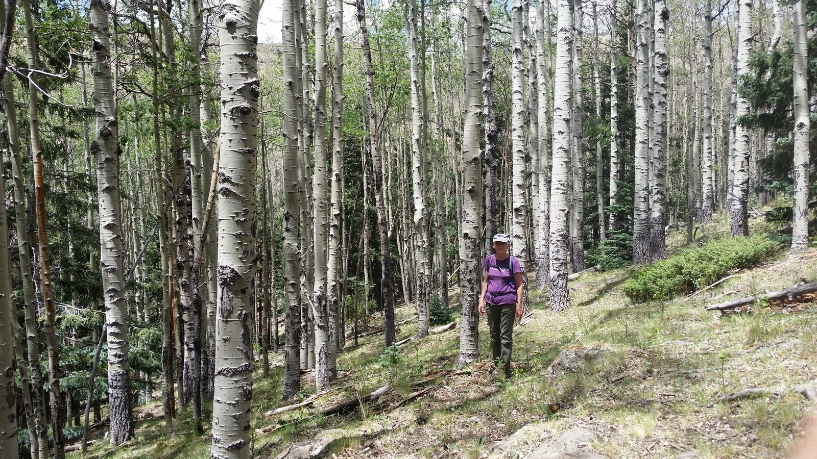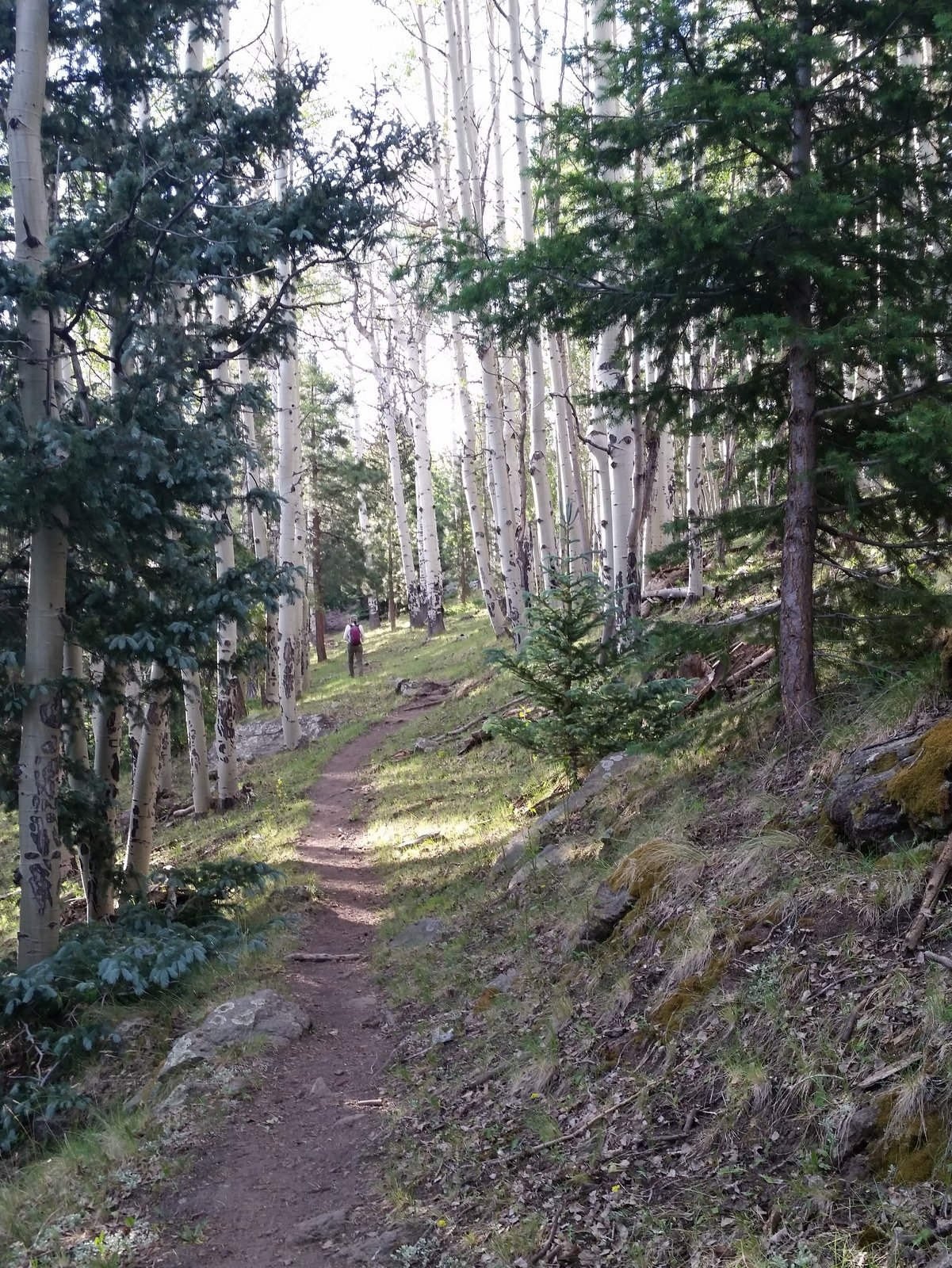 Close to a mile from the summit on the way down, we opted to follow the ‘canyon’ towards -the- Gooseberry Spring. ‘Tho not a marked trail, we found ‘trails’, tracks left by cattle, elk or deer, a maybe people, that were easy to follow and allowed us to remain in shade (the temperature was rising and the sun intense). For a short time we rejoined -the- Gooseberry Trail, but then descended again into the ‘canyon’ and followed it until the point where the Trail crosses the ‘canyon’. From there it was about 2/3rd of a mile back to the truck.