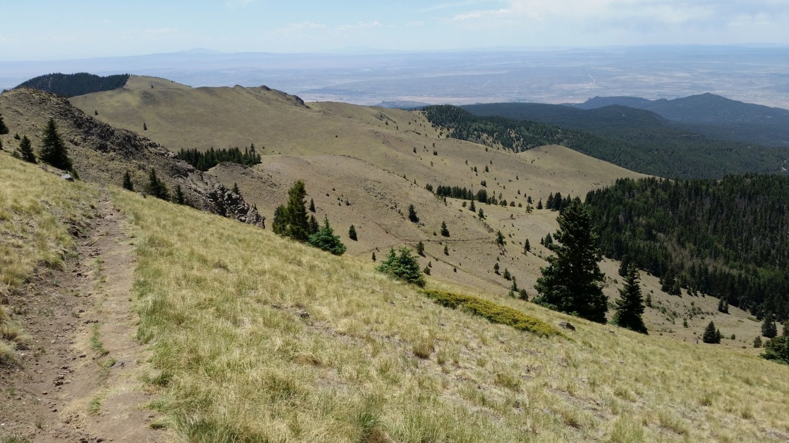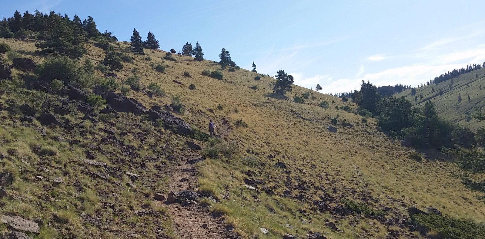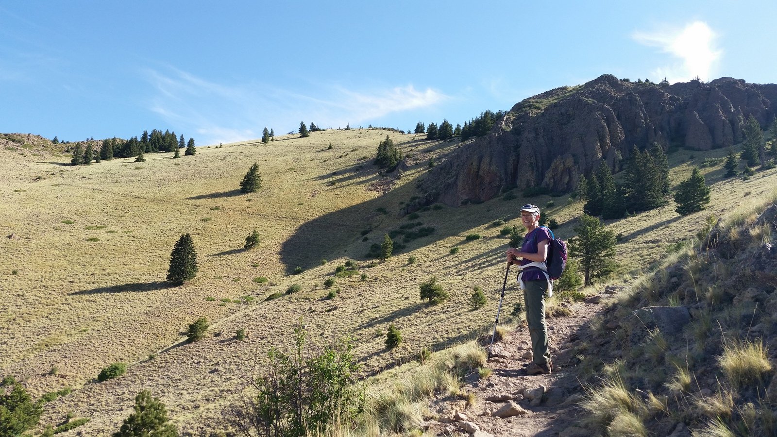 Nearing the location of our mid-hike break on the previous hike, above the tree line on this side of the mountain, we headed up towards the summit. The trail continued to be a moderate slope, well used and easy going, ‘tho on fairly steep hillsides. The views to the east, south, and west were glorious, despite the hazy atmosphere. And the views of the surrounding slopes of the mountain were stunning, particularly in the light of the early morning sun. An occasional rock outcrop added another dimension of Mother Nature’s beautiful work. ‘Tho it has been hot at lower elevations, the early start coupled with the upslope breezes made the weather conditions quite cool and pleasant.