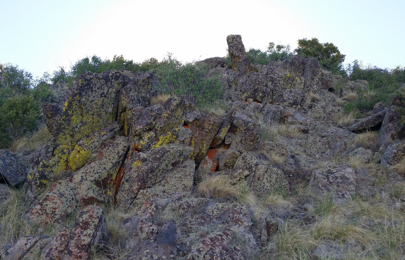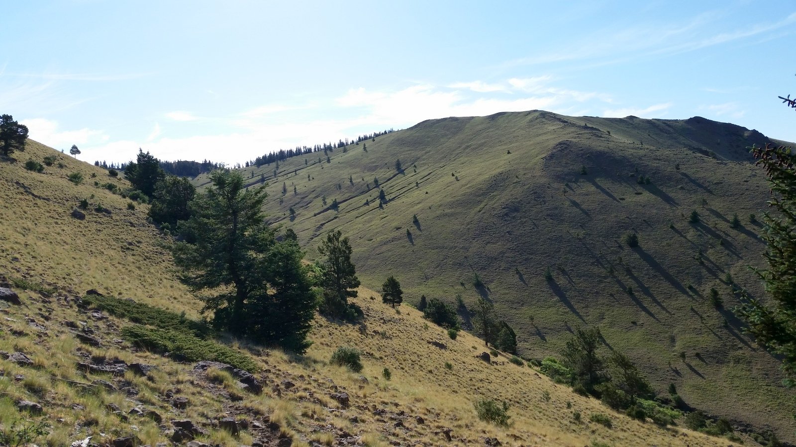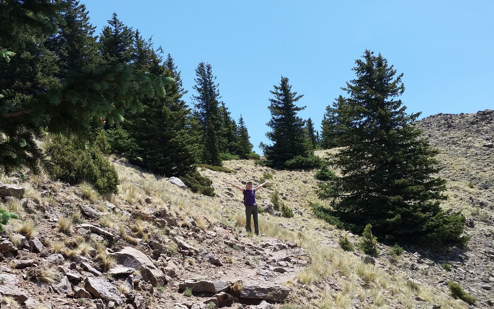 Nearing the location of our mid-hike break on the previous hike, above the tree line on this side of the mountain, we headed up towards the summit. The trail continued to be a moderate slope, well used and easy going, ‘tho on fairly steep hillsides. The views to the east, south, and west were glorious, despite the hazy atmosphere. And the views of the surrounding slopes of the mountain were stunning, particularly in the light of the early morning sun. An occasional rock outcrop added another dimension of Mother Nature’s beautiful work. ‘Tho it has been hot at lower elevations, the early start coupled with the upslope breezes made the weather conditions quite cool and pleasant.