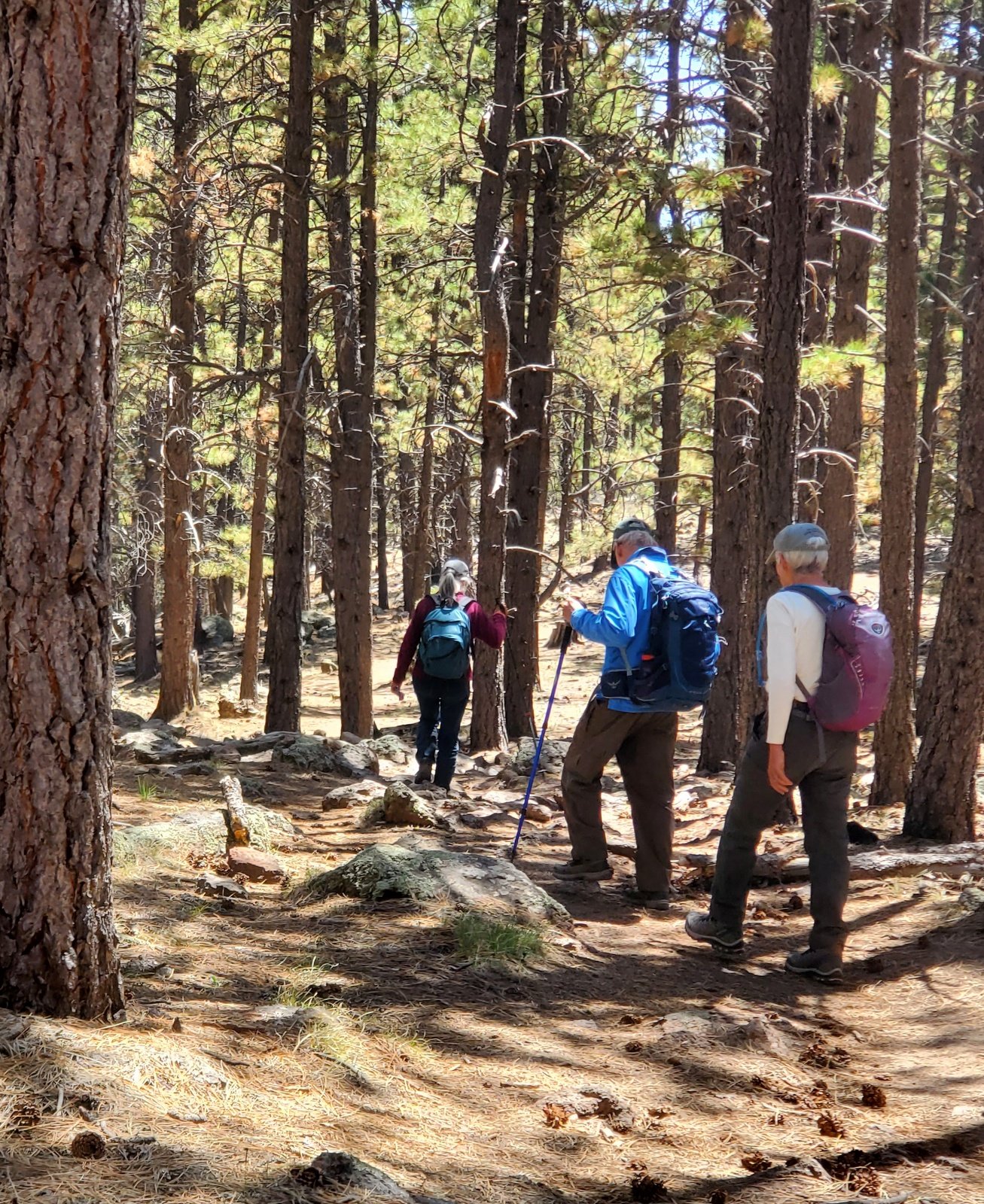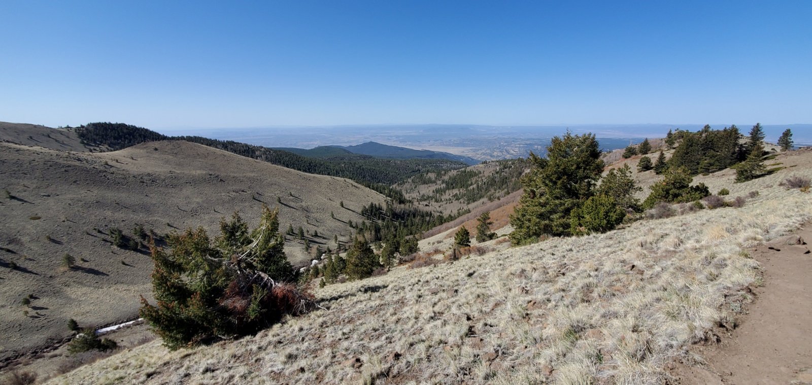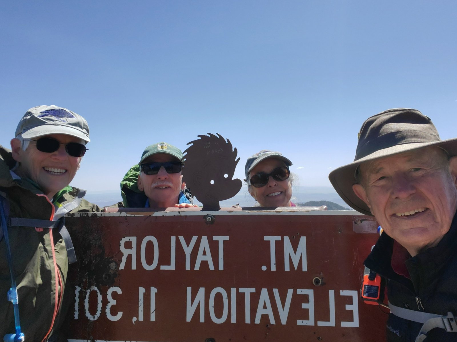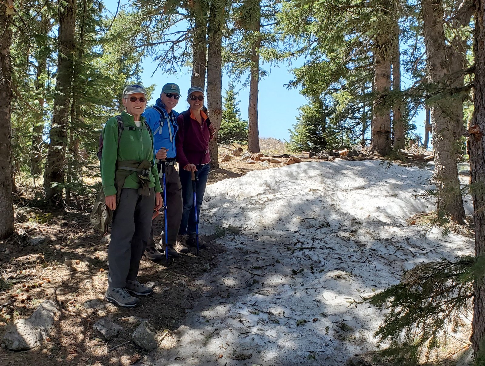 During our descent, we were reminded of our first hike on Mount Taylor back in 2018. Pat & I hiked to the saddle not far above the tree line. It was a great introductory hike and gave us perspective (and confidence) that we could hike to the summit. We returned two weeks later to ‘go to the top’. Reflecting on those experiences, and in conversation with Nancy & Jay, it occurred to us that others may hike to this half-way point, a bit more than half way in distance and half way in elevation gain. Such a hike would not be so strenuous and would give one great views all around, especially the last 1/4 mile along the east side of the ridge, with a beautiful view across Rinconada Canyon. Then descend, as we did, down into Goosberry Canyon, back to the Trail and to the trailhead.