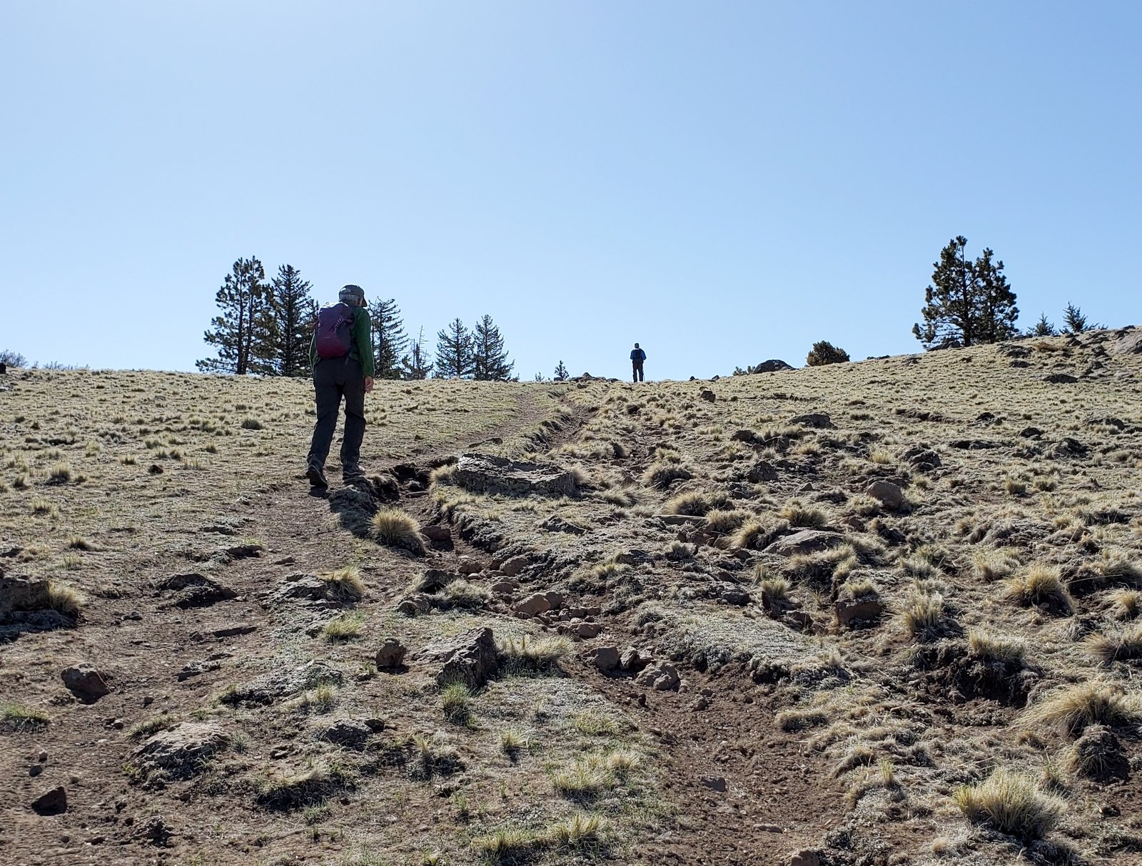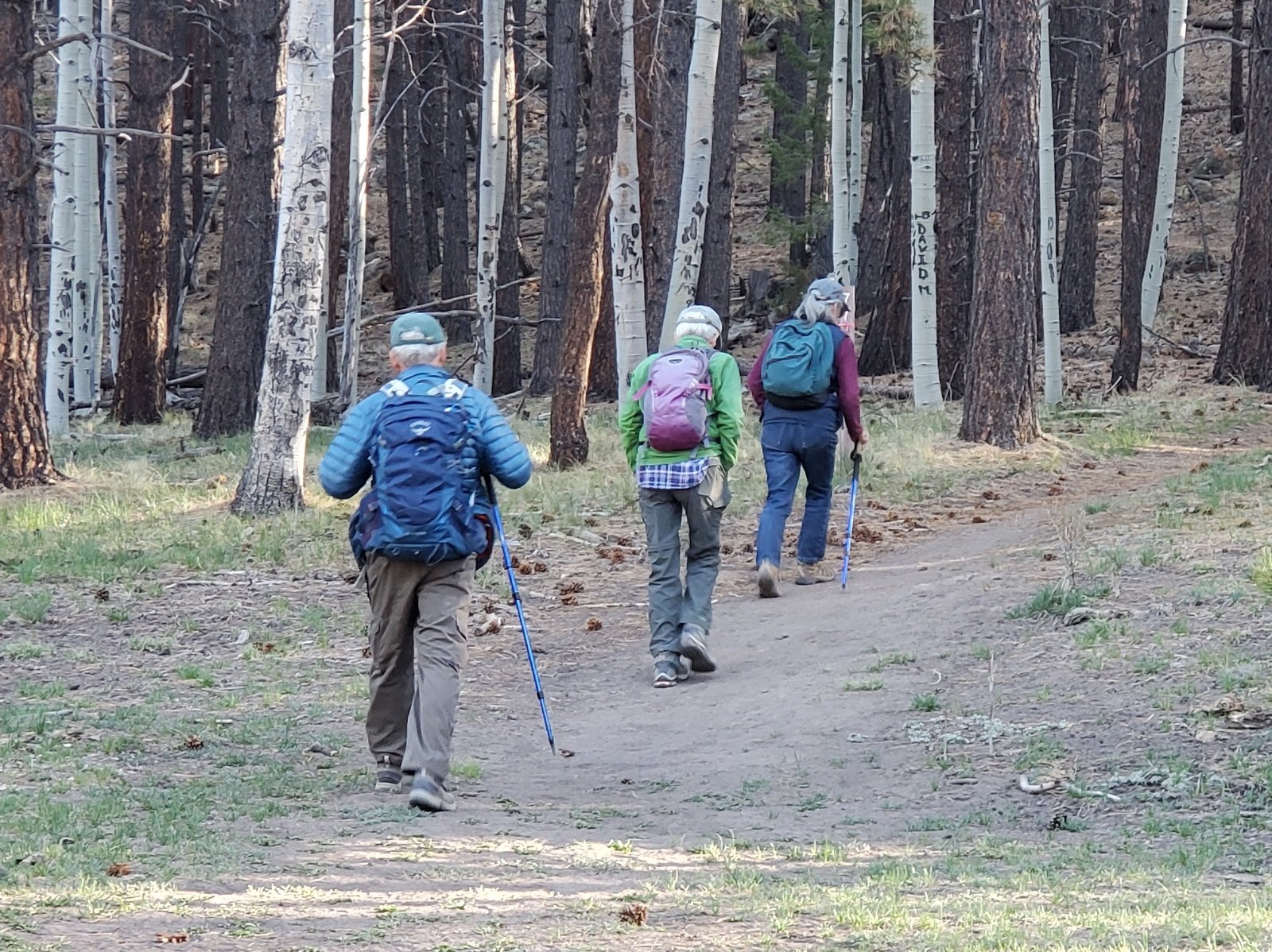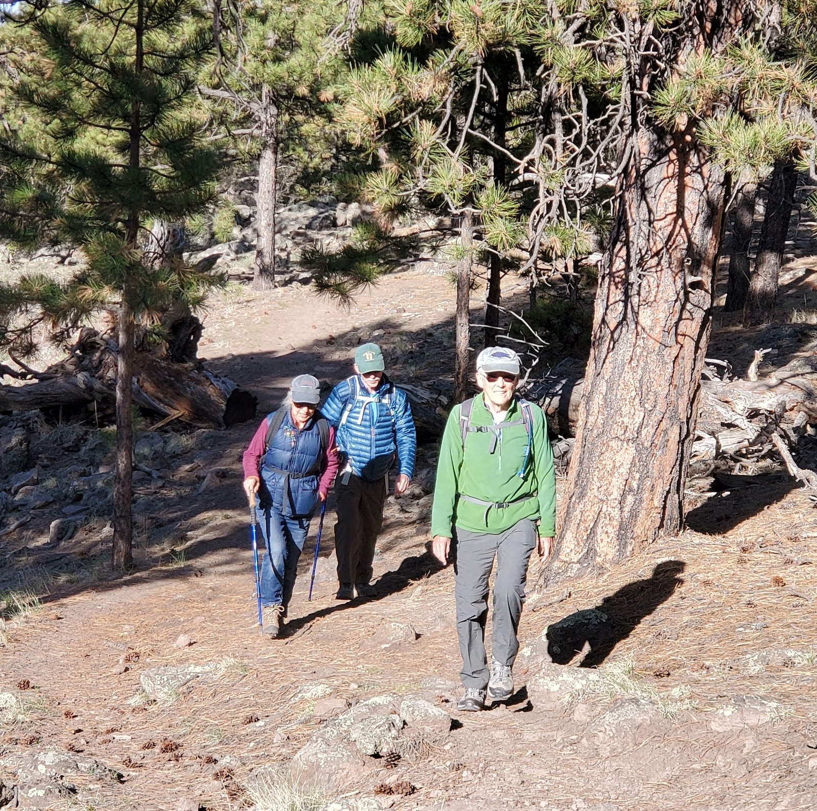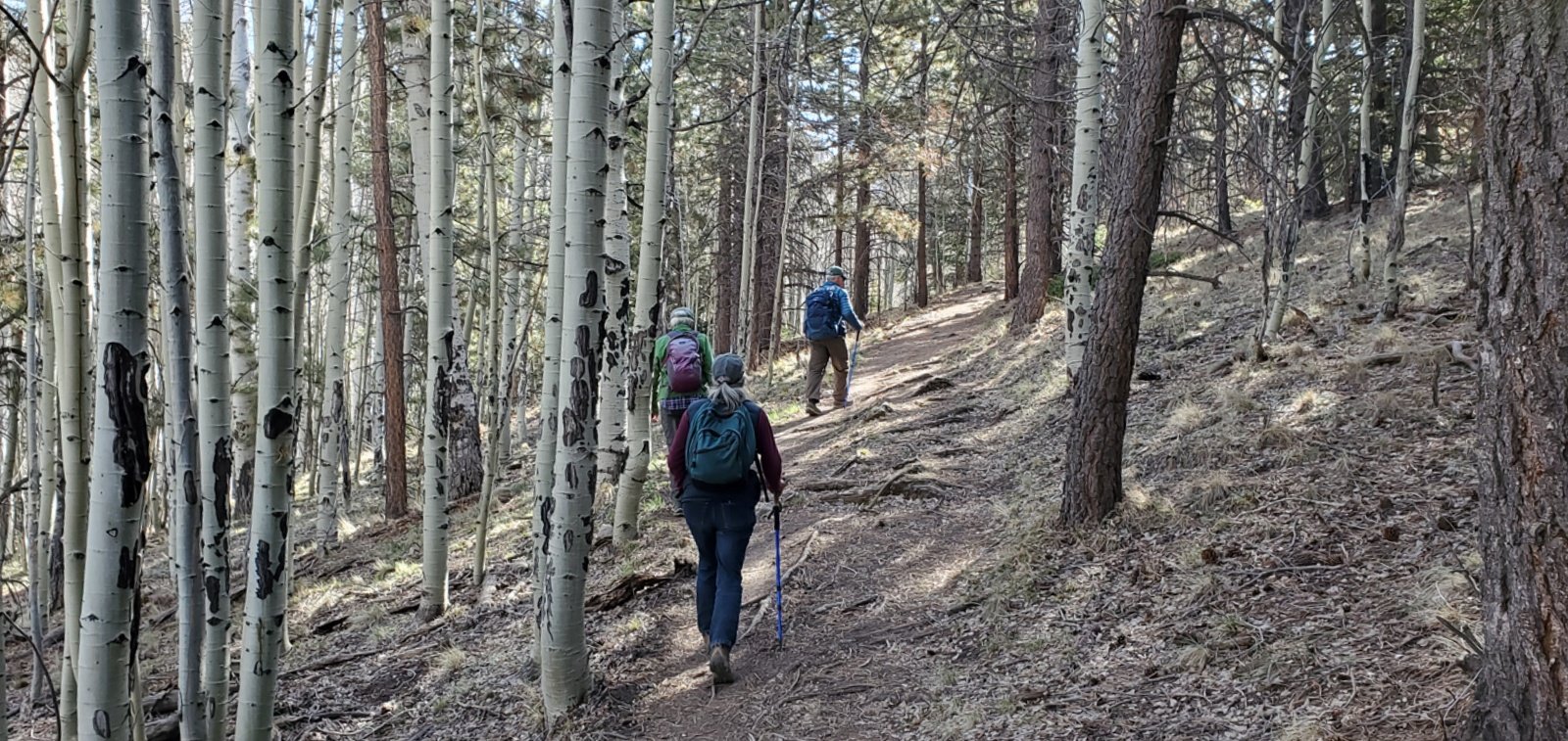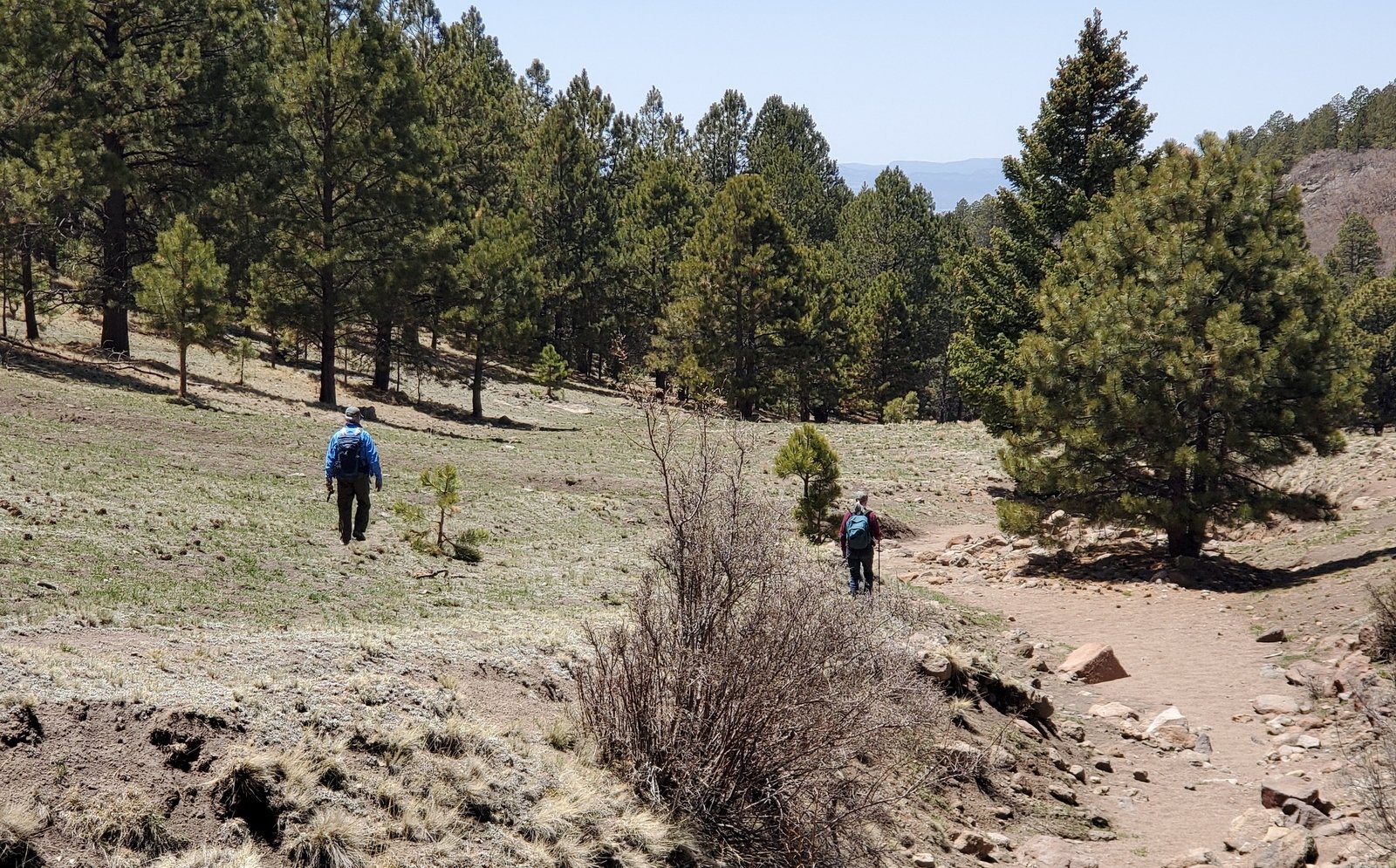 During our descent, we were reminded of our first hike on Mount Taylor back in 2018. Pat & I hiked to the saddle not far above the tree line. It was a great introductory hike and gave us perspective (and confidence) that we could hike to the summit. We returned two weeks later to ‘go to the top’. Reflecting on those experiences, and in conversation with Nancy & Jay, it occurred to us that others may hike to this half-way point, a bit more than half way in distance and half way in elevation gain. Such a hike would not be so strenuous and would give one great views all around, especially the last 1/4 mile along the east side of the ridge, with a beautiful view across Rinconada Canyon. Then descend, as we did, down into Goosberry Canyon, back to the Trail and to the trailhead.