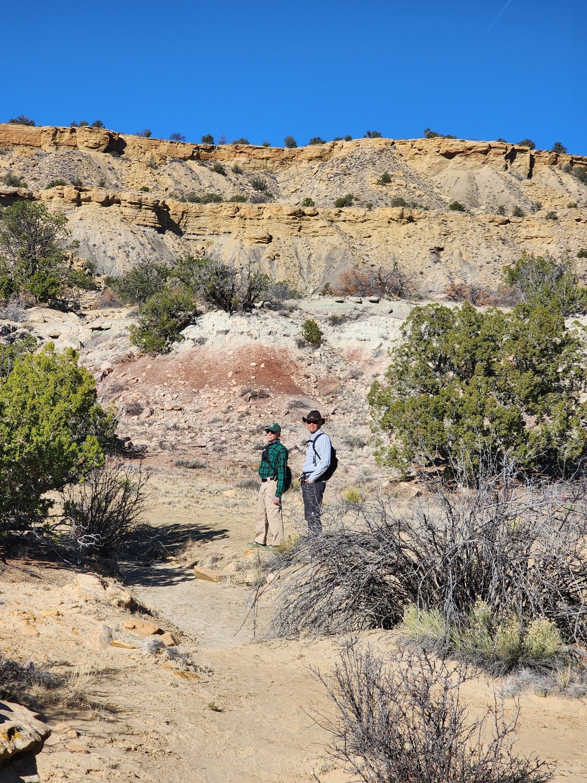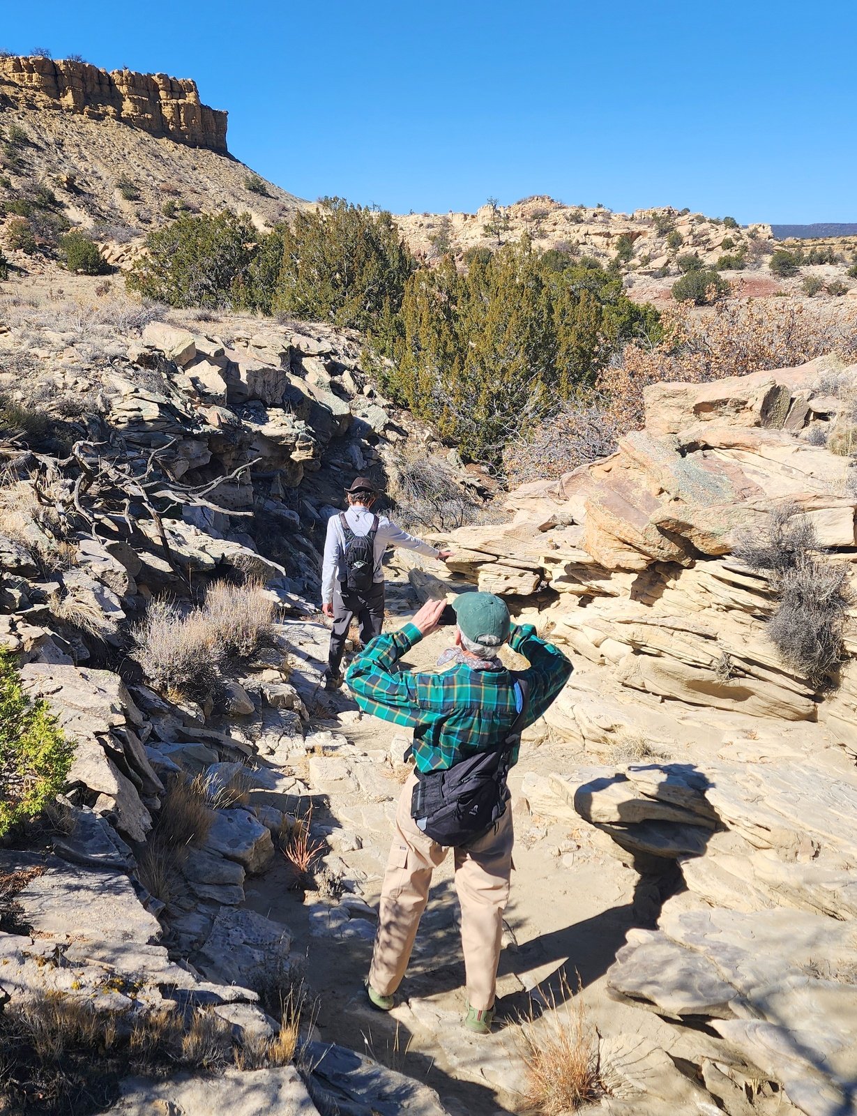 On this “High Route”, the trail was up-and-down, generally sandy on the level sections but rock-strewn on the ups-and-downs. All the while we were intrigued by the various layers of rock on the side of the mesa, and curious about which rock up high would be the next to tumble down (there were already many that had experienced that fate). We pressed on around the northern extension of the Mesa deciding at 2 miles we had gone far enough and headed back.