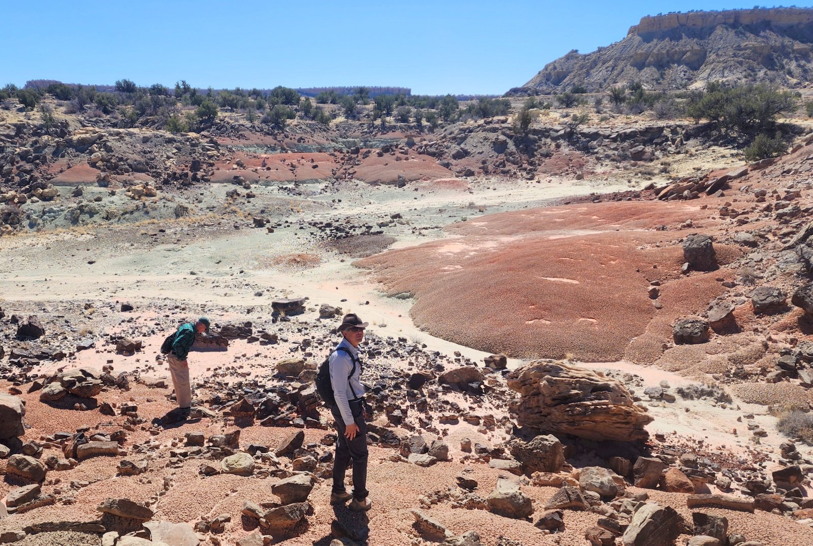 - The topography, with the sheer cliff of Bernalillito Mesa above us and others in the distance beyond one or another arroyo. And the many colors in the rocks or surface areas – rudy red, black, even a hint of purple or green here and there.