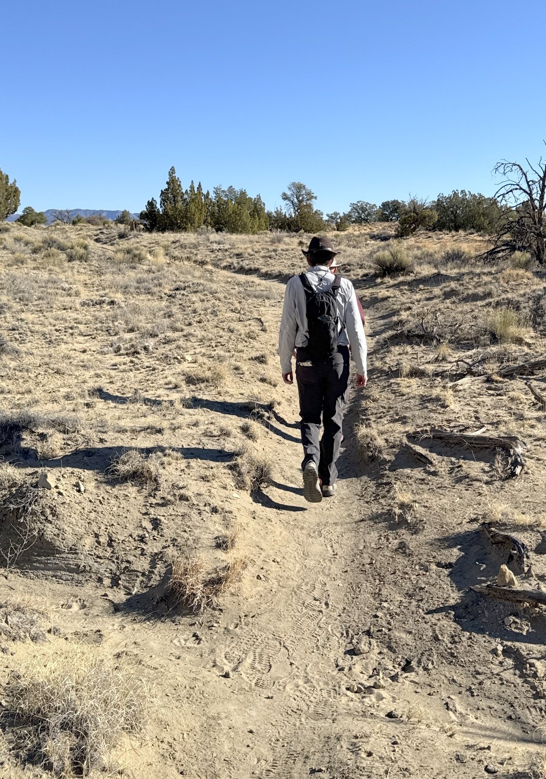 On our outbound leg, for the 1st mile or so, the trail was quite well used – sandy, wide, free of rocks. It presented a steady climb (almost imperceptible) towards the east extension of Bernalillito Mesa. Nearing the mesa itself we remained near the “cliff”, taking the “High Route” above the lower territory that was away from the Mesa. We
