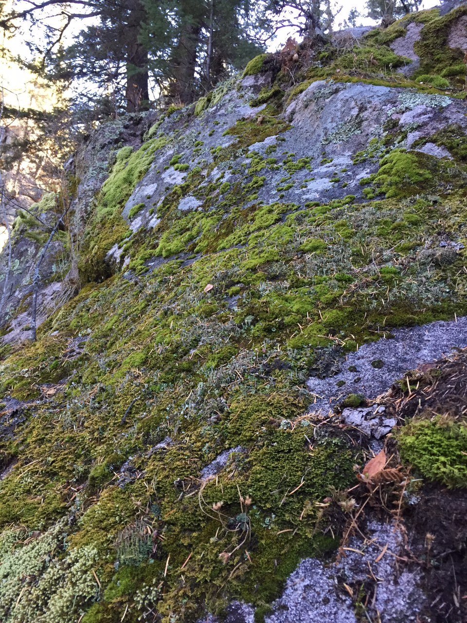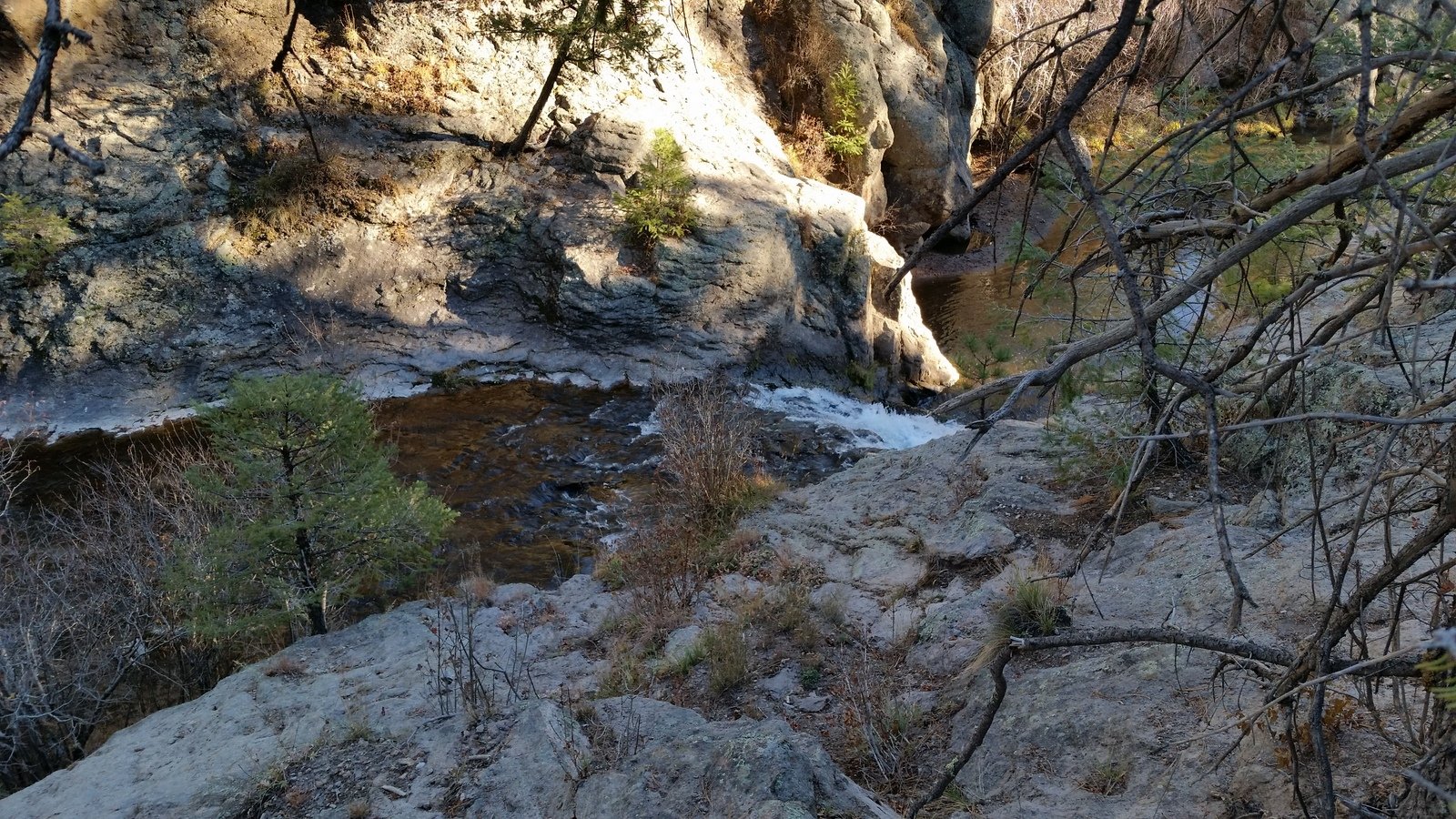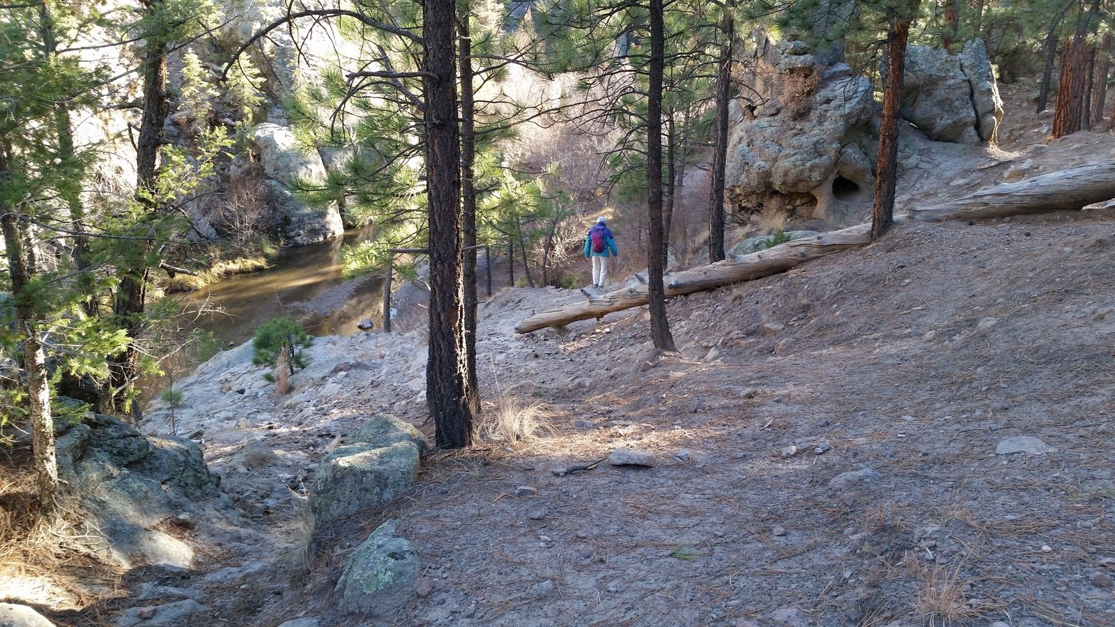 There is not much guidance at the parking area, so we started down what appeared to be a trail to the river. Yep, we found the river but no falls. We headed downstream but were blocked by the cliff face at water’s edge; it was either wade across or try another route. Since were along the river, we explored upstream until encountering another such blockage. ‘Tis quite pleasant, with the sound of water running over rocks and an environment as close to wetter climates as we’ve encountered in New Mexico.