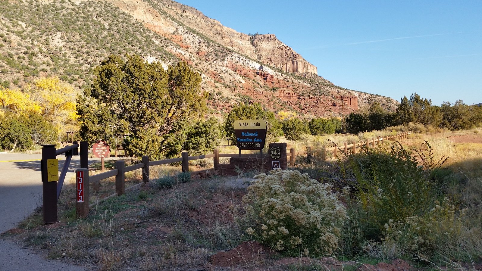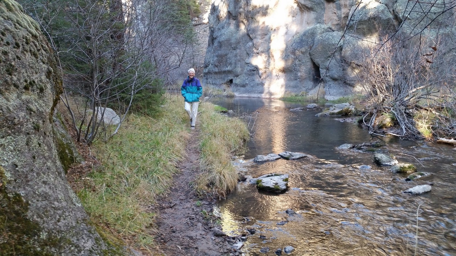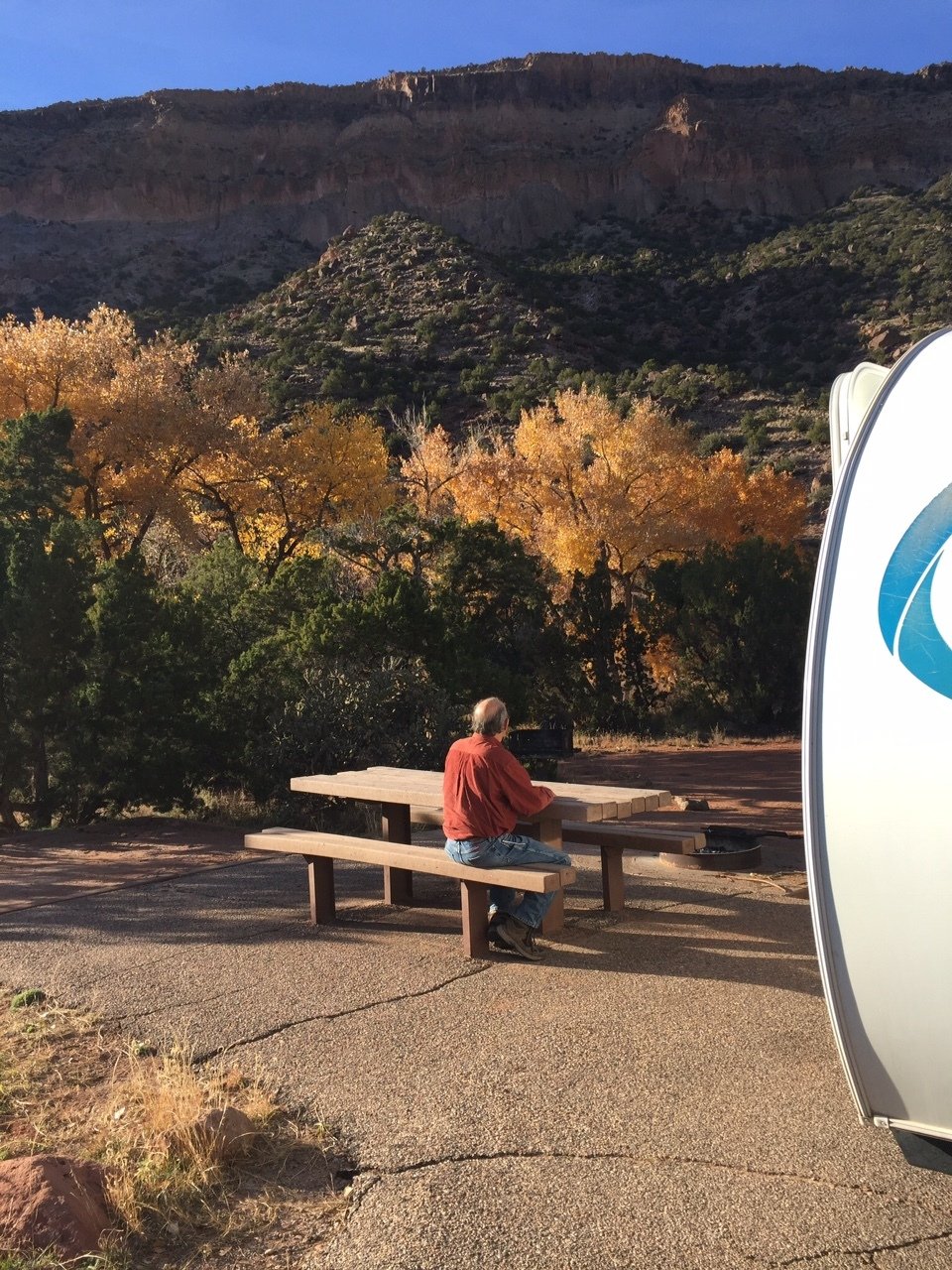 This hike is on our first day of a 3-day trip to do some hiking in the Jemez Mountains. Having just a half a day, after driving from Albuquerque and getting the R-Pod set up at the Vista Linda campground, we opted for a short hike to find Jemez Falls. As always, the drive up the Jemez River in San Antonio Canyon is awesome. Many of the cottonwood trees were still in their bright golden suits, and the canyon walls are amazing. Rounding the curve at La Cueva, ’tis another 6 miles to the entrance to the Jemez Falls Campground. Proceed to the end of the campground roads (a sign points one ahead to the Falls).