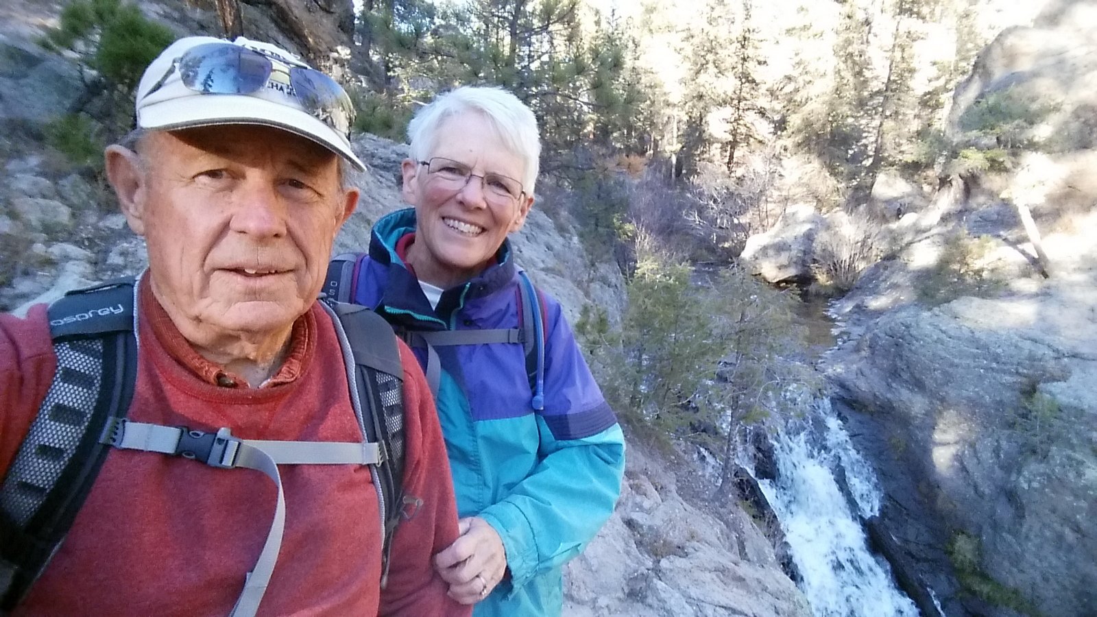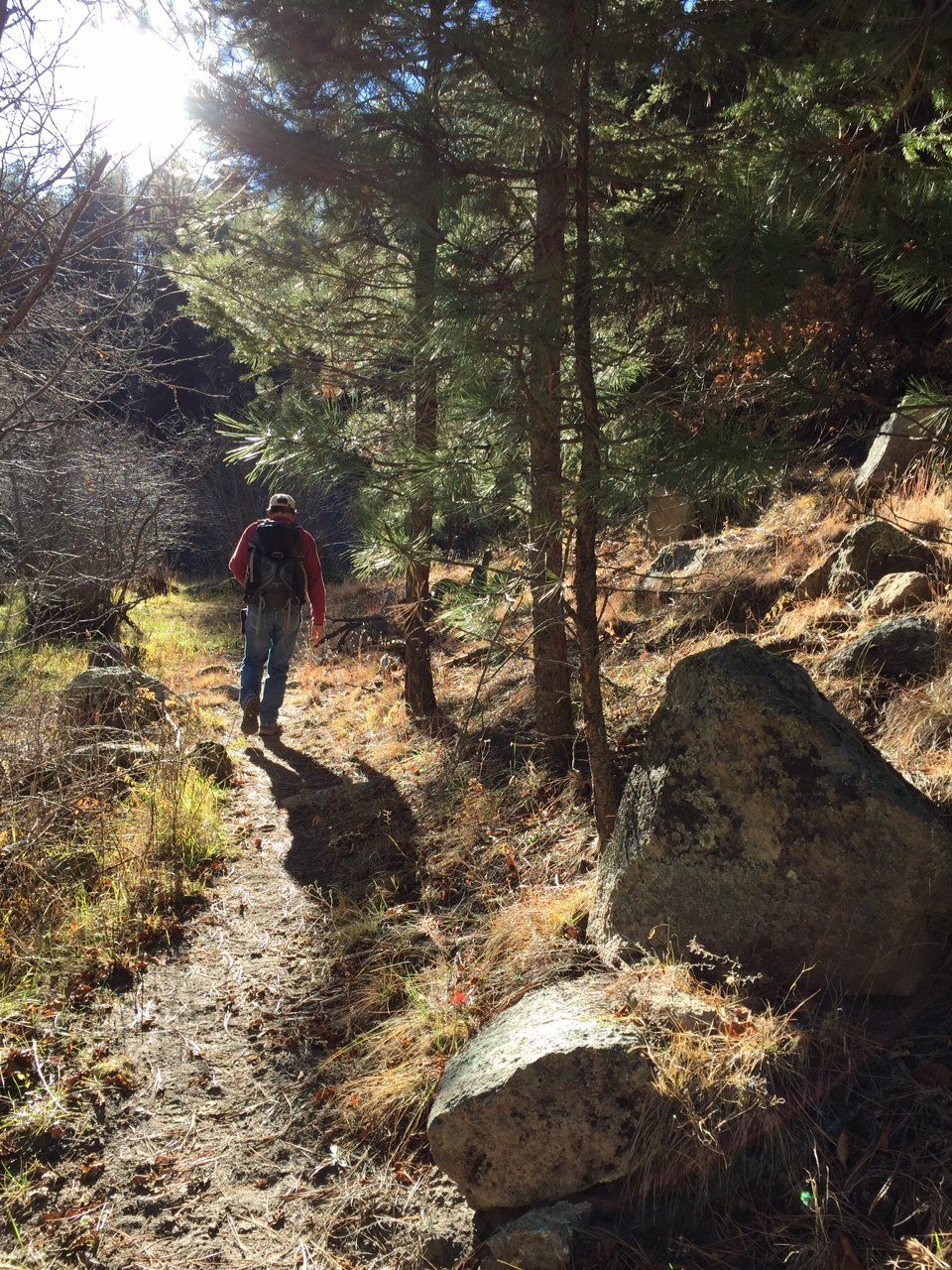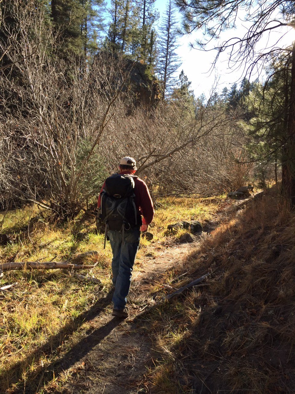 This hike is on our first day of a 3-day trip to do some hiking in the Jemez Mountains. Having just a half a day, after driving from Albuquerque and getting the R-Pod set up at the Vista Linda campground, we opted for a short hike to find Jemez Falls. As always, the drive up the Jemez River in San Antonio Canyon is awesome. Many of the cottonwood trees were still in their bright golden suits, and the canyon walls are amazing. Rounding the curve at La Cueva, ’tis another 6 miles to the entrance to the Jemez Falls Campground. Proceed to the end of the campground roads (a sign points one ahead to the Falls).