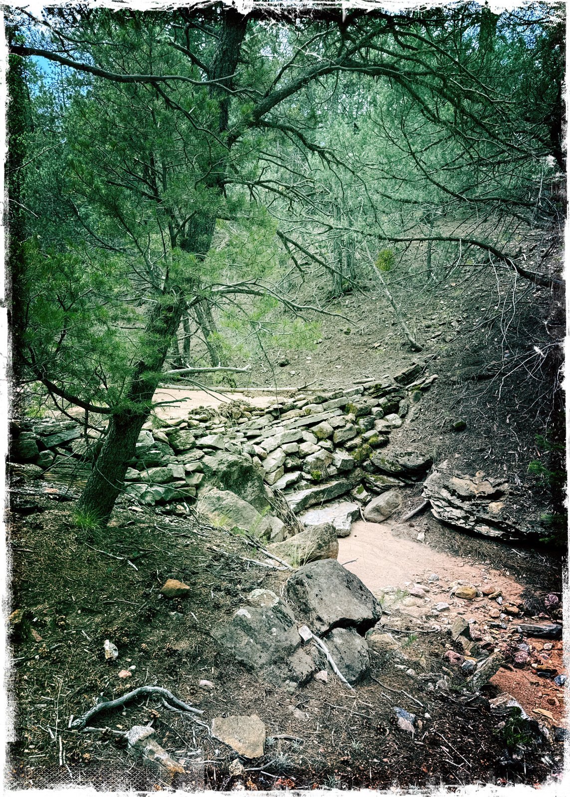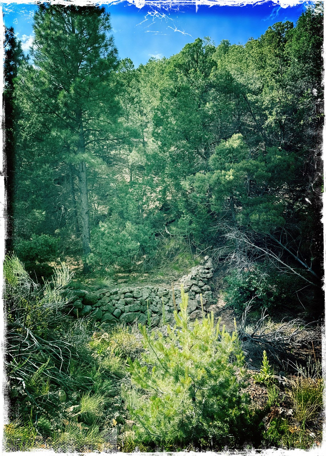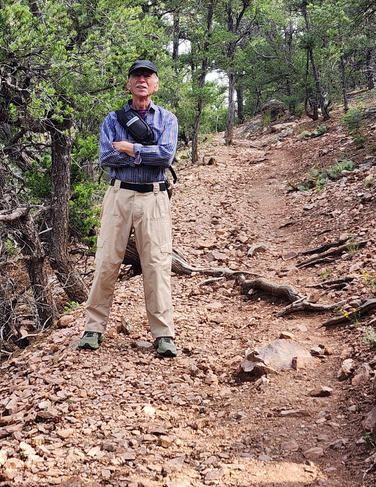 Yes, we made this hike – Little Tesuque-Carol’s-Juan Trails – back in 2016, hiking the loop clockwise and extending the trail further to the intersection with the Winsor Trail. This time, we didn’t have a plan, so .. we started down Little Tesuque Creek (it was running high, overflowing the regular track in some places). Three hundred yards on, we came to a wye in the trail – to the left continue down the Creek, or .. we turned to the right onto the Juan Trail. Immediately we were climbing up a steep sometimes rocky trail, 250 feet in four tenths of a mile (average slope 13%). This was the toughest part of the hike.